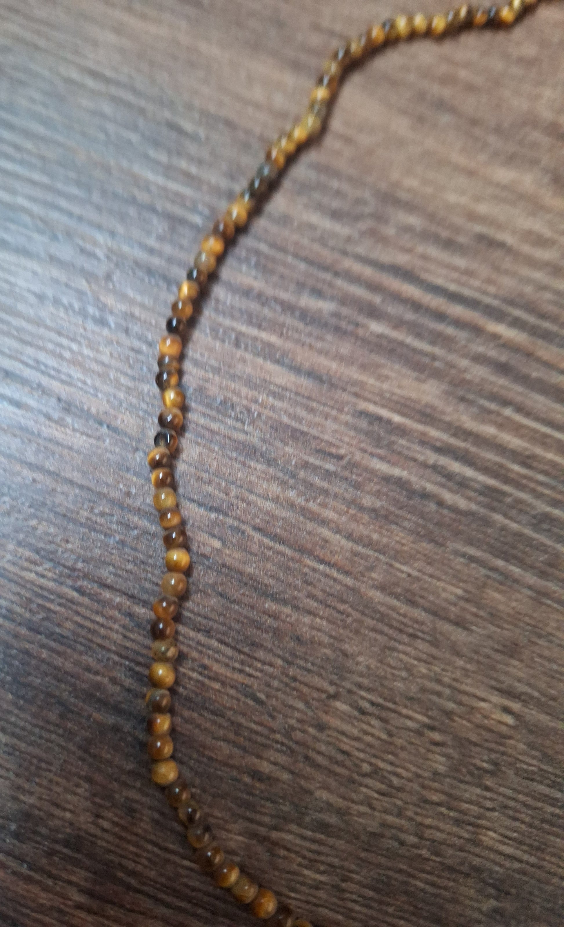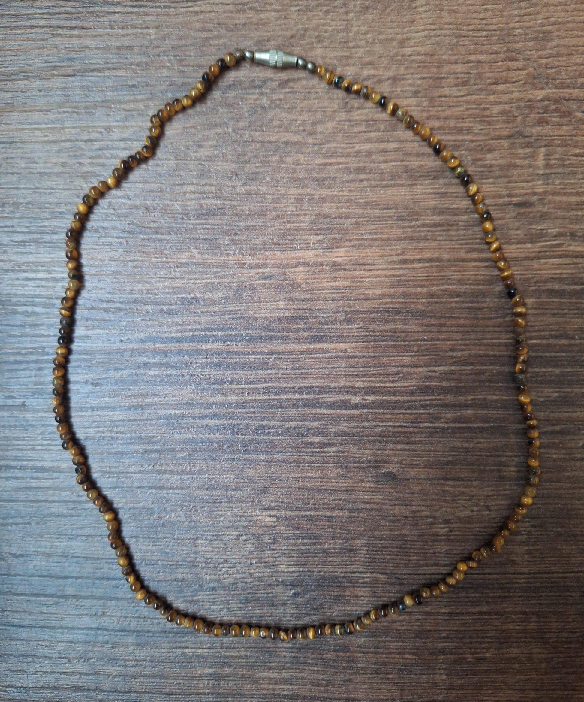 Vintage necklace with small tiger's eye beads. Short model necklace, 44 centimeters length, with a screw closure. The tiger's eye beads have a diameter of 2 millimeters.