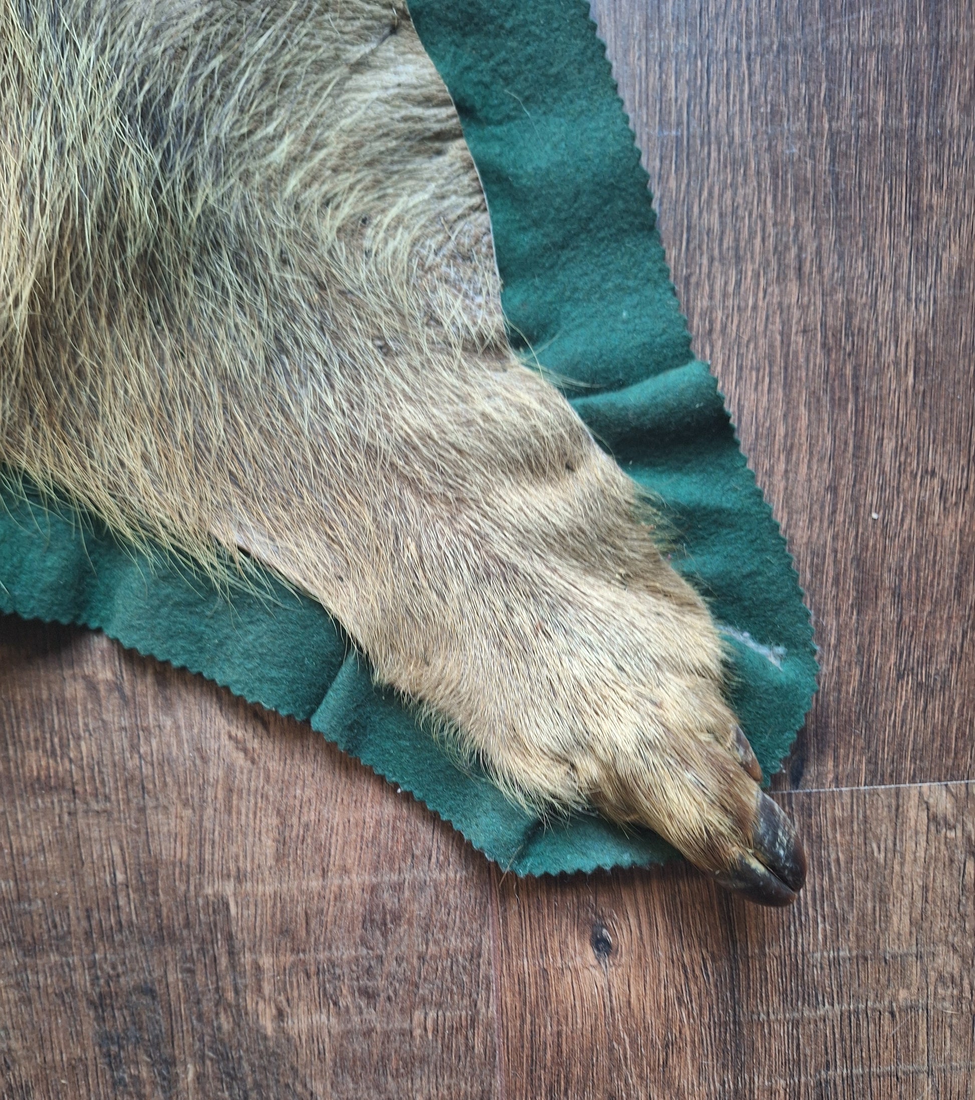 Vintage preparation of a wild boar hide, attached to a backing of jute and green felt fabric.