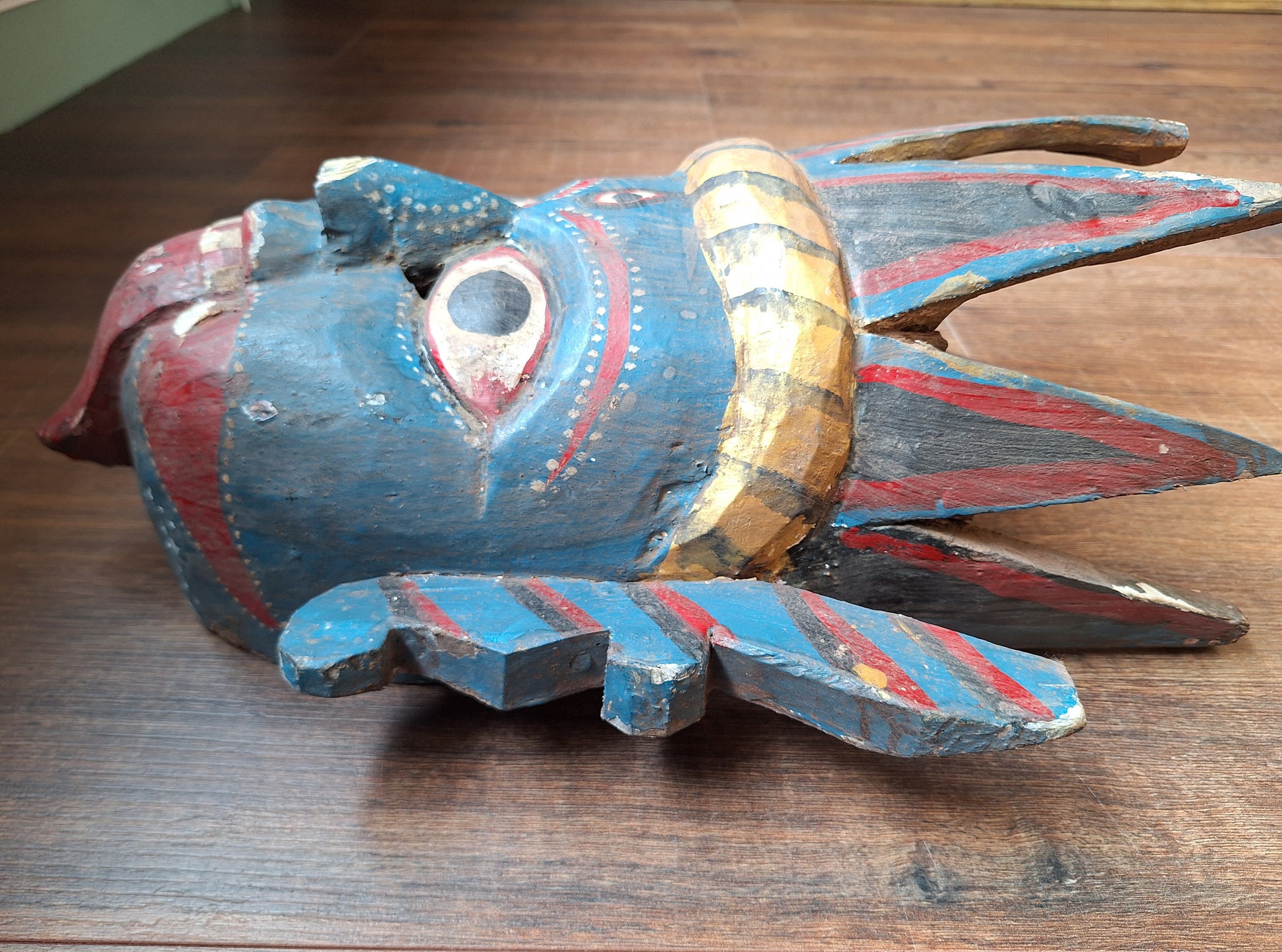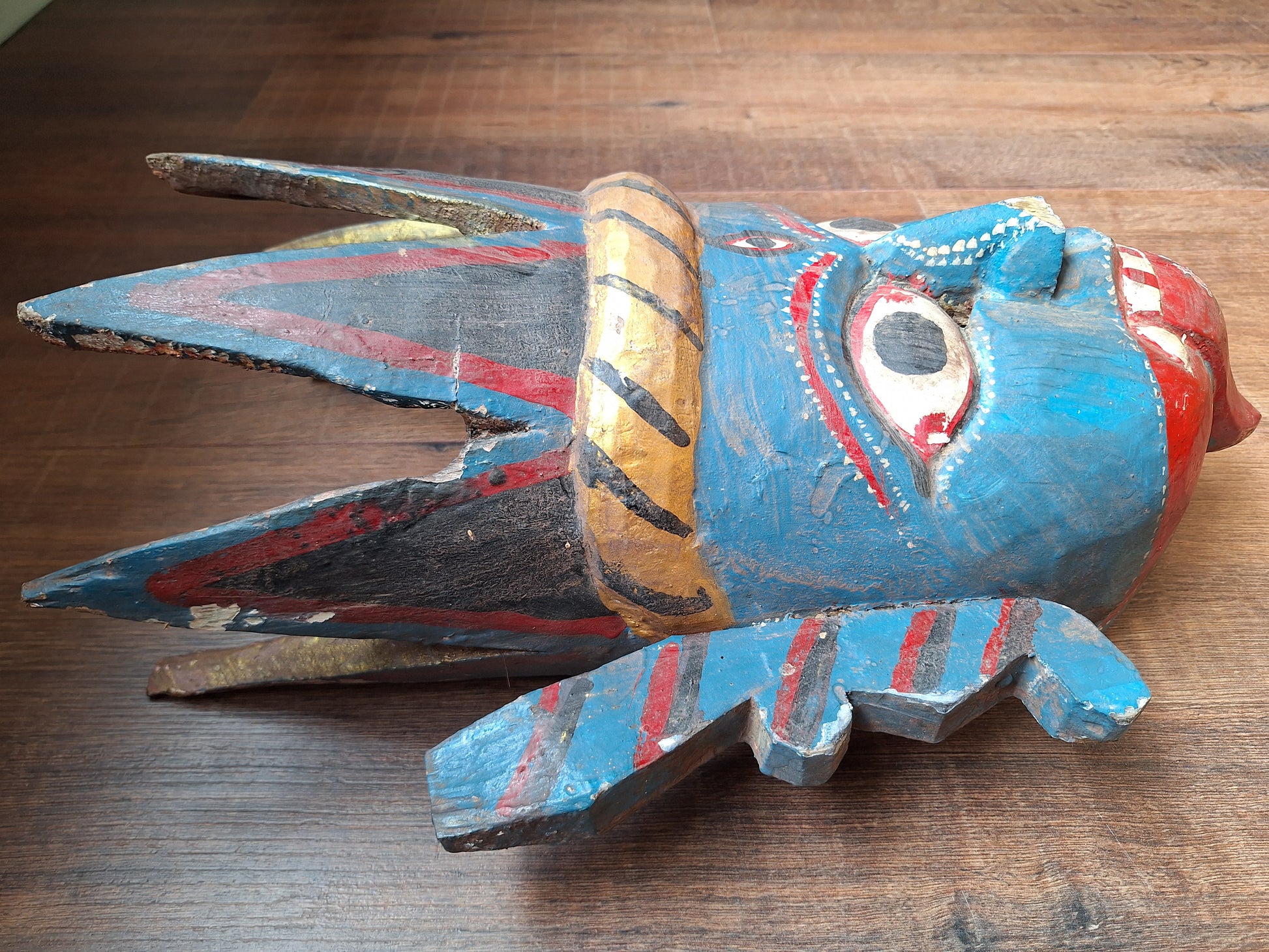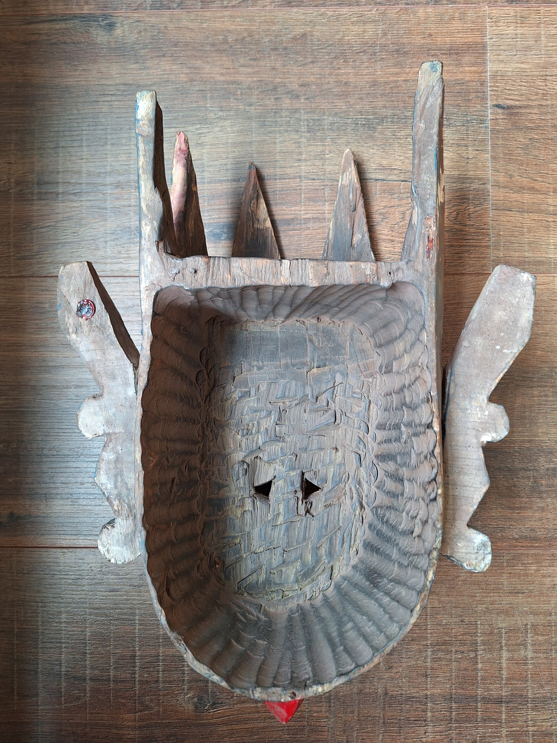 This mask has been a wallhanging object before, using a simple wallhanging system with some nails and cord. This system is not in good condition anymore, so before installing it on your wall again, you might need to make a new one.