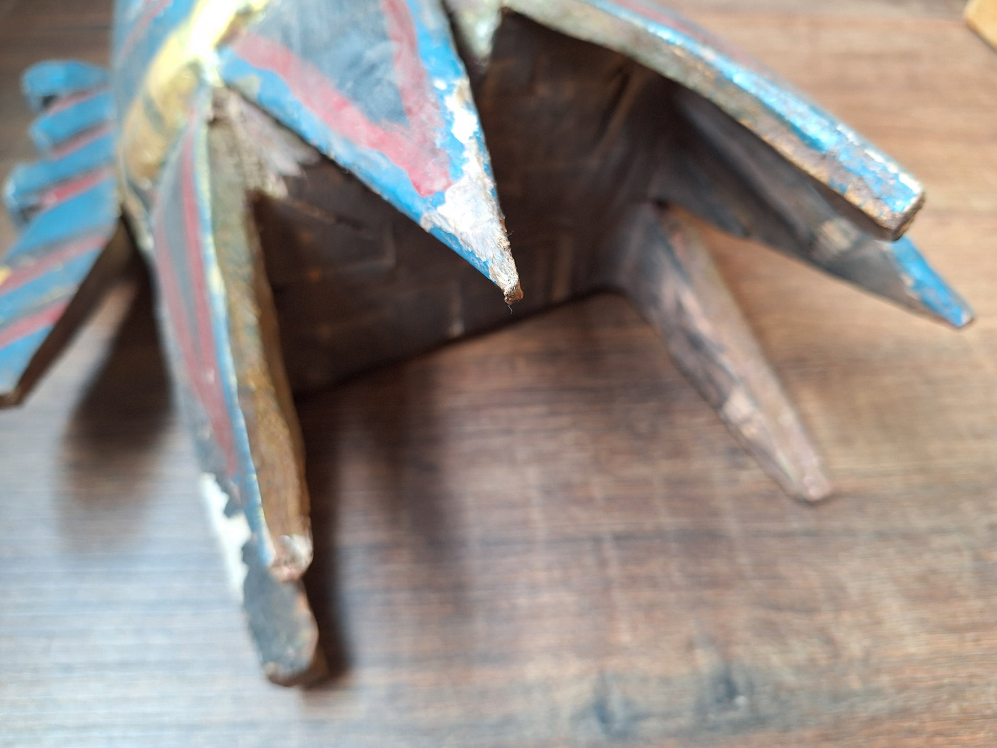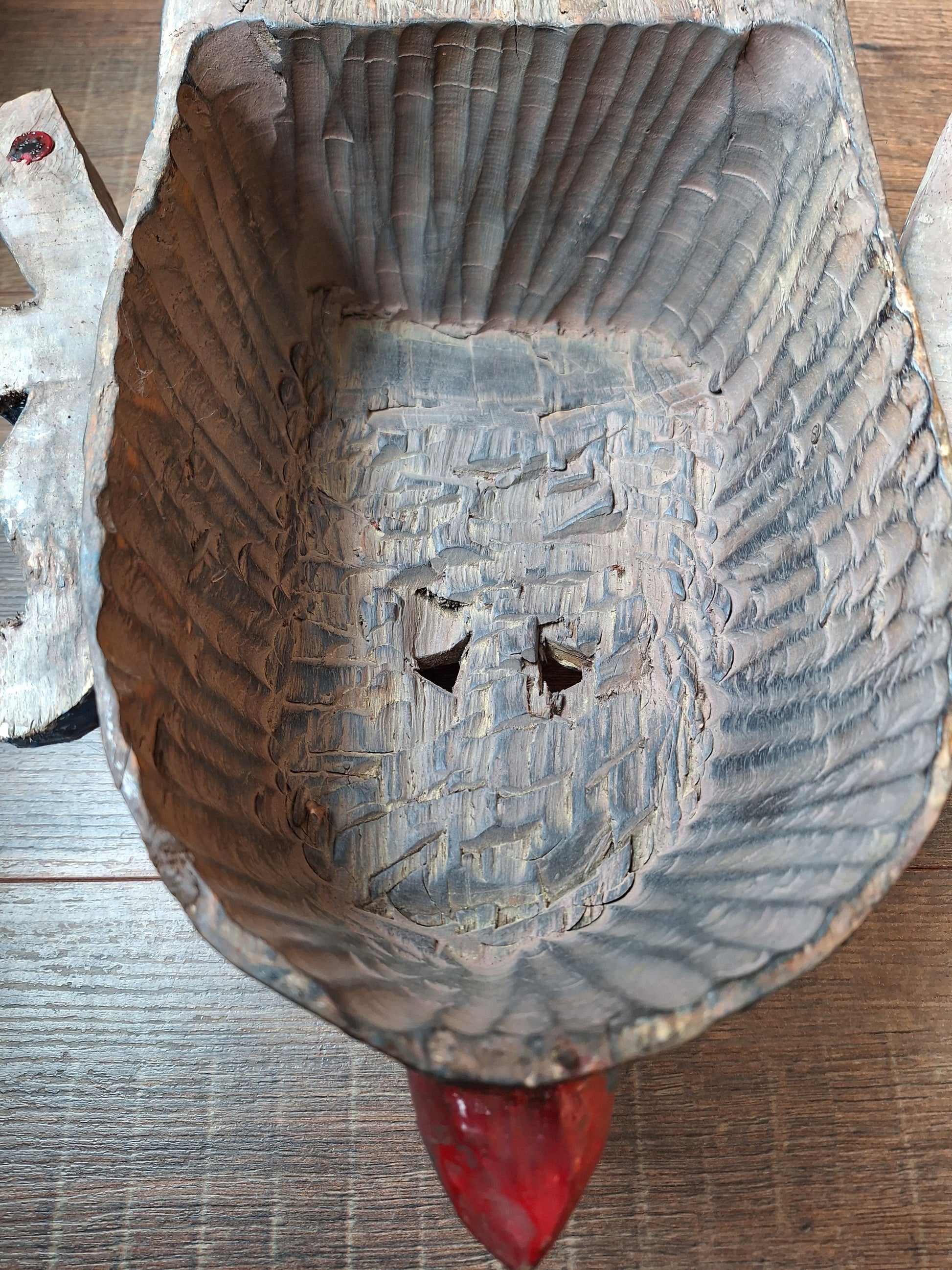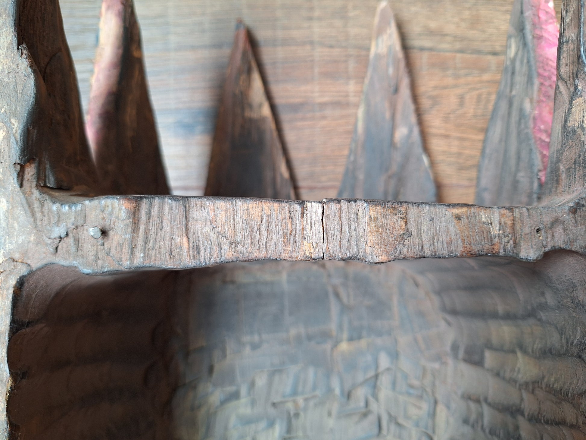 This mask has been a wallhanging object before, using a simple wallhanging system with some nails and cord. This system is not in good condition anymore, so before installing it on your wall again, you might need to make a new one.