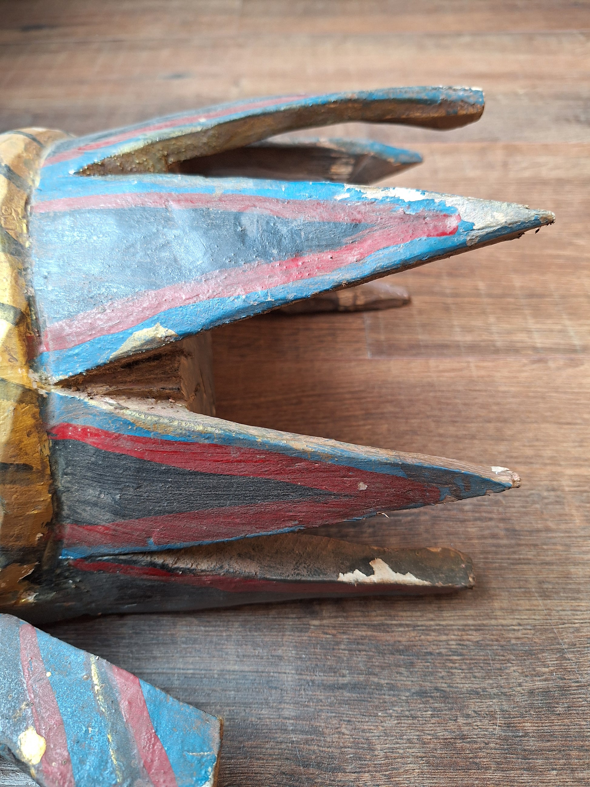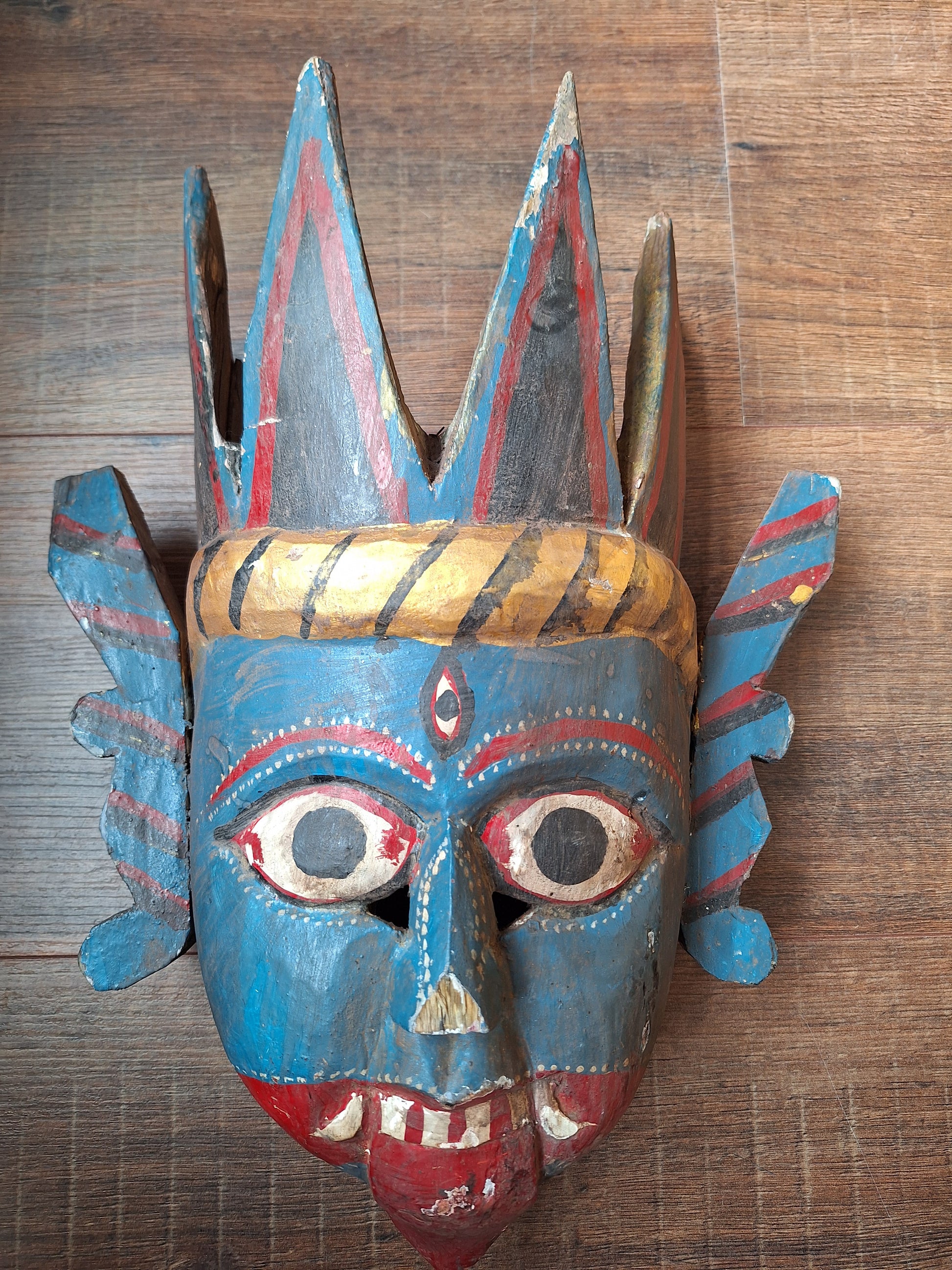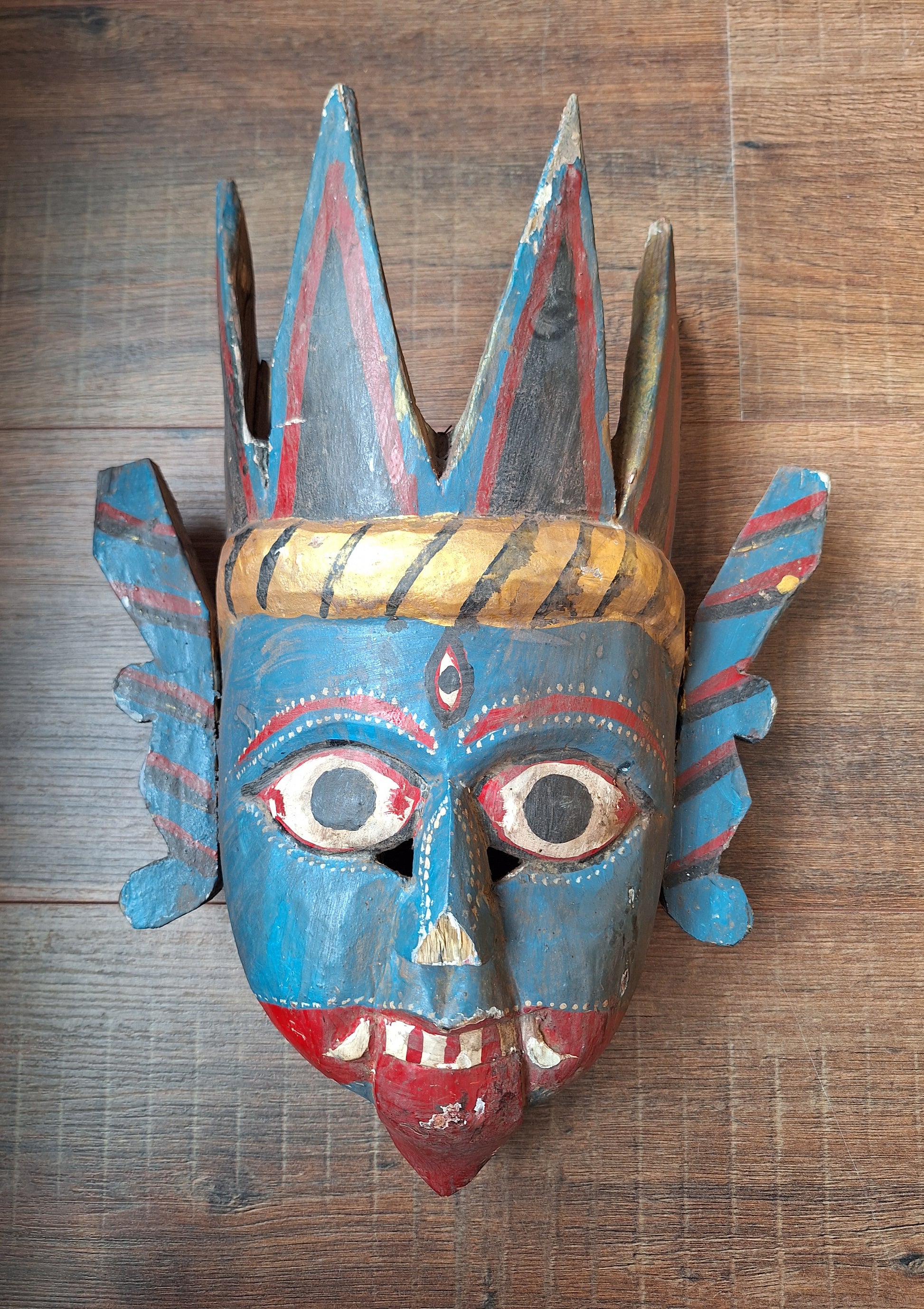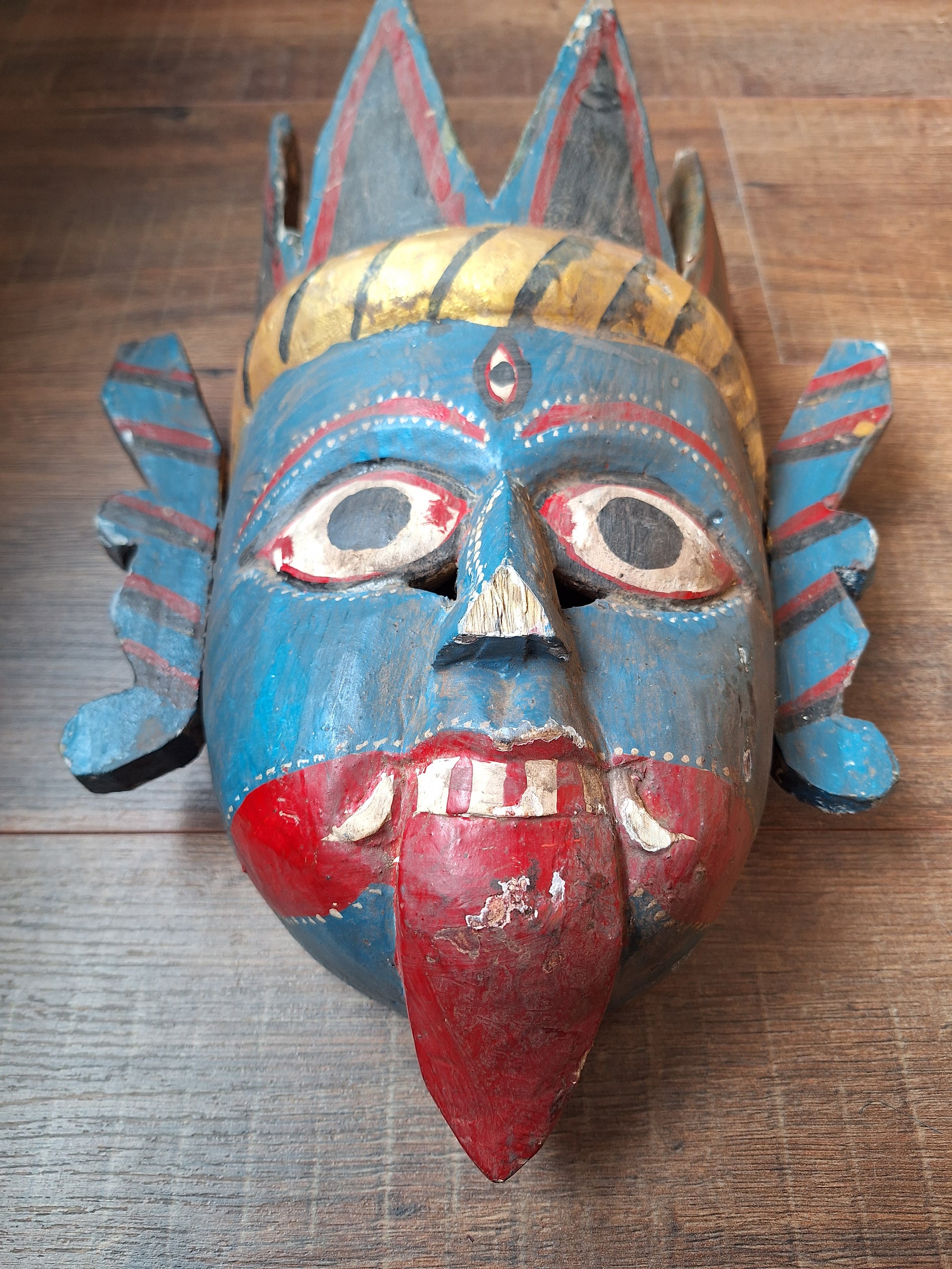 This impressive wooden Kali mask comes from Nepal. Sizes are approximately 41 centimeters high and 29 centimeters wide. Being from vintage origin, it shows some signs of its age and previous usage. As can be seen on the pictures, this one has some damage to the nose.