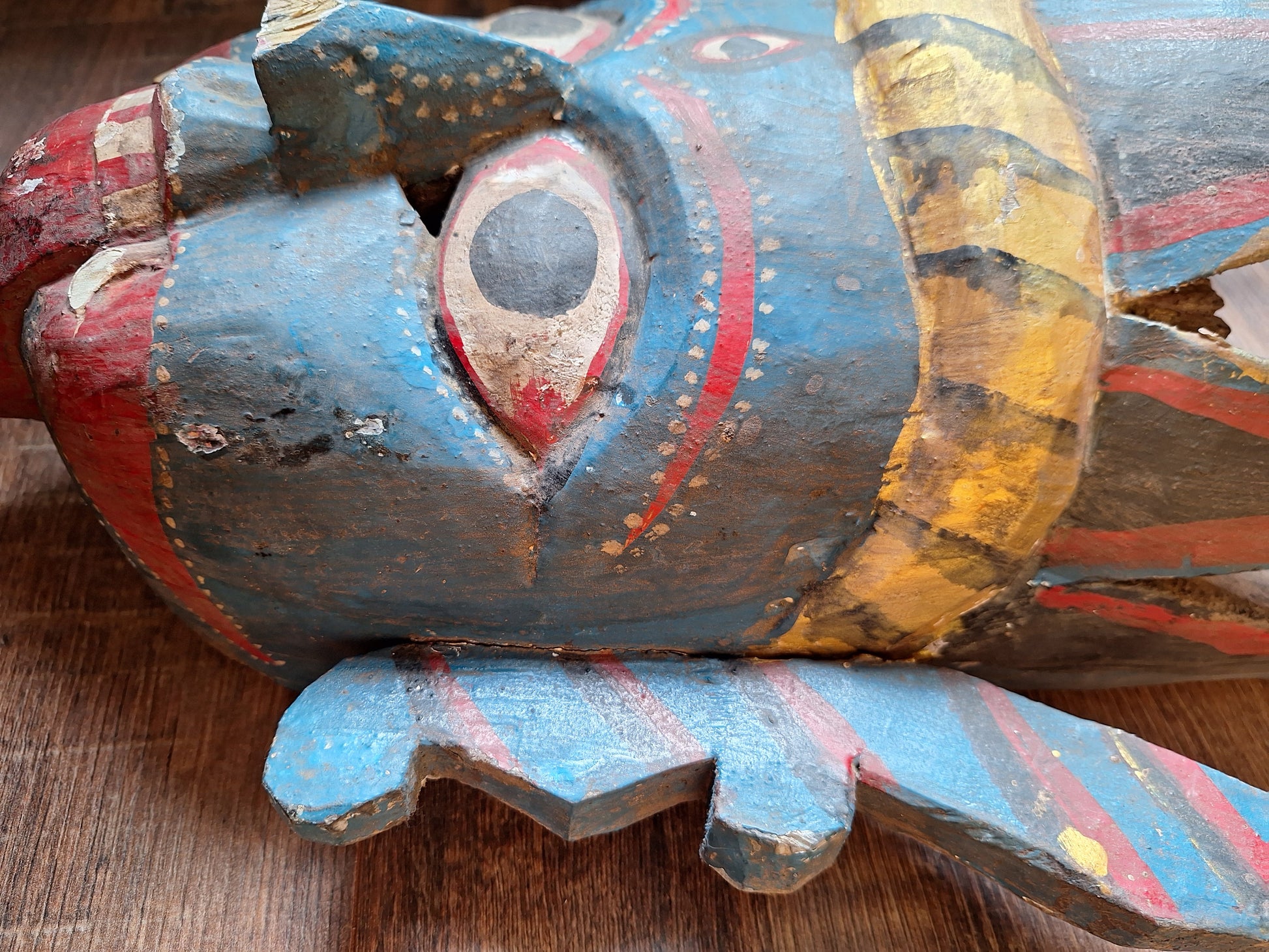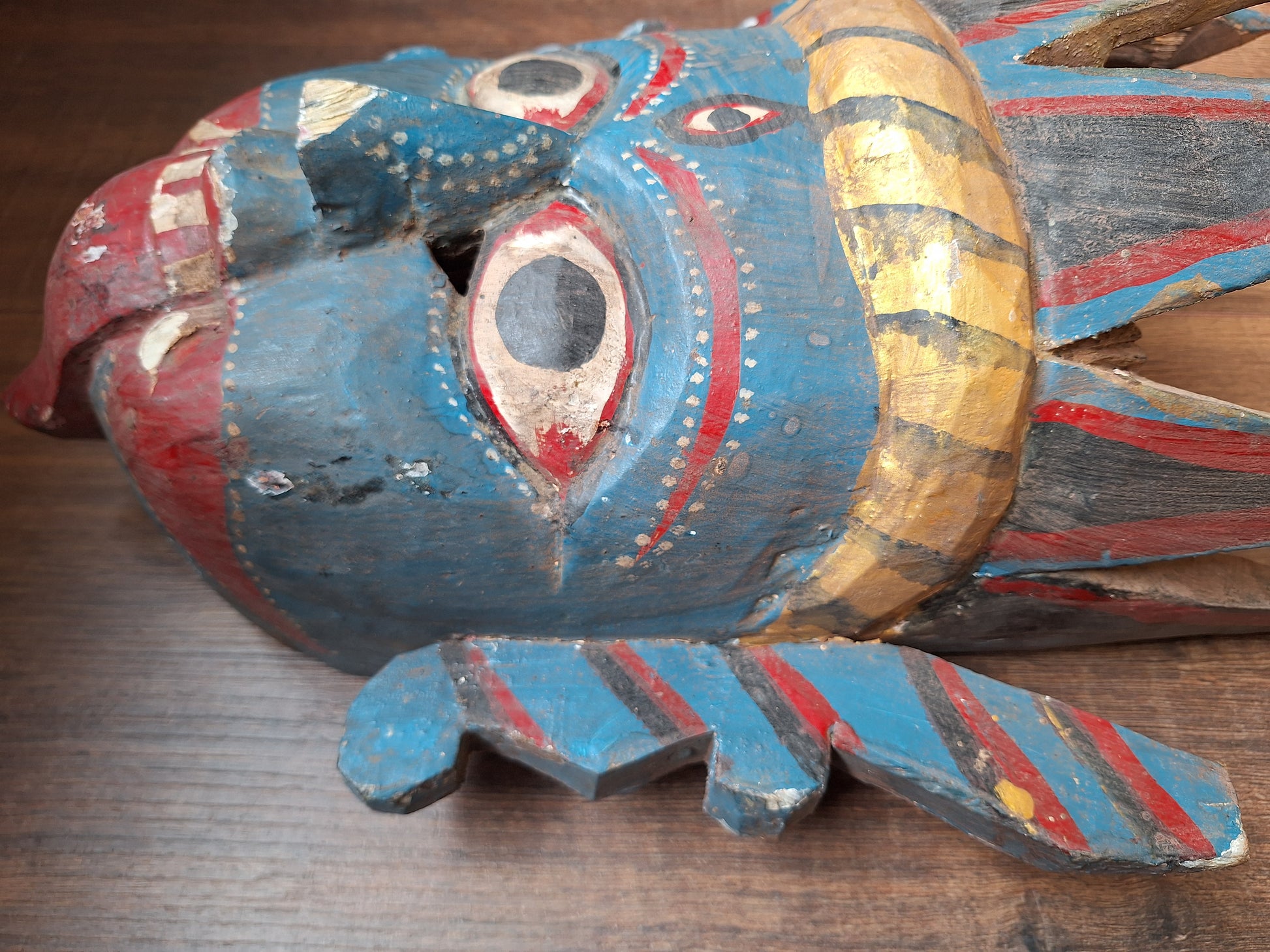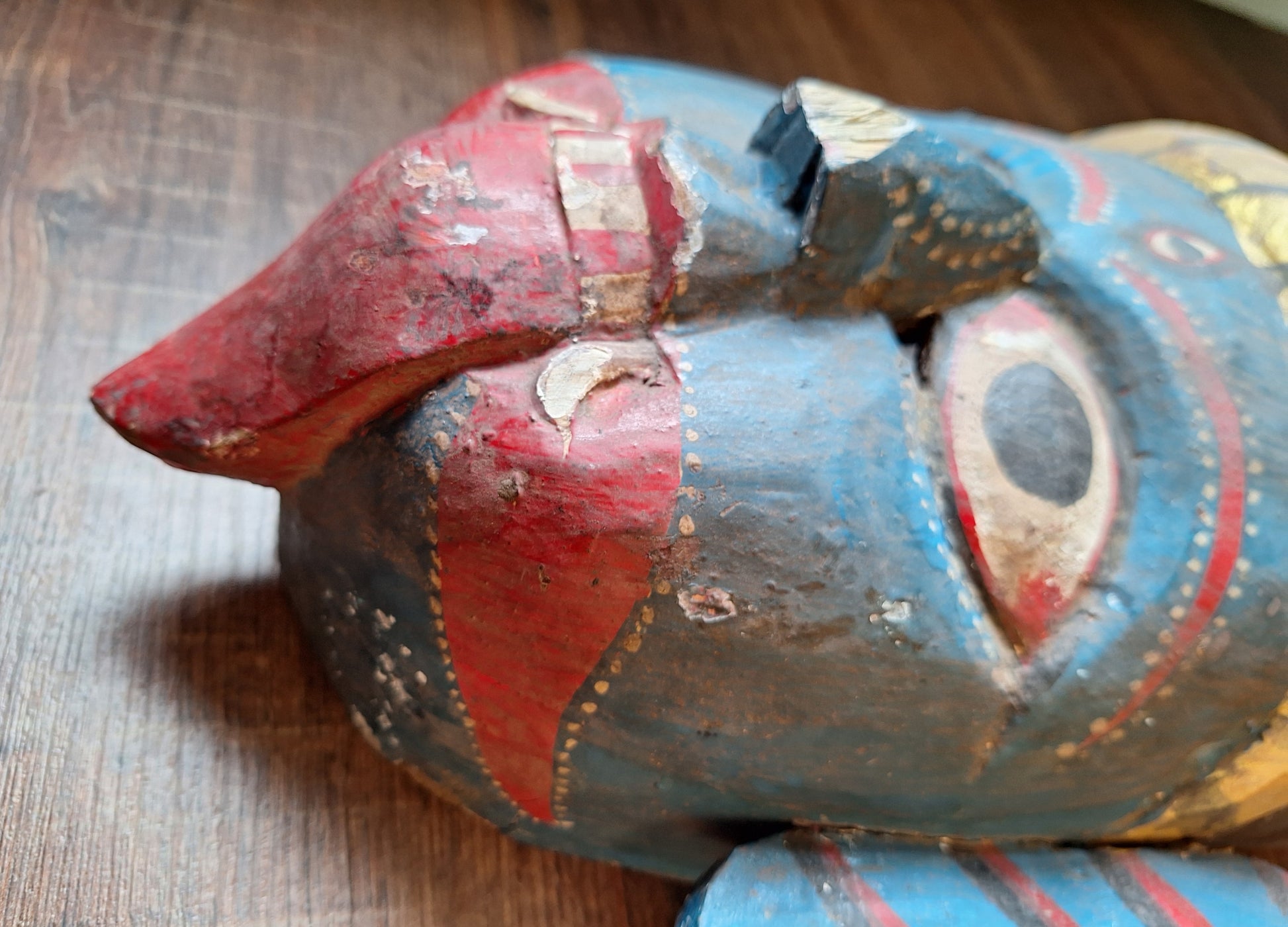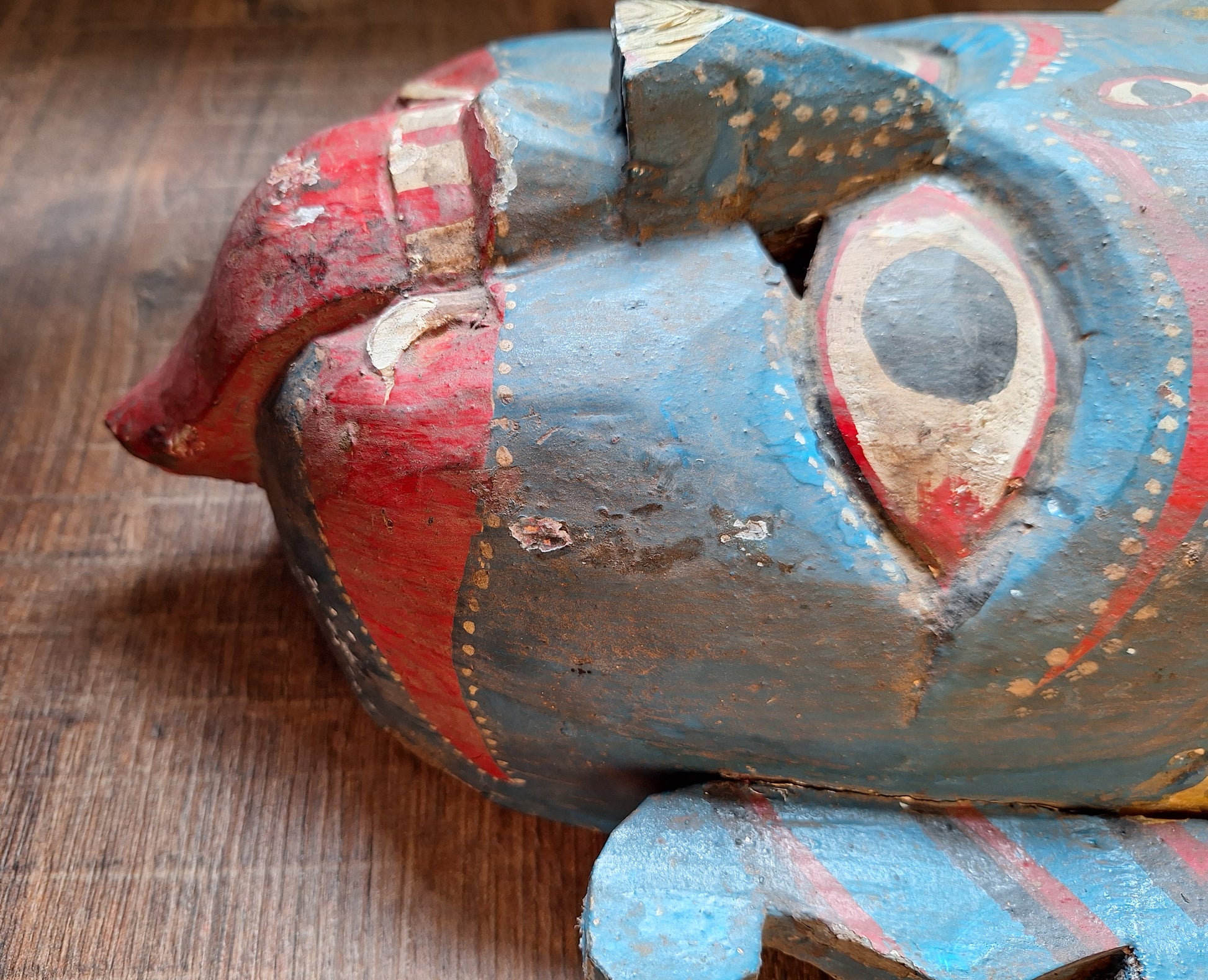 This impressive wooden Kali mask comes from Nepal. Sizes are approximately 41 centimeters high and 29 centimeters wide. Being from vintage origin, it shows some signs of its age and previous usage. As can be seen on the pictures, this one has some damage to the nose.