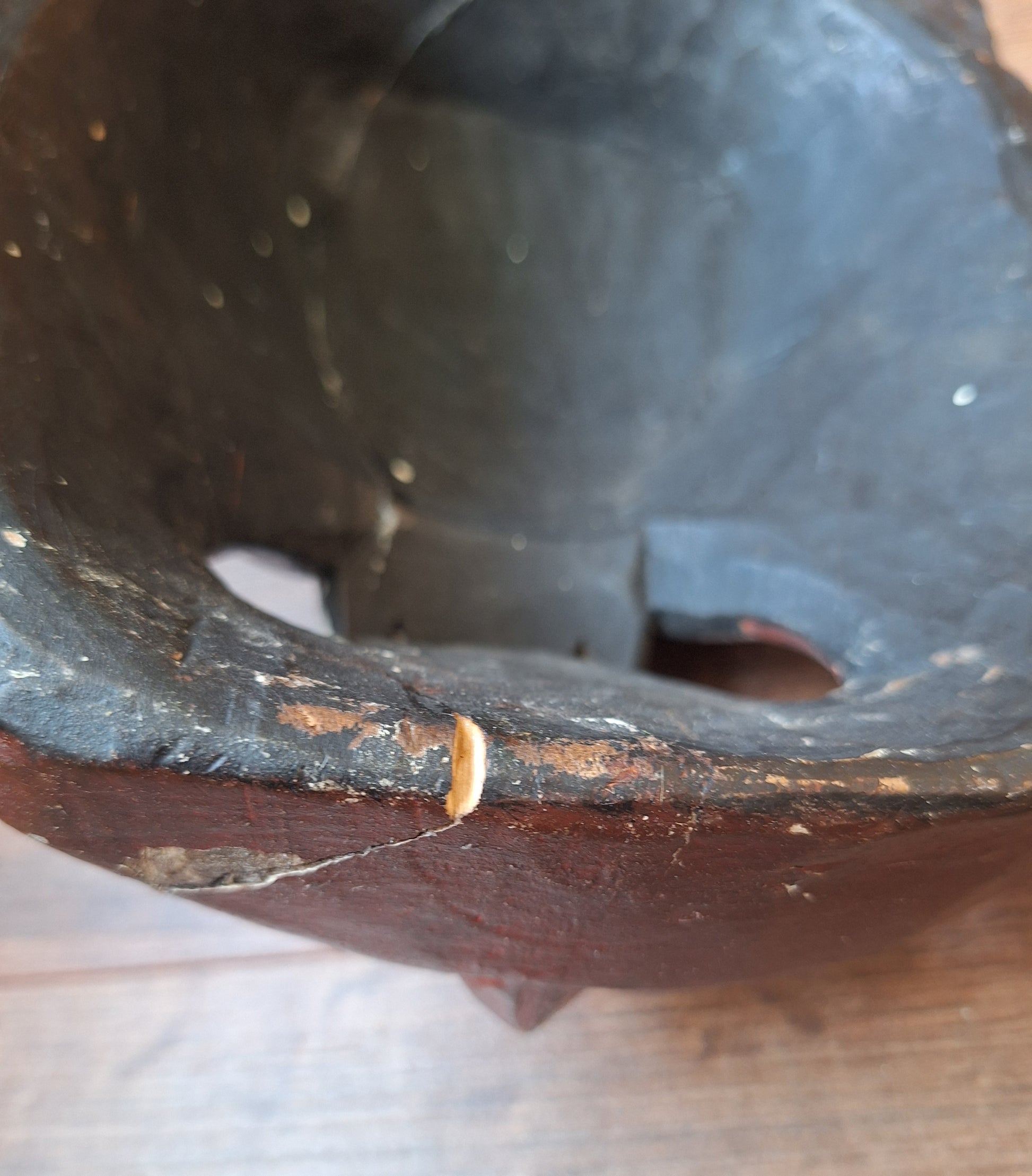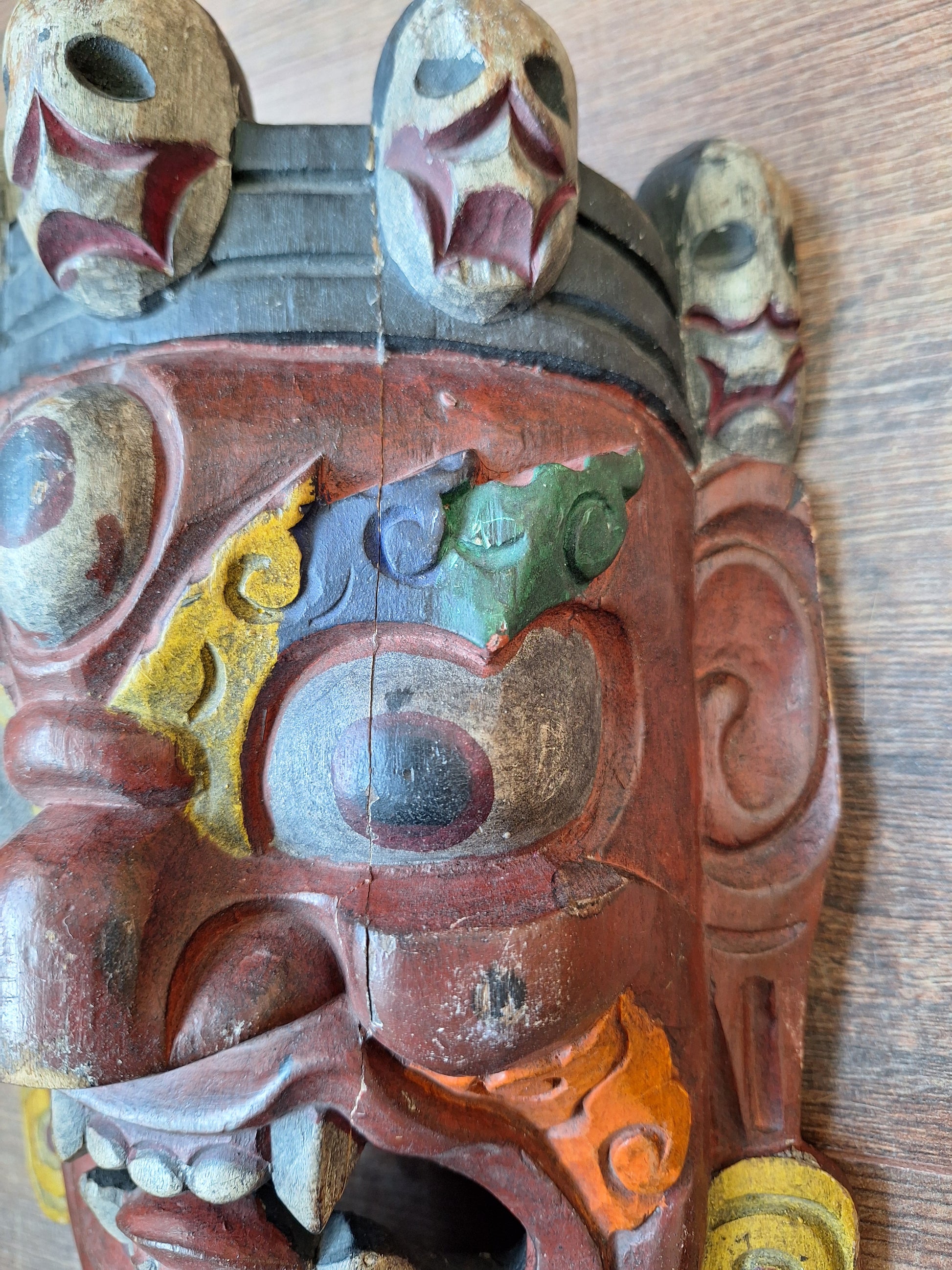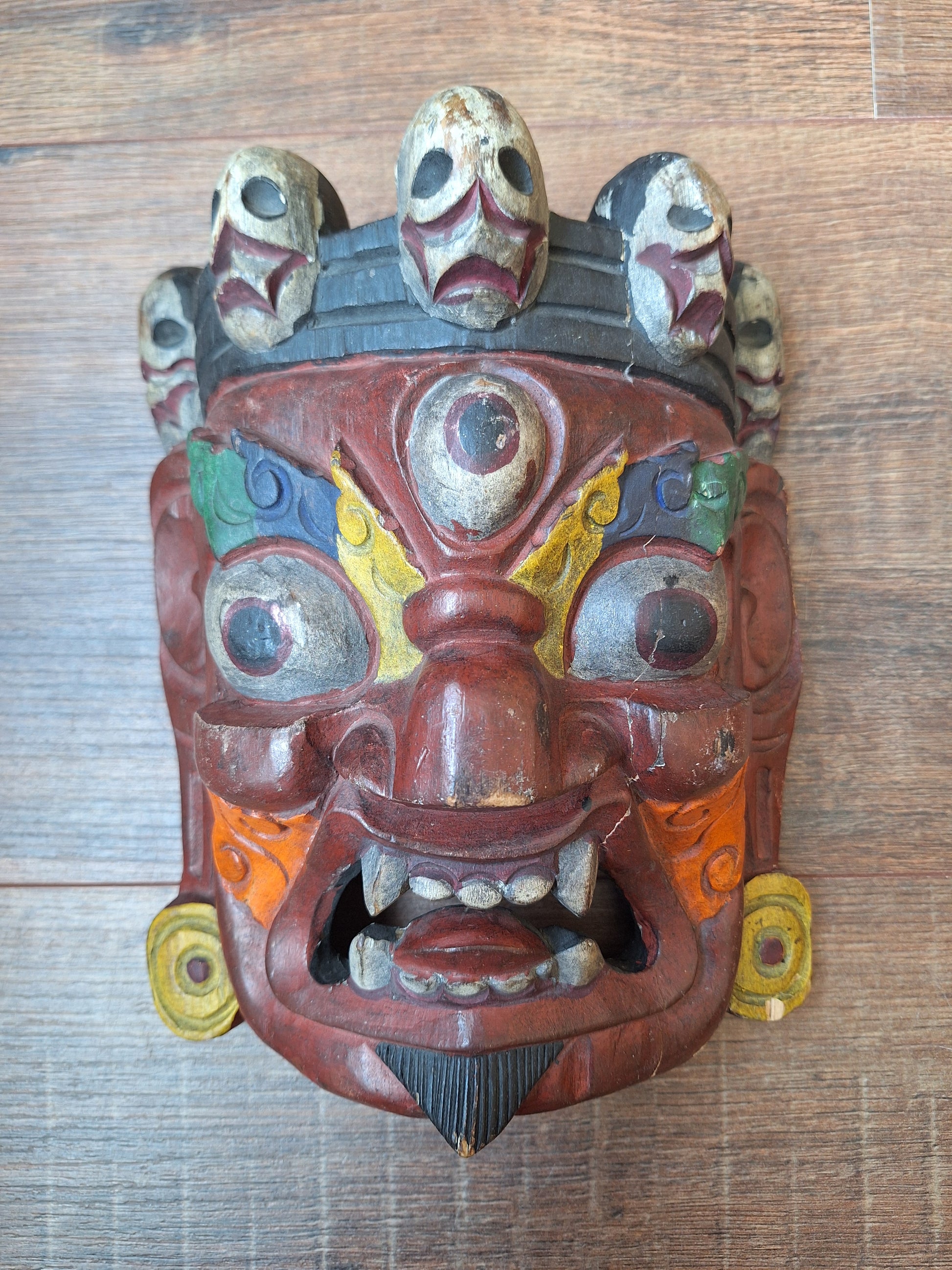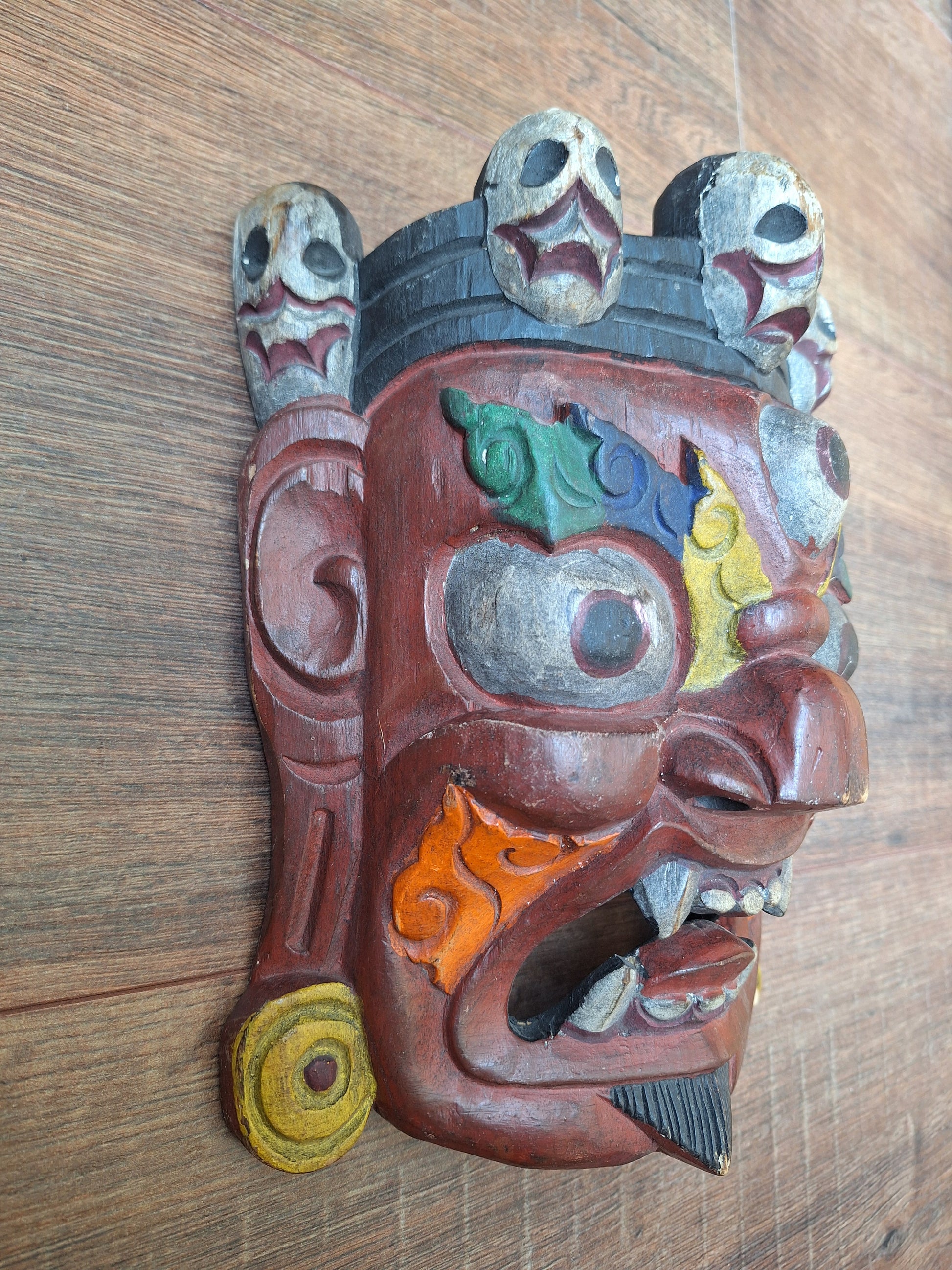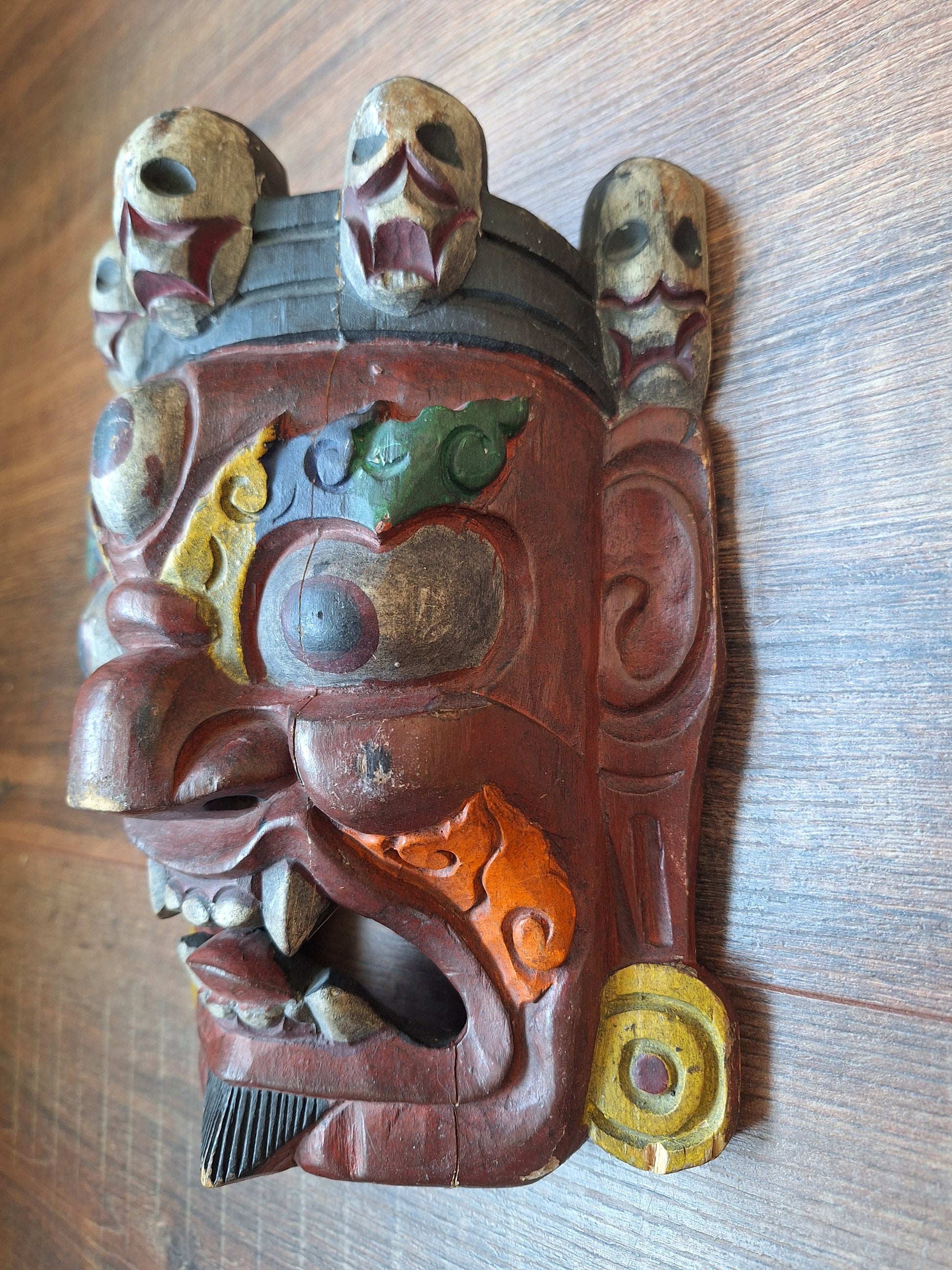 This wooden mask comes from Nepal. Sizes are approximately; 23 centimeters high and 20 centimeters wide. Please note that this mask has been broken at one point in its life and glued back together. On the pictures you can clearly see the fracture line going from top to bottom. For this reason the price for this mask is lower than usual. Please note: it might be better to not use this one as an active spirit house anymore (it could be considered very disrespectful to offer a spirit a damaged home). But of course it could still be very well used for decorational purposes.