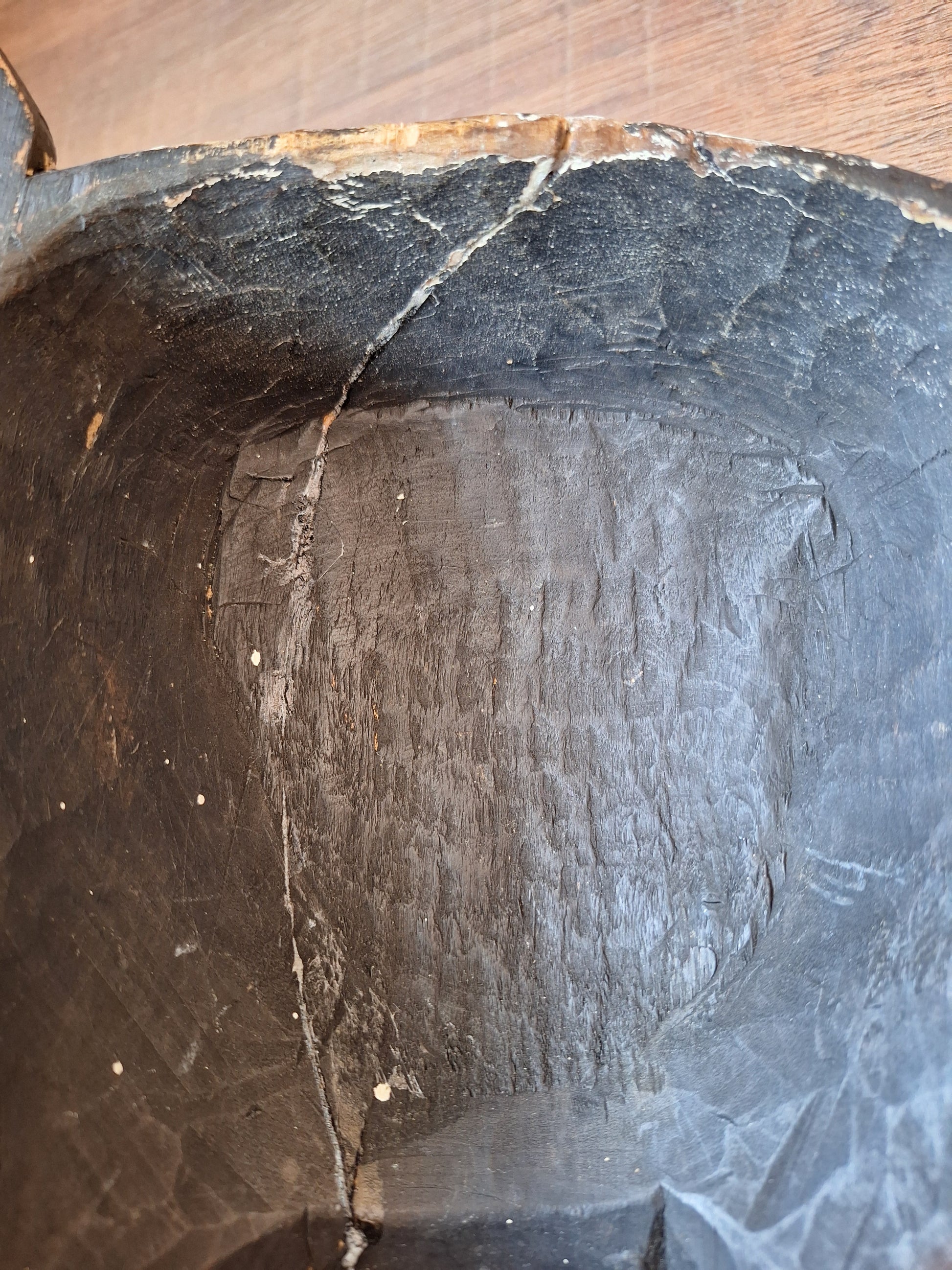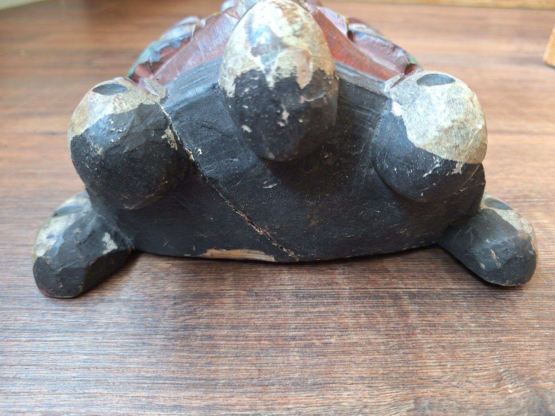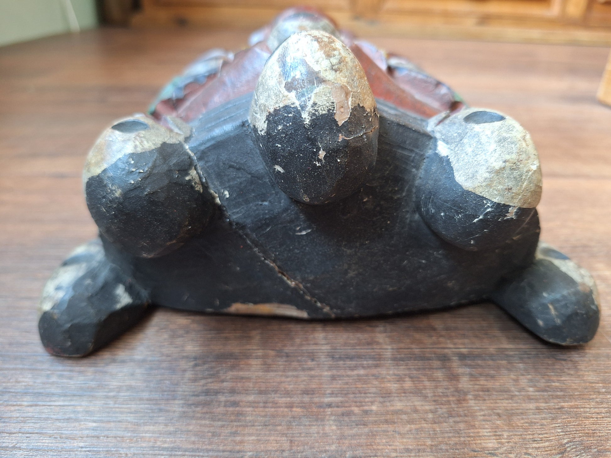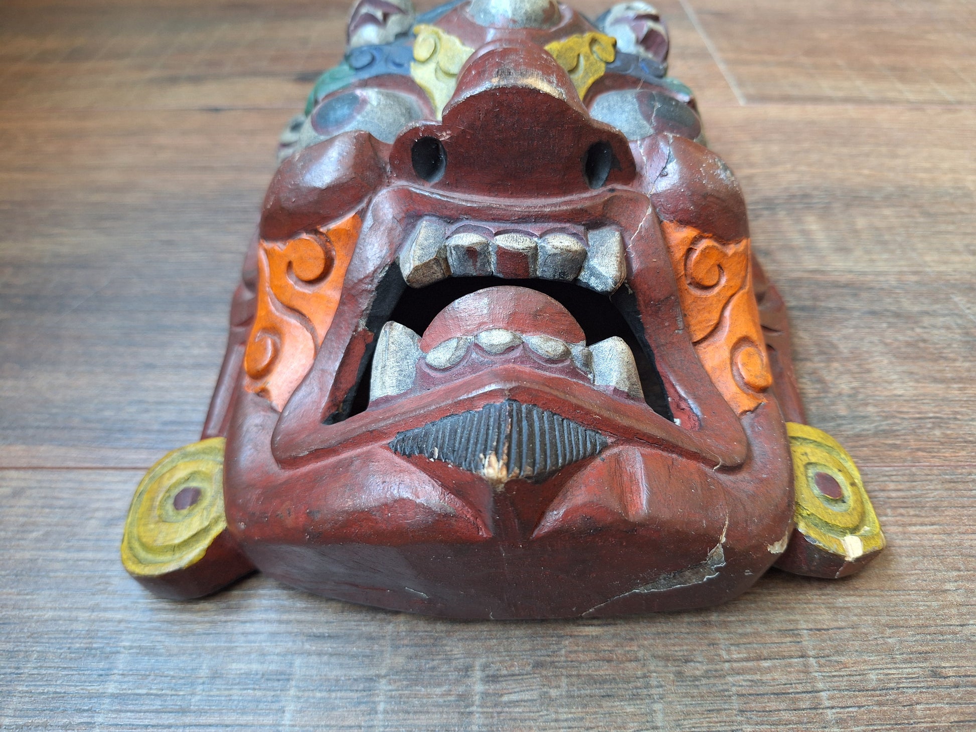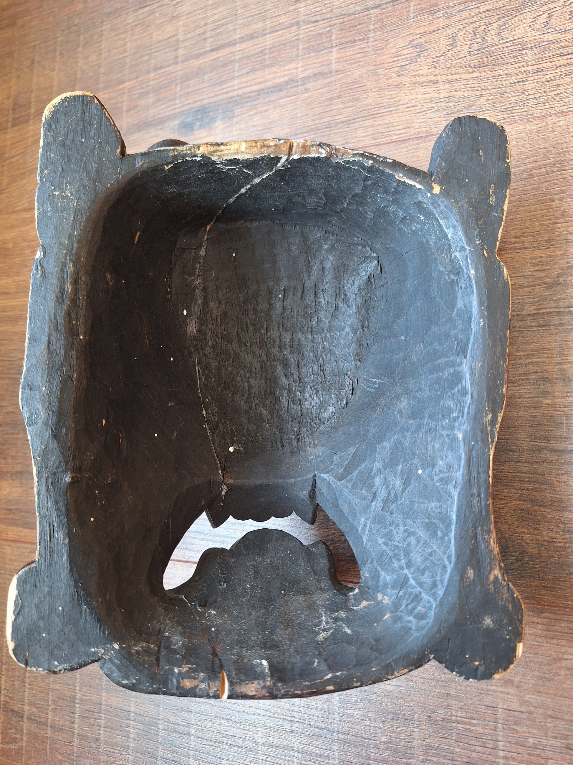 This wooden mask comes from Nepal. Sizes are approximately; 23 centimeters high and 20 centimeters wide. Please note that this mask has been broken at one point in its life and glued back together. On the pictures you can clearly see the fracture line going from top to bottom. For this reason the price for this mask is lower than usual. Please note: it might be better to not use this one as an active spirit house anymore (it could be considered very disrespectful to offer a spirit a damaged home). But of course it could still be very well used for decorational purposes.