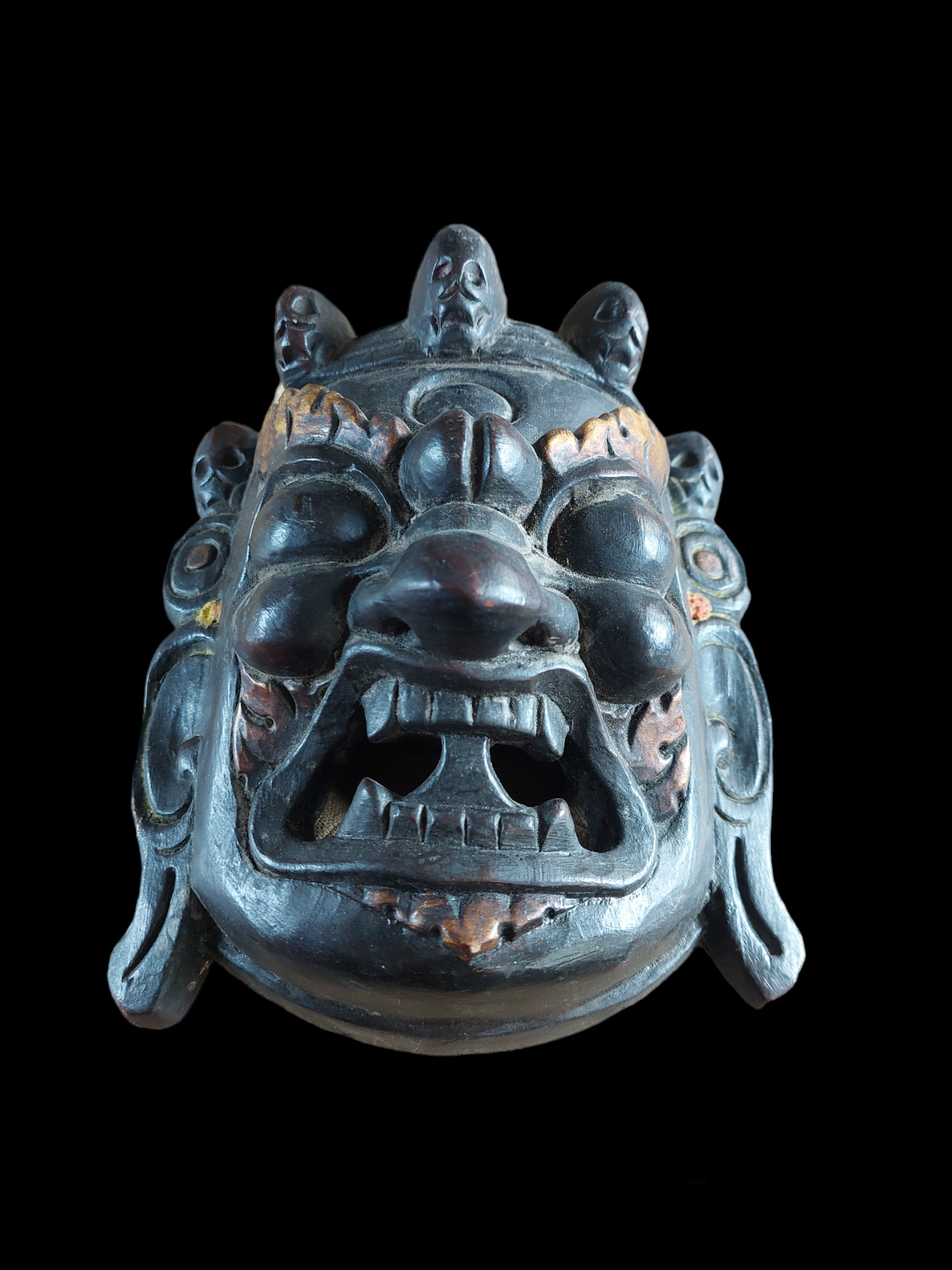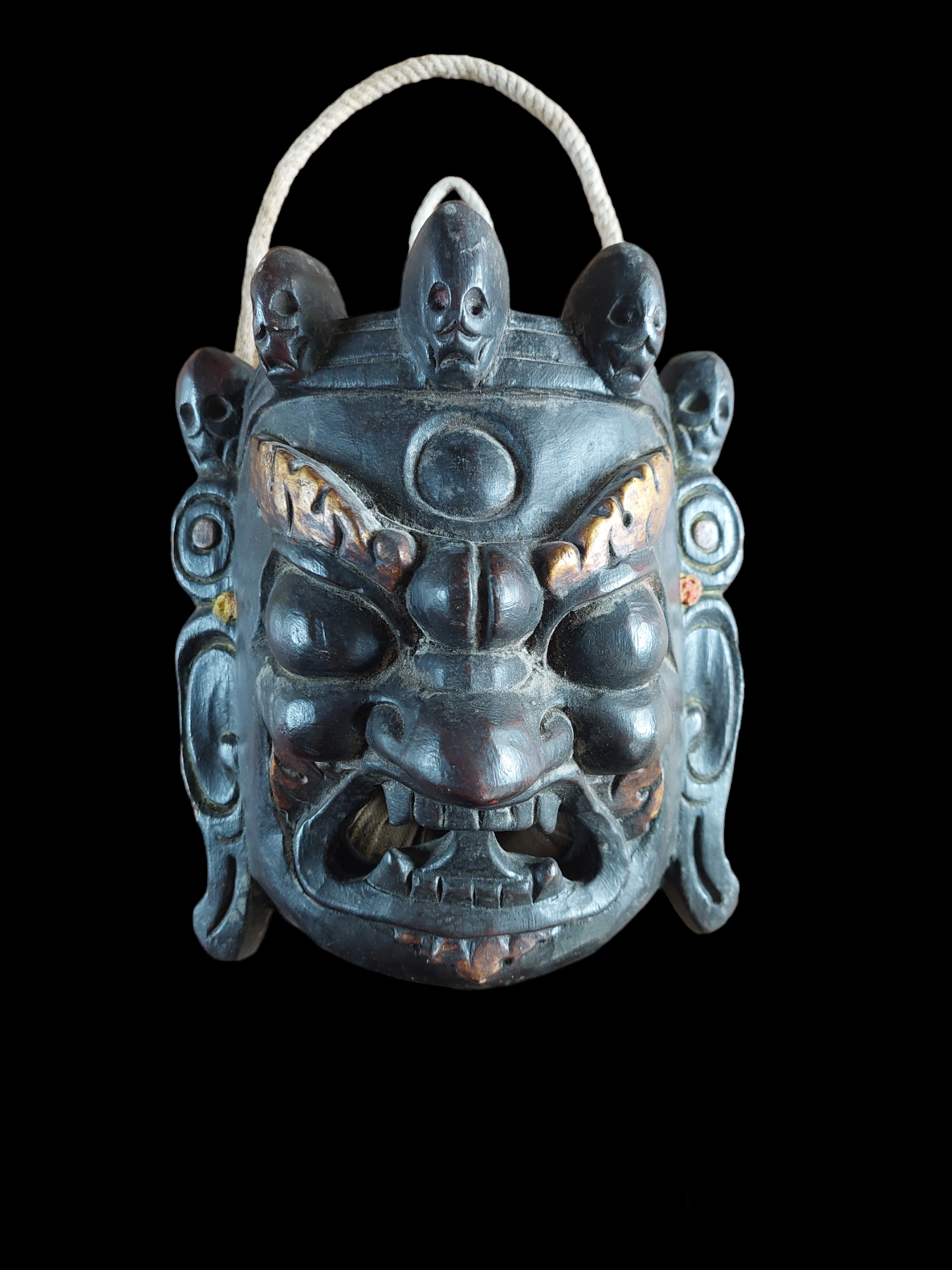 Symbolism that can often be found in depictions of Mahakala is for example; a third eye, representing clear, true vision and insights, not clouded by the distractions and illusions of the human mind and ego. And a crown with five skulls, representing the five 'poisonous delusions': anger, desire, ignorance, jealousy, and pride. And Mahakala is often depicted in black; the total absence of color, in which all colors just disappear, symbolizing the ultimate, absolute truth and his all-embracing, all-encompassing nature.