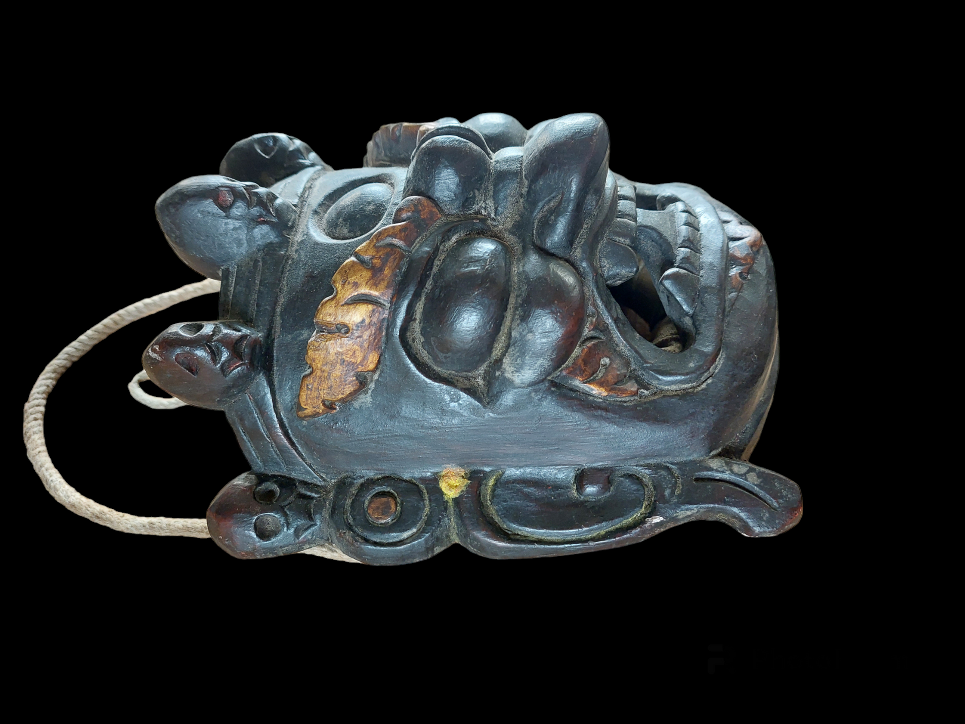 This wooden mask comes from Nepal. Sizes are approximately; 19 centimeters high and 17 centimeters wide. It weighs 385 grams. It has a beautiful dark color with some golden-bronze decorations and is very nicely detailed. In very good condition.