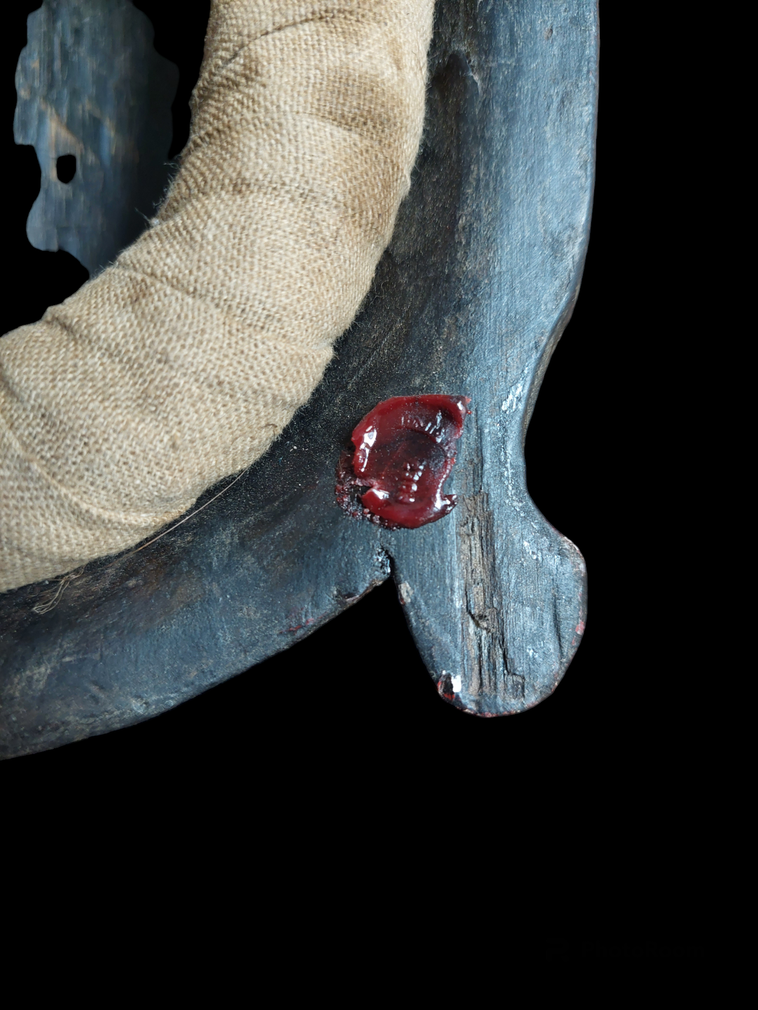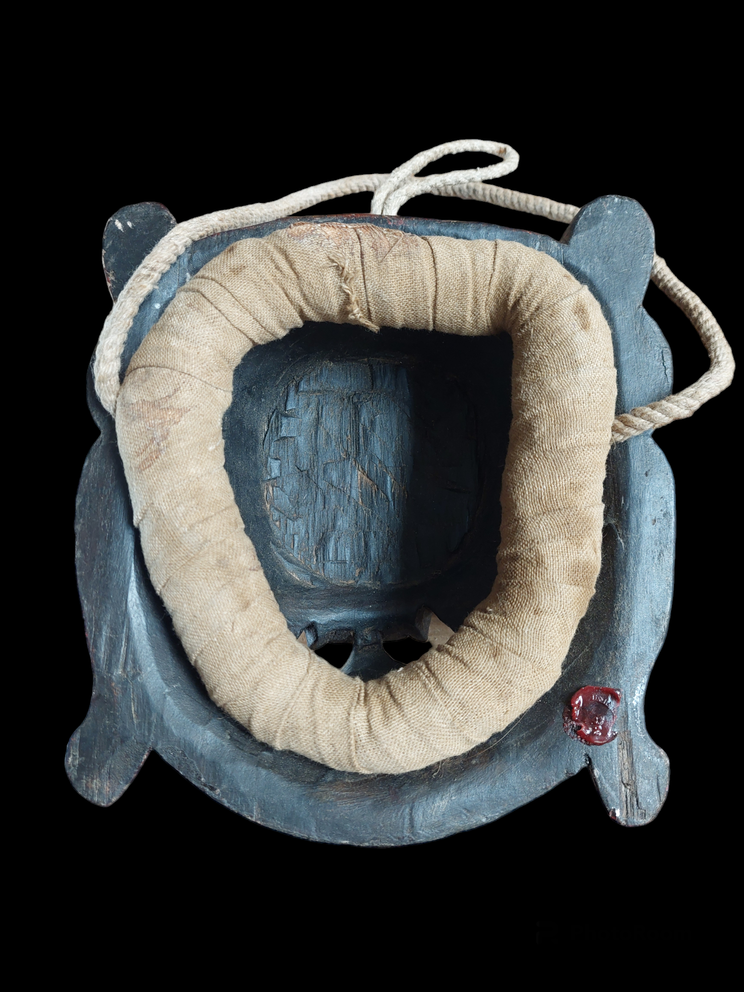 On the backside of the mask, the remnants of an export seal from the Nepalese Bureau of Cultural Relics can be seen, indicating the authenticity and heritage of this item.