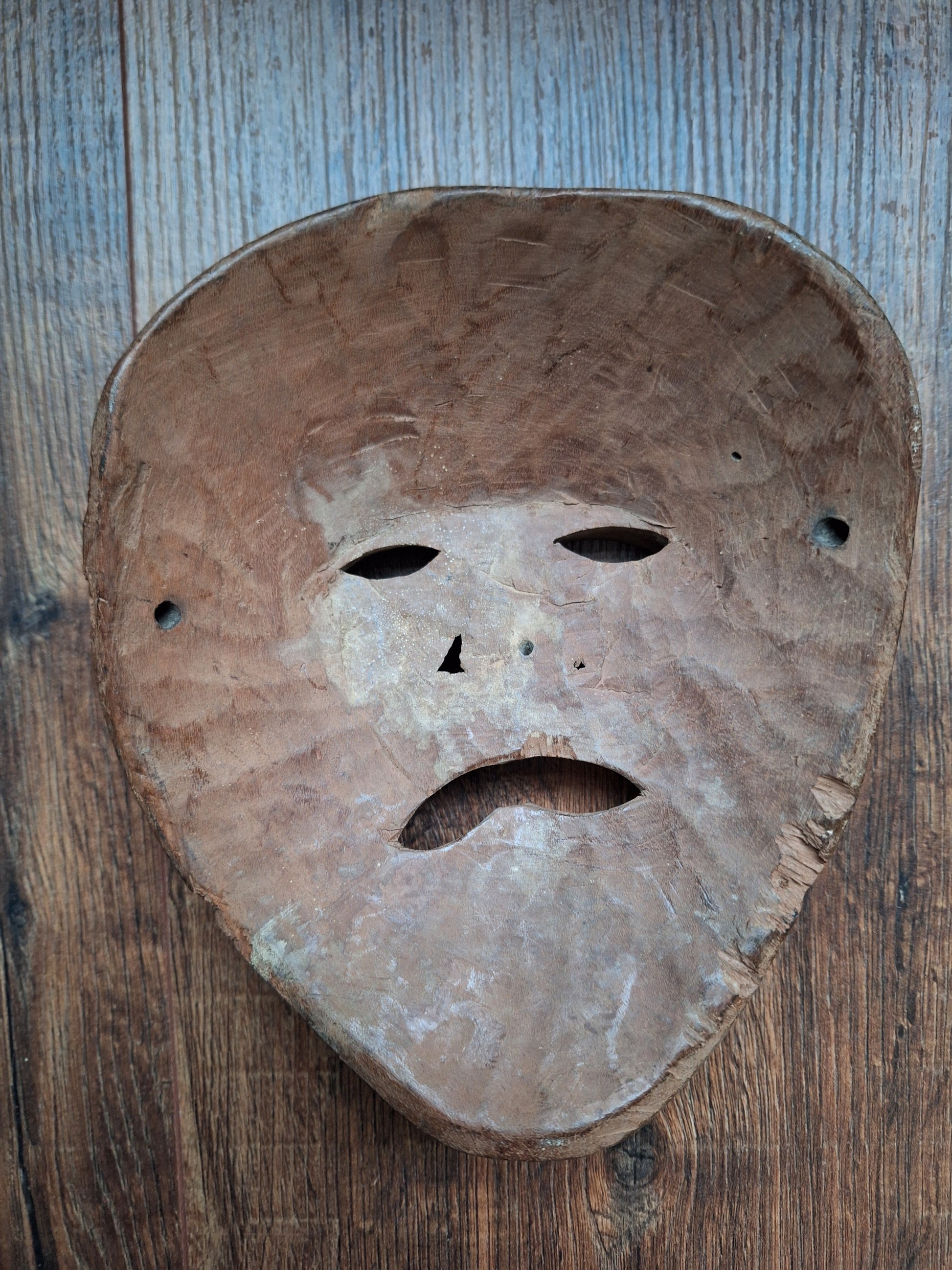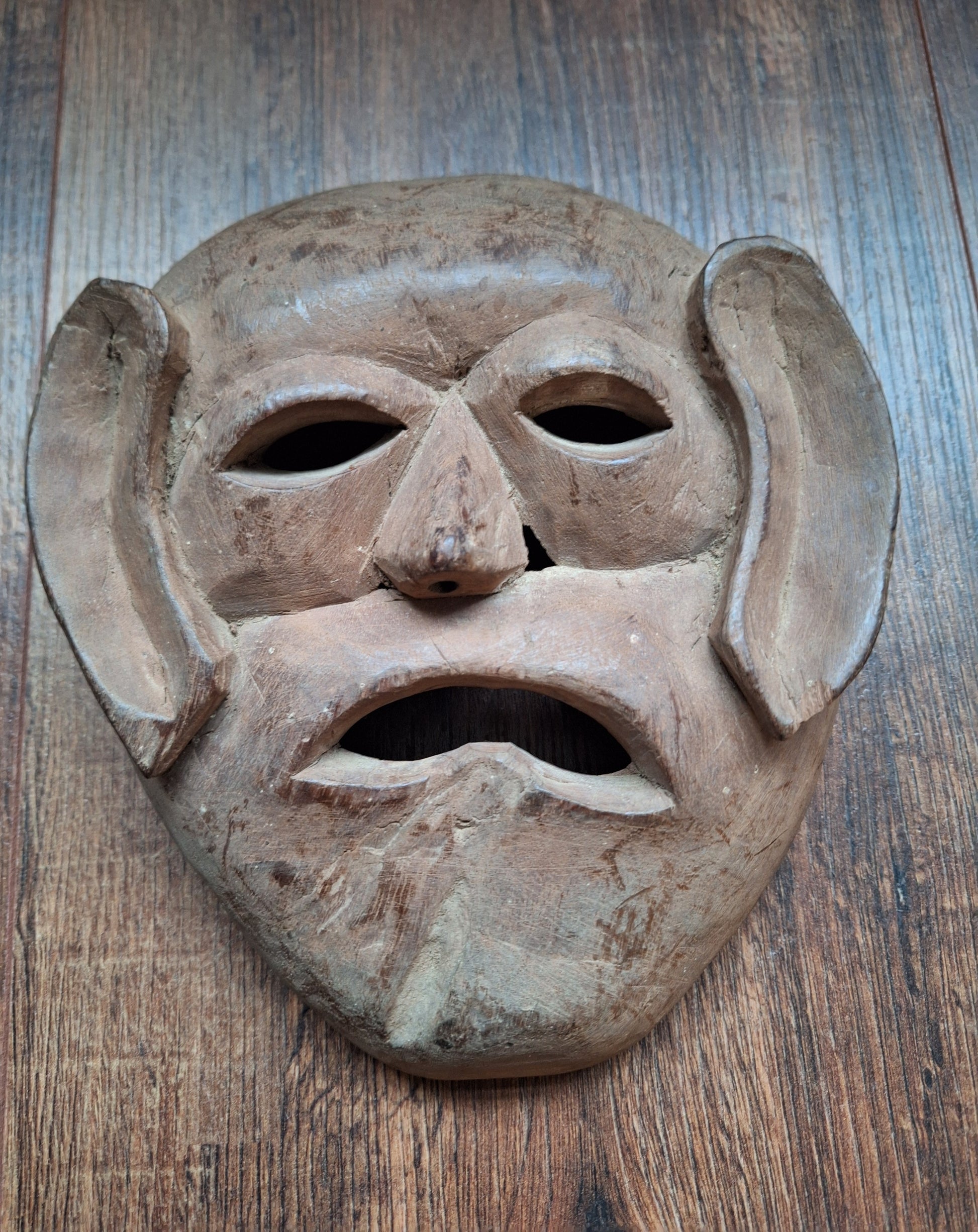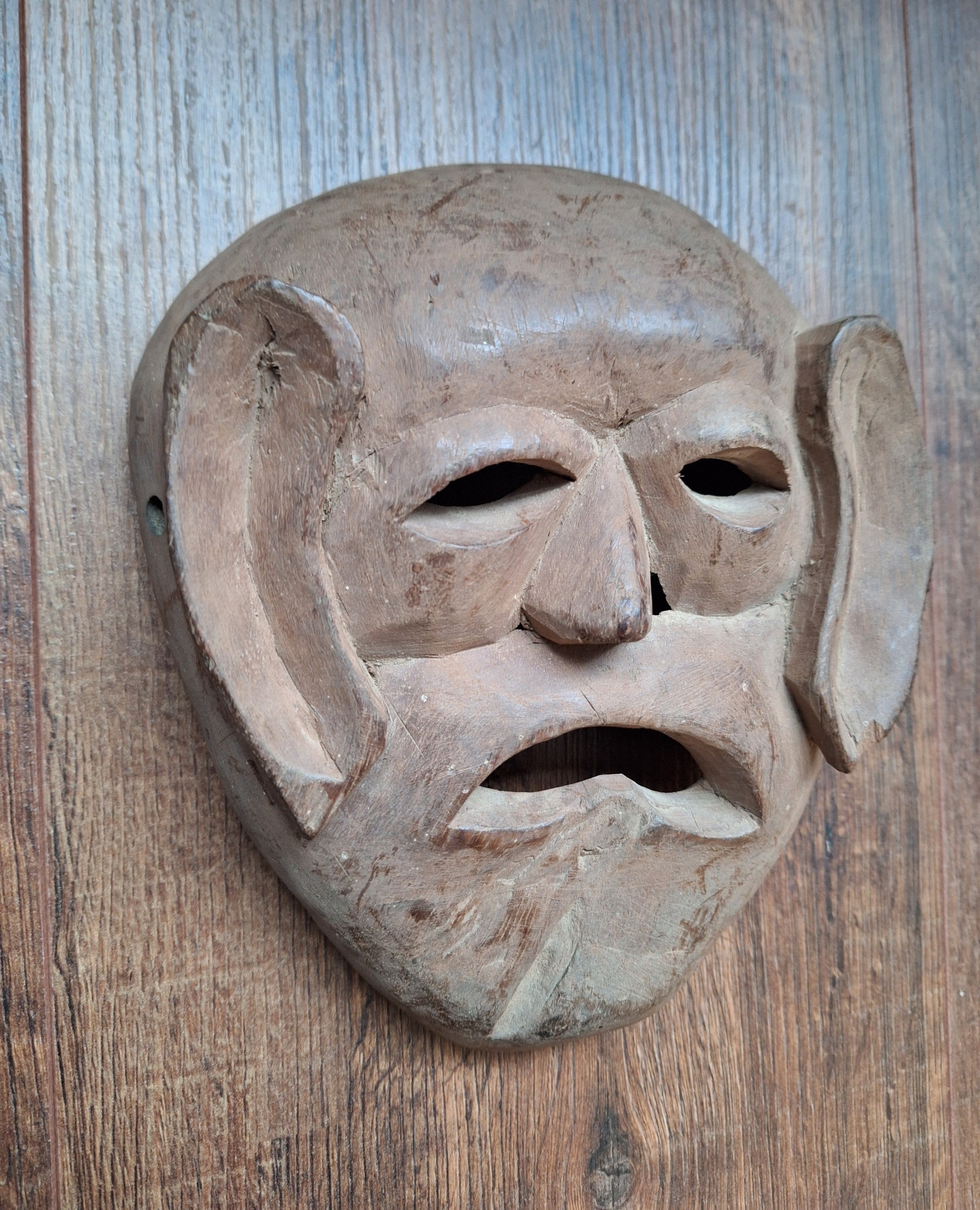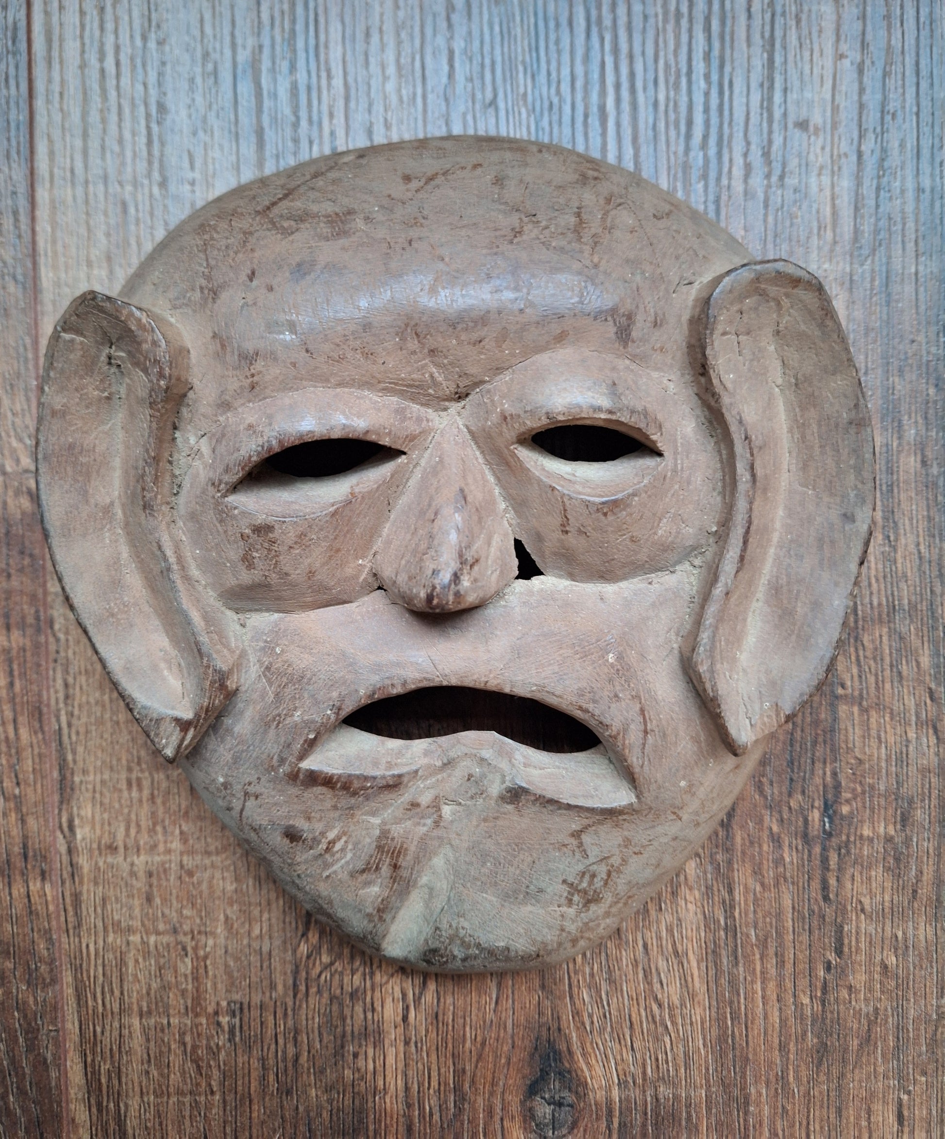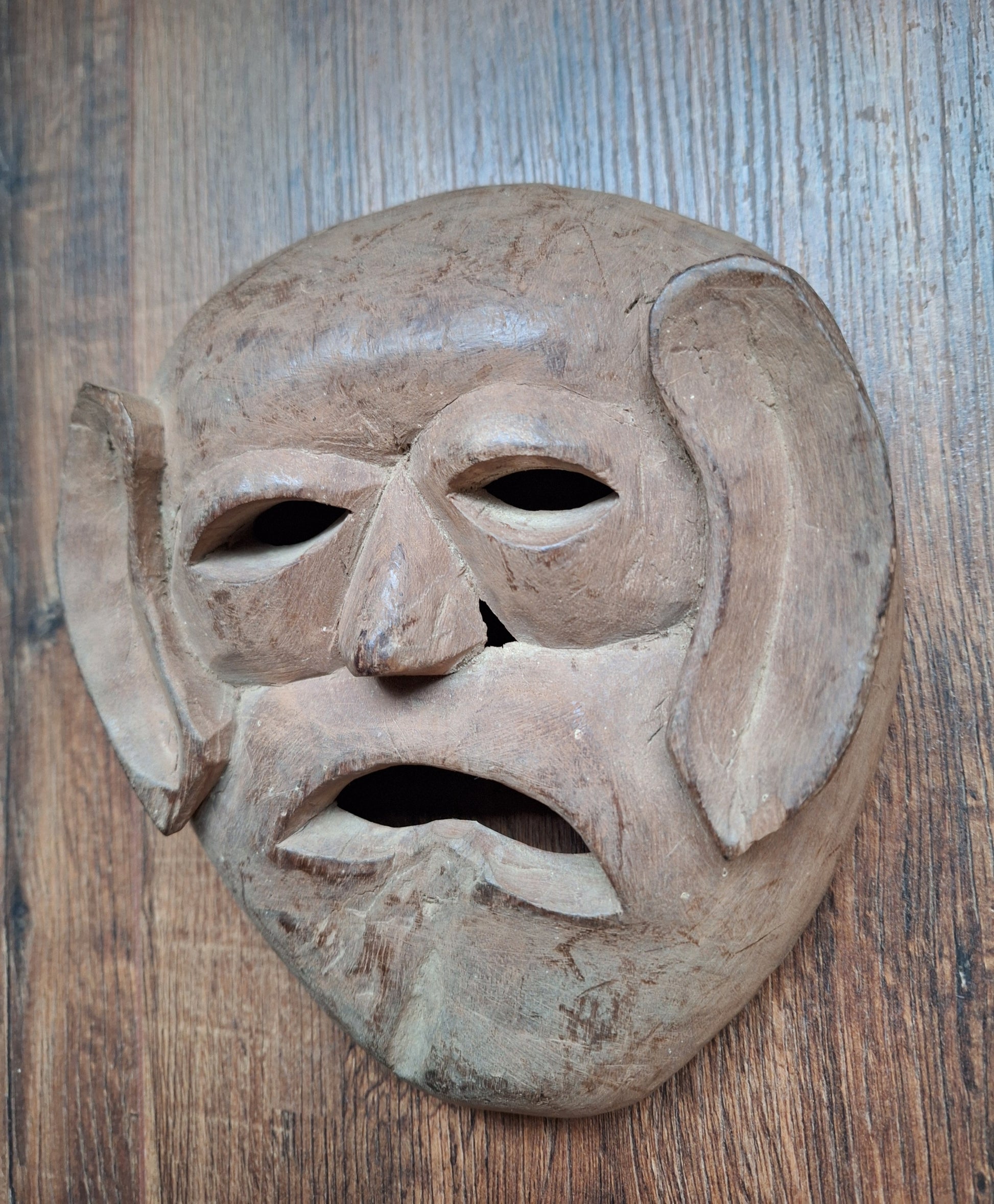 This mask can be dated around the 1970's-1980's and measures 20 centimeters wide and 16 centimeters high. Being from vintage origin, it might show some signs of its age and previous usage, but overall it is still in very good condition. On both sides of the face, behind the ears, a hole has been drilled, so a cord can be pulled through to use it as a wallhanging.