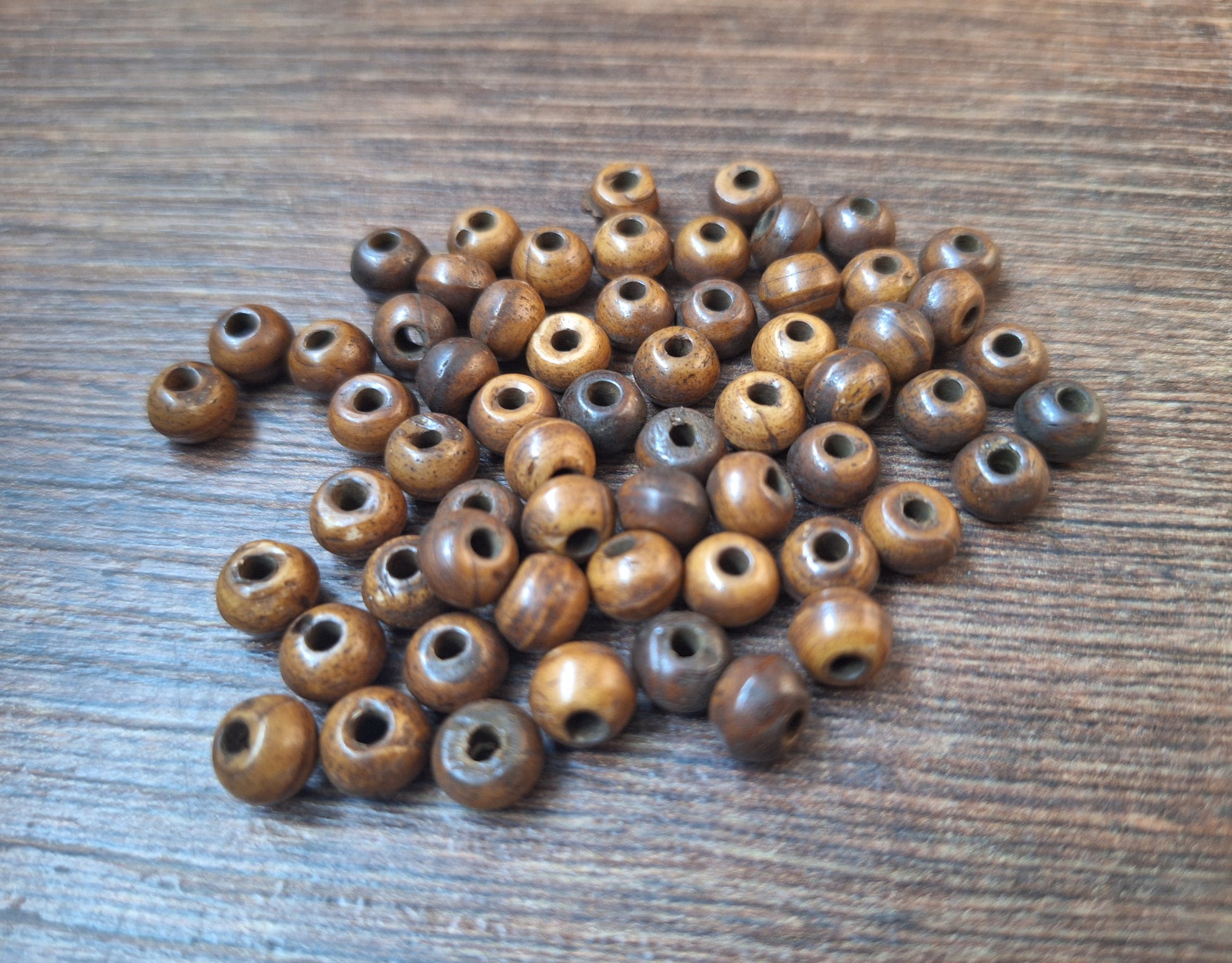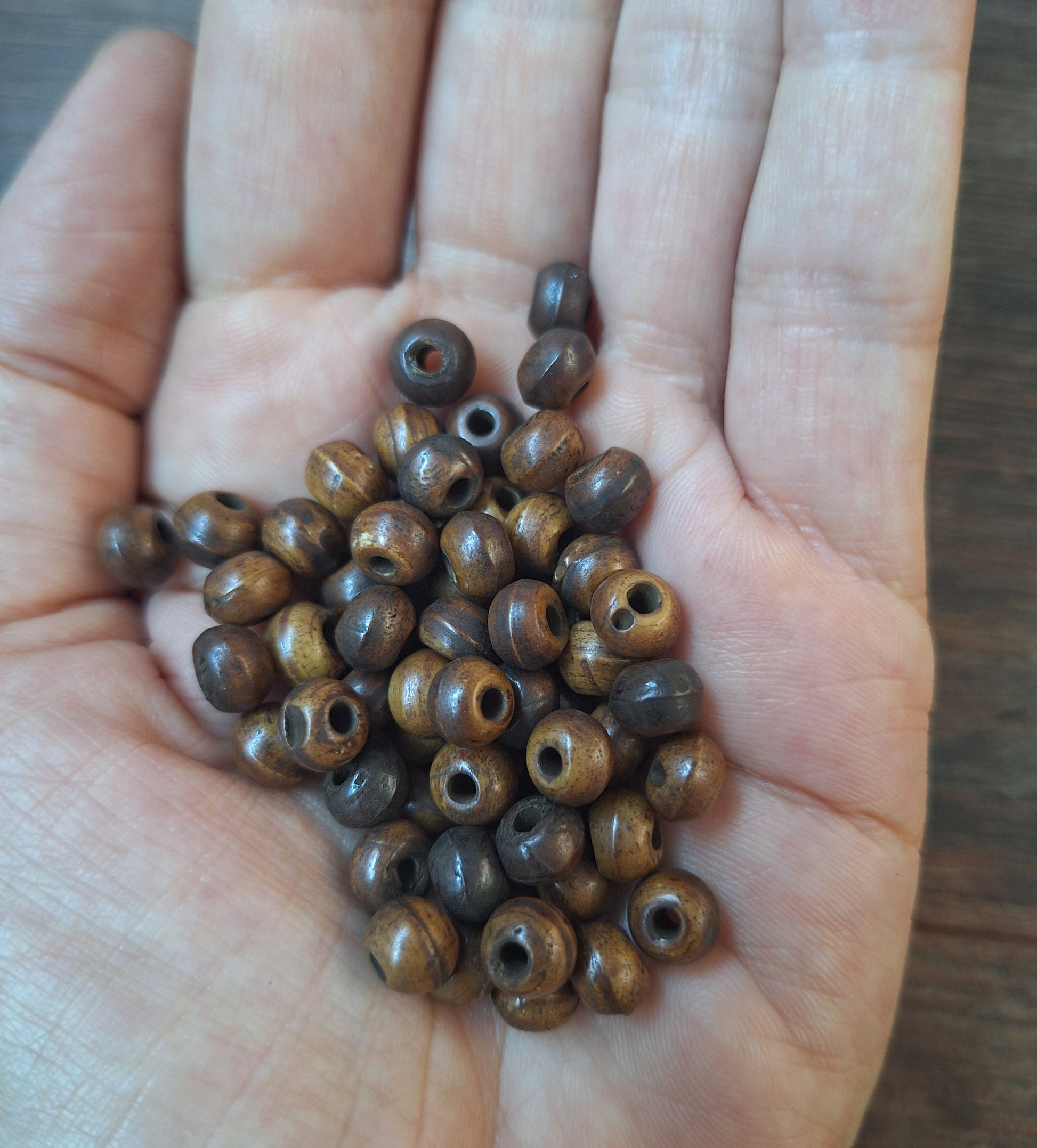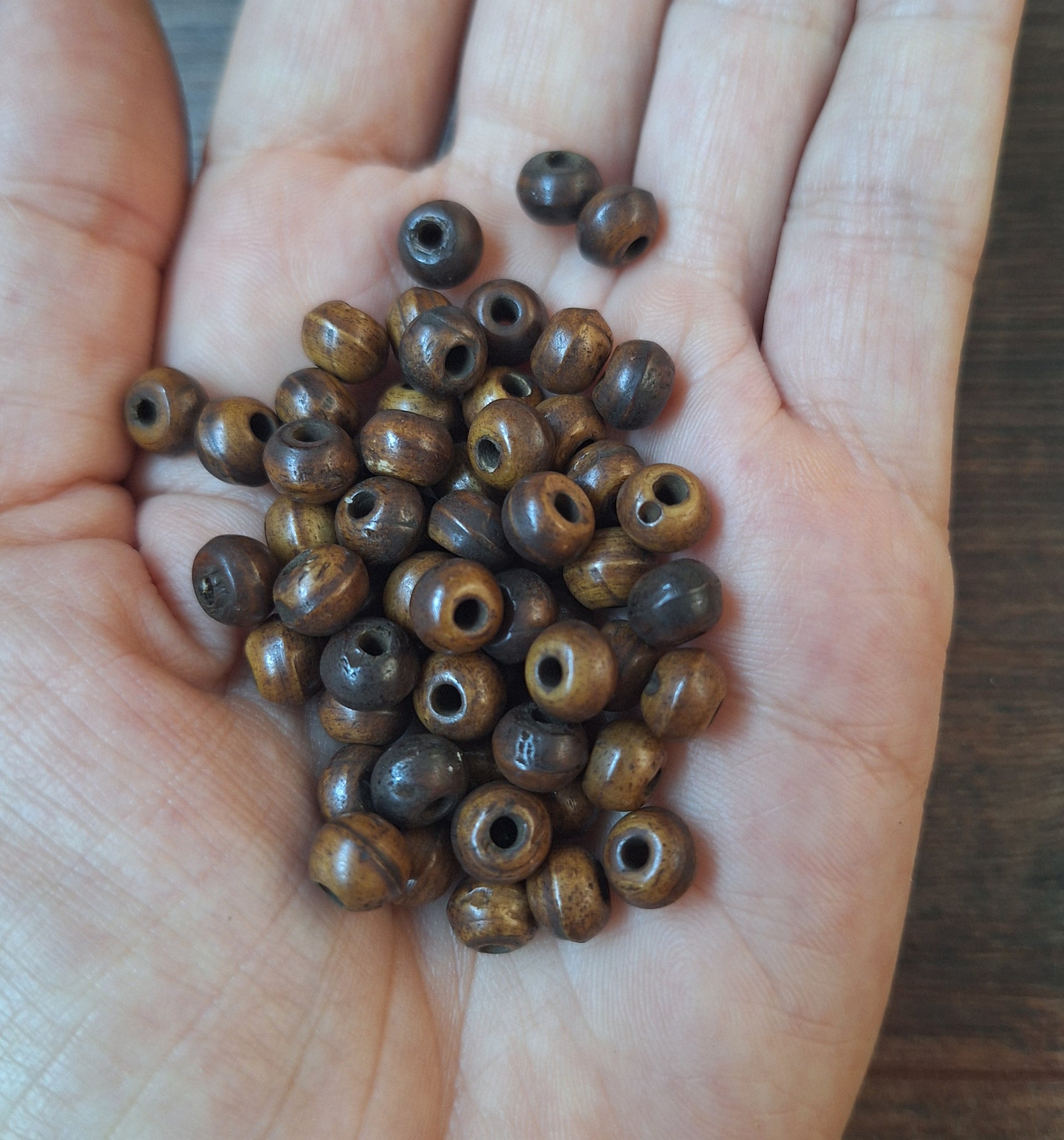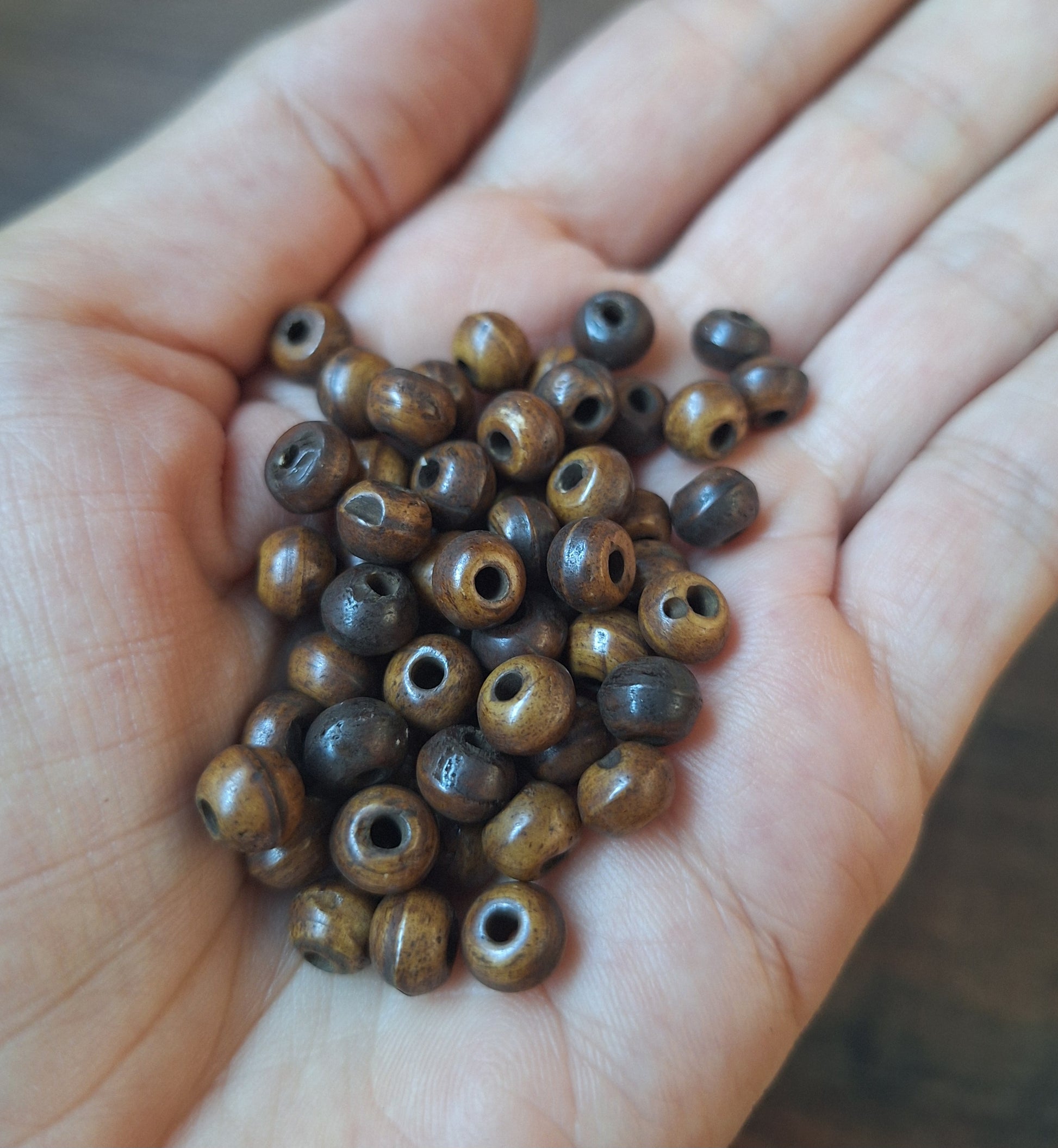 Vintage Nepalese beads carved from yak bone. Color varying from medium to dark brown. Perfect basic beads to use in all kinds of jewelry and amulets, with a charming rustique look and feel. The beads are approximately 7 millimeters in diameter and 5 millimeters high, with a hole diameter of approximately 3 millimeters.