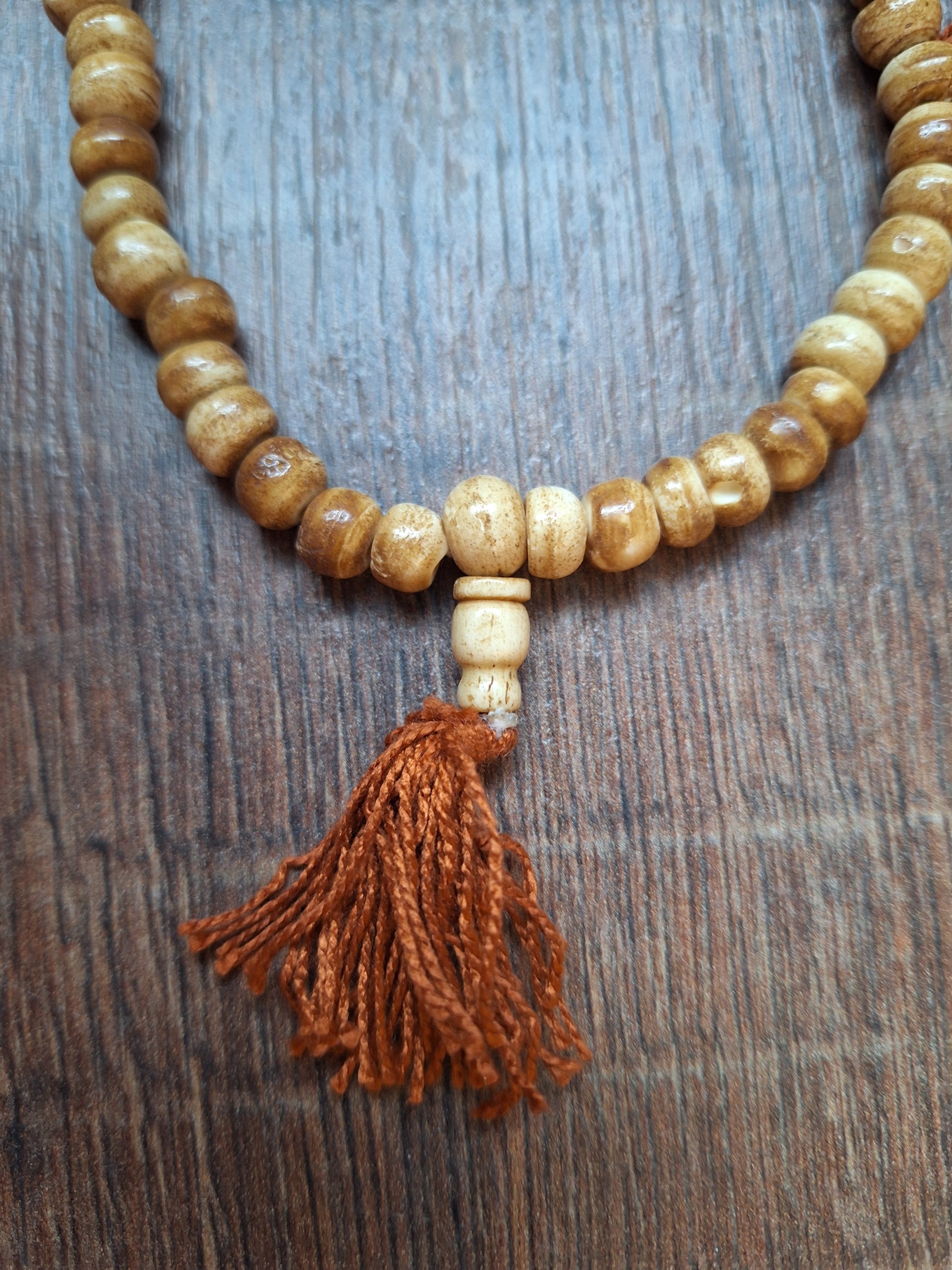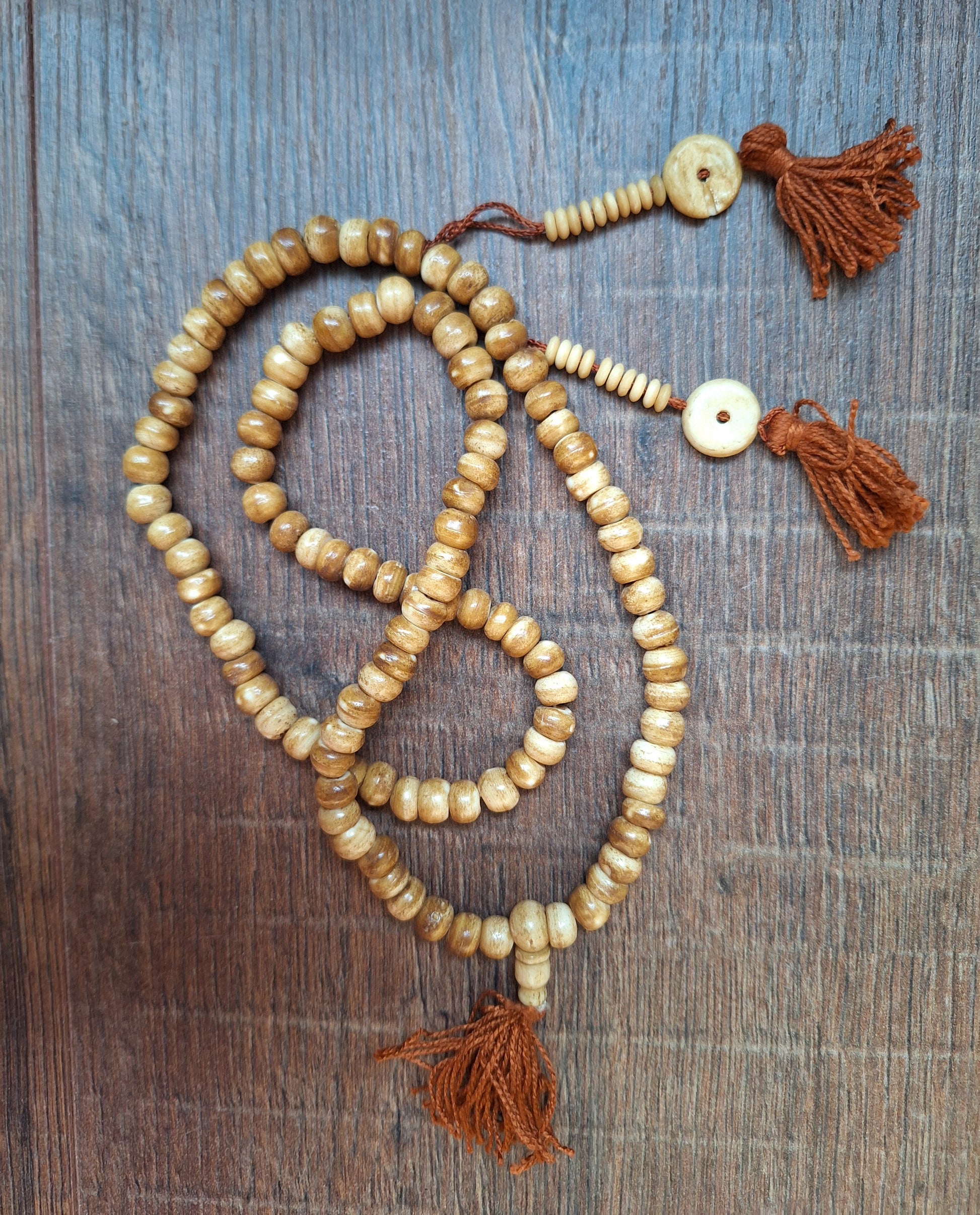 This mala is made with nicely polished yak bone beads.The beads are approximately 5-6 millimeters high and 8 millimeters in diameter. The beads are strung on white cotton cord and decorated with brown cotton tassels. Total length of the mala is approximately 64 centimeters.