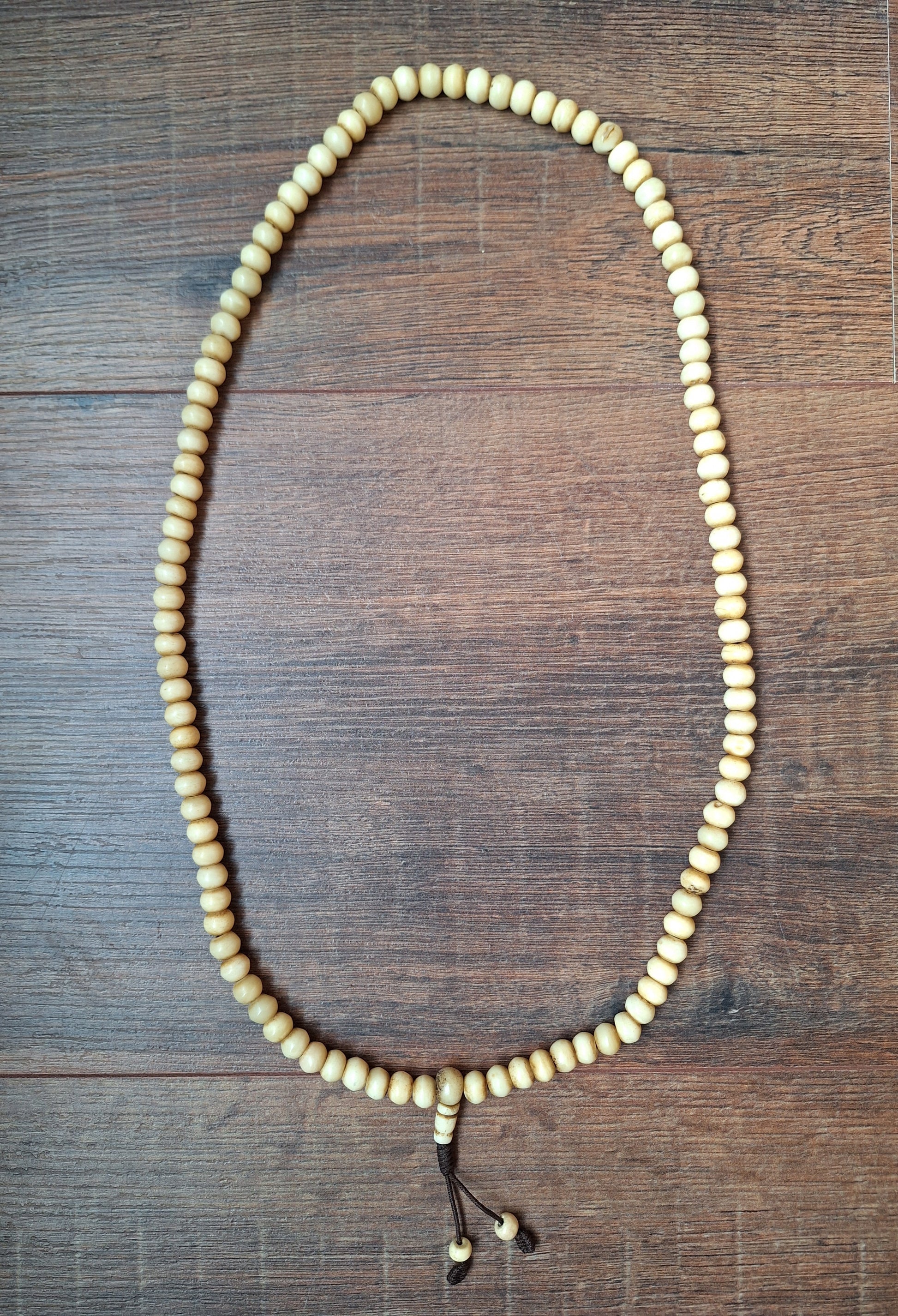This mala is made with 108 beads carved from yak bone, with a diameter of approximately 8 millimeters. Total length of the mala is approximately 88 centimeters, total weight 116 grams.