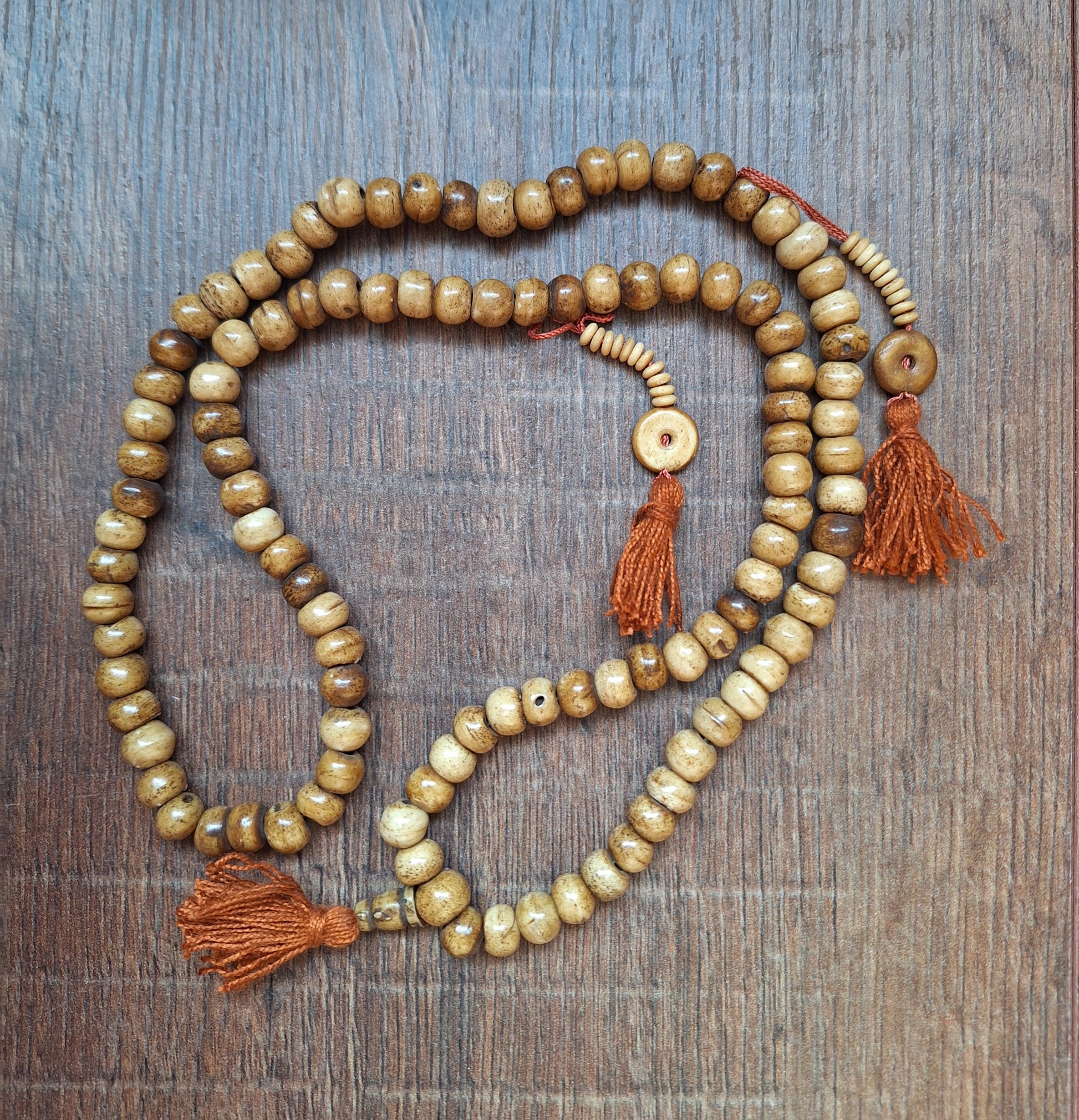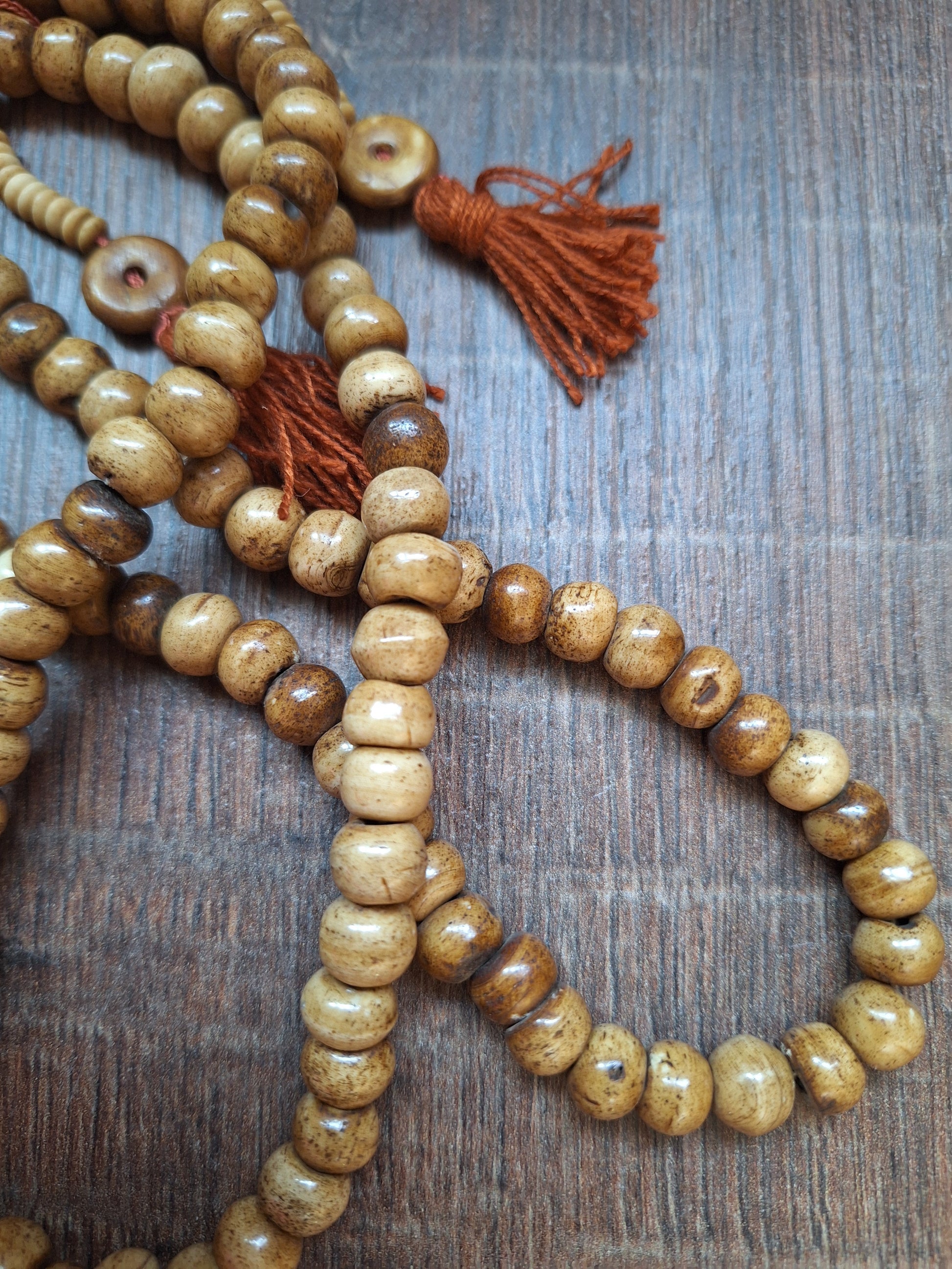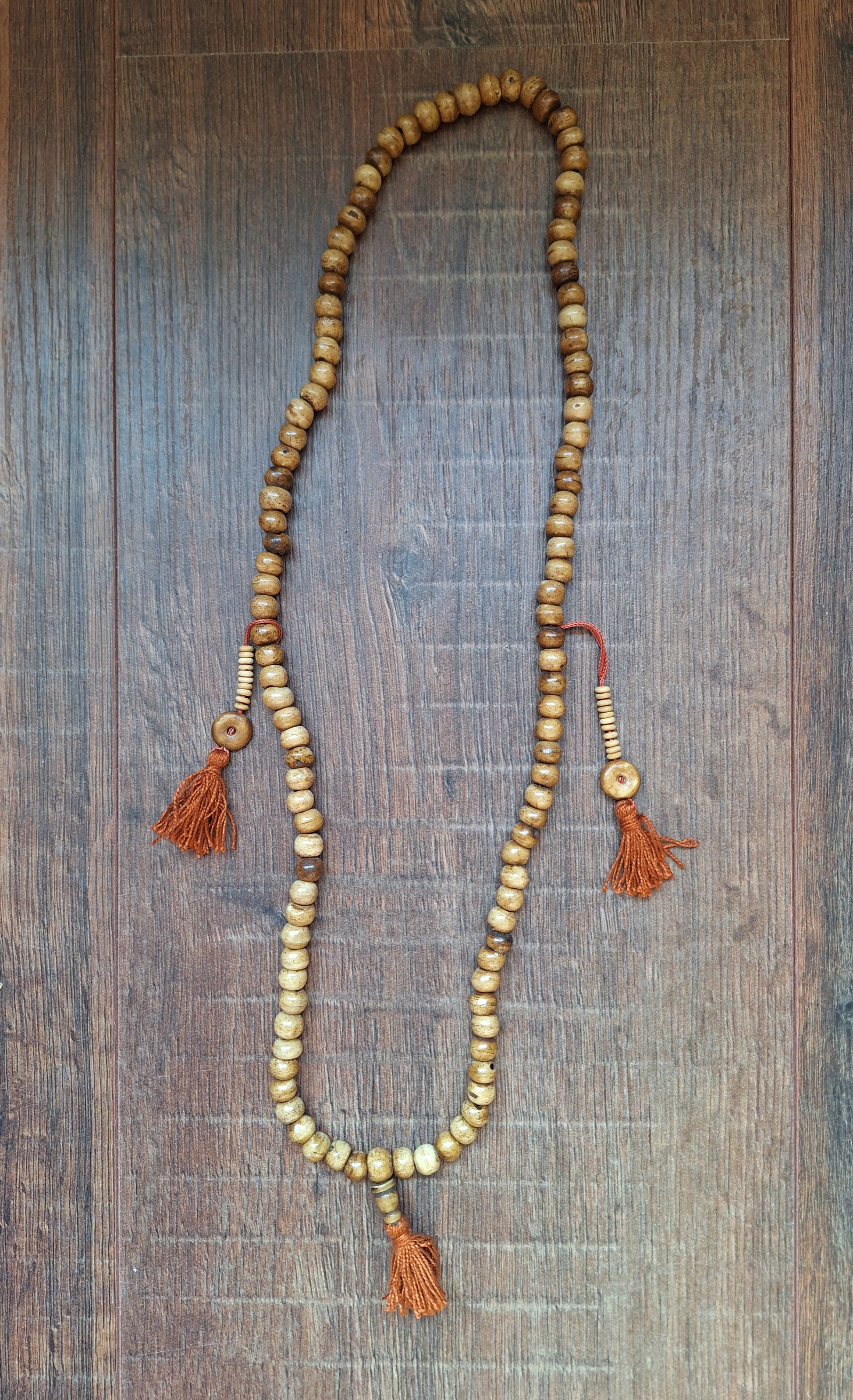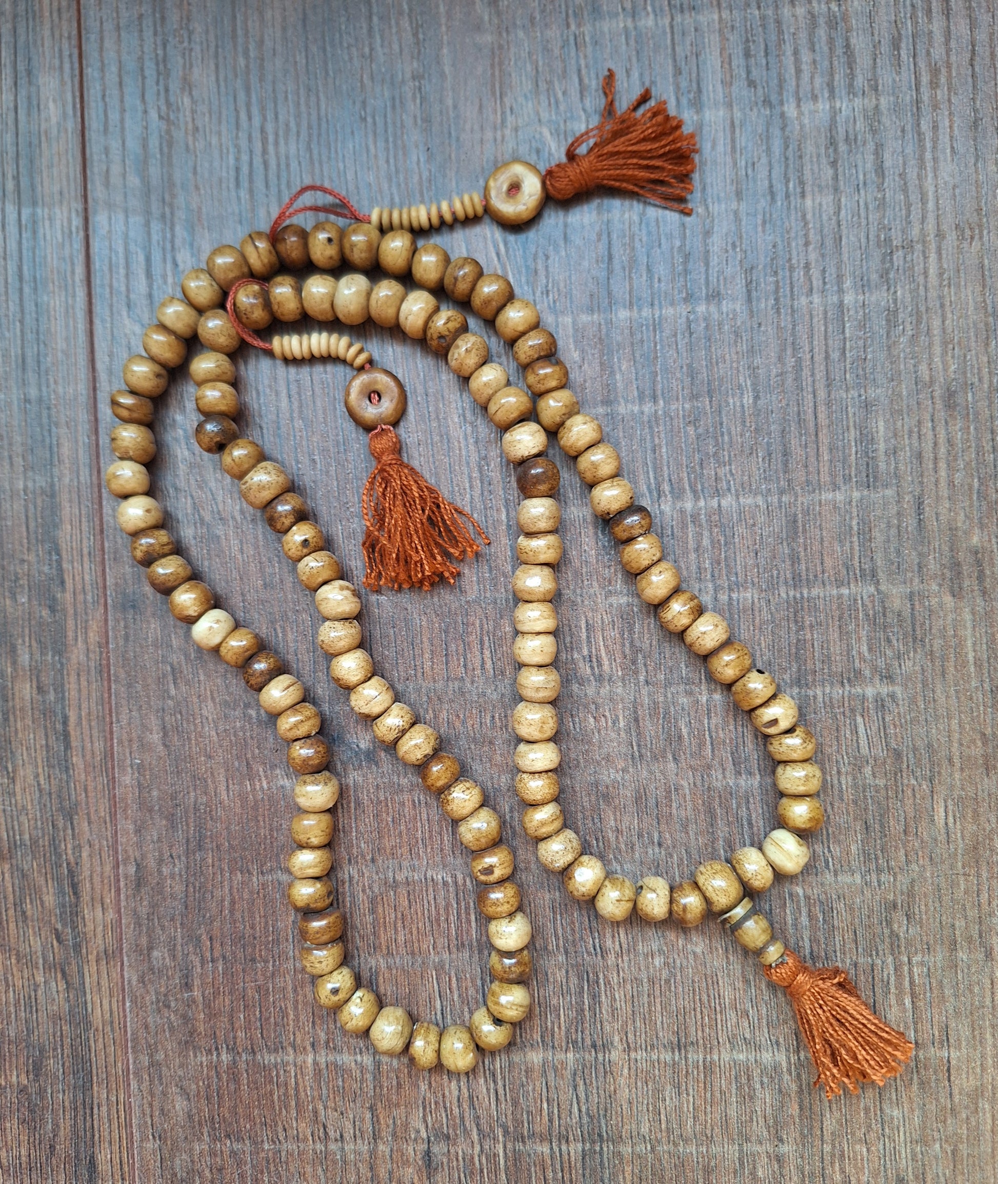 This mala is made with nicely polished yak bone beads.The beads are approximately 7-8 millimeters high and 9-10 millimeters in diameter. The beads are strung on white cotton cord and decorated with brown cotton tassels. Total length of the mala is approximately 84 centimeters.