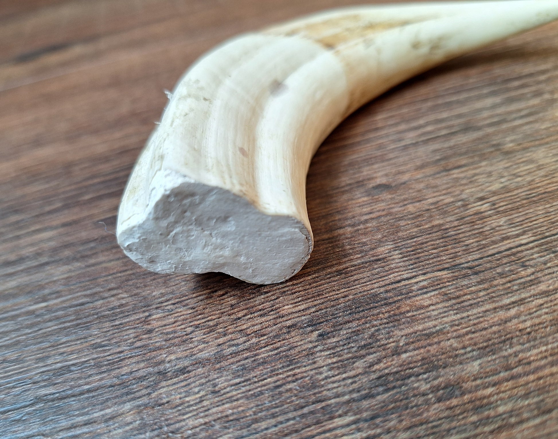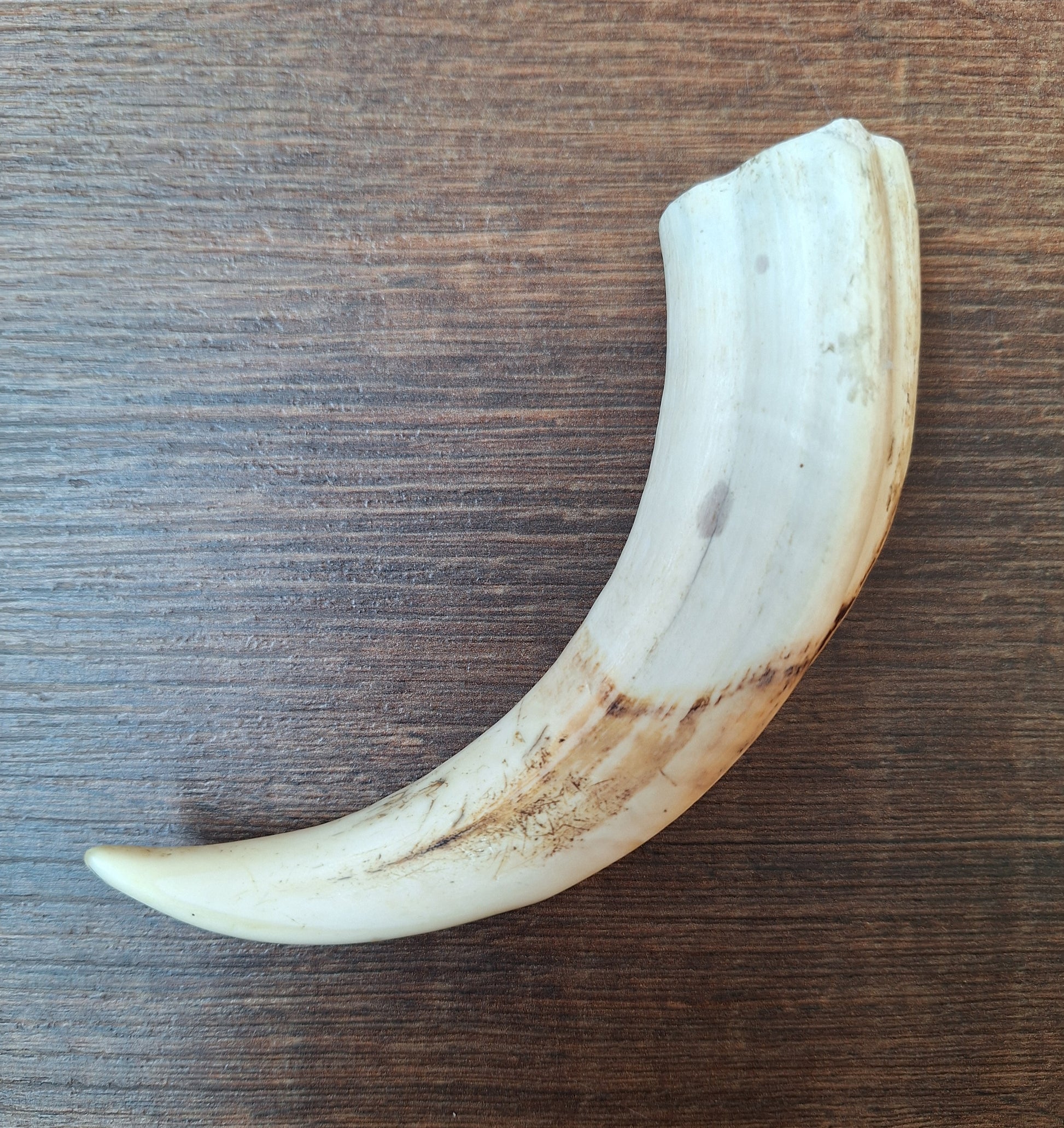 Large tusk from an African warthogs. This tusk is from vintage origin and has been restored and reinforced; cleaned and polished, fillings where necessary replaced or supplemented, cracks and splits glued, holes filled up. Of course the signs of its age and old damages can still be seen (so please look closely at the pictures to observe the condition of this item), but being reinforced it is now in good stable condition again.