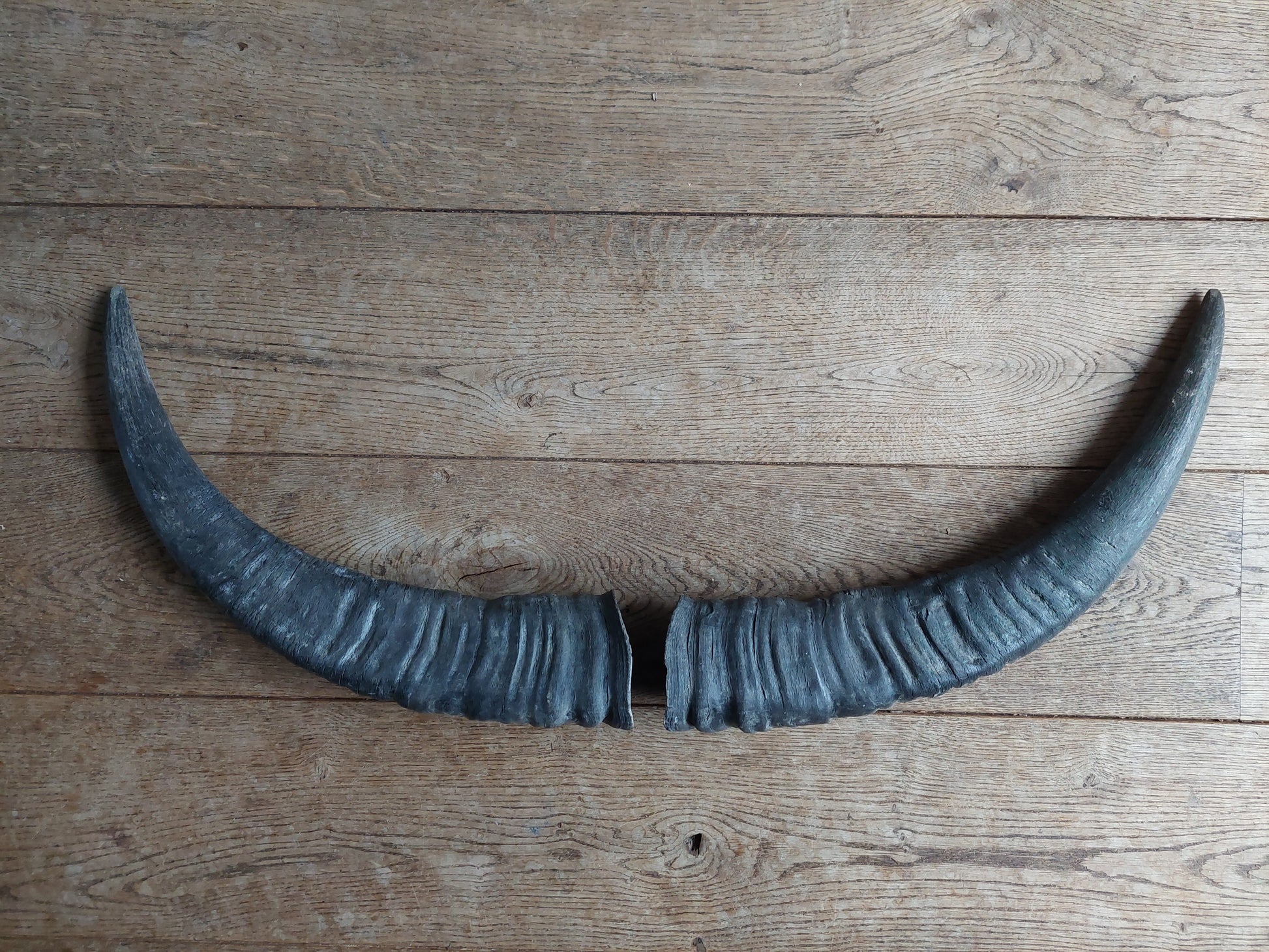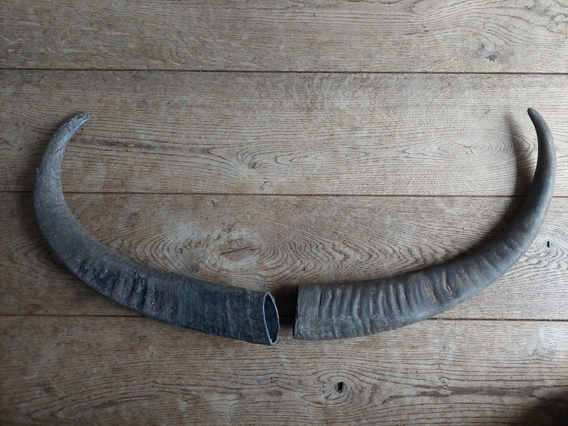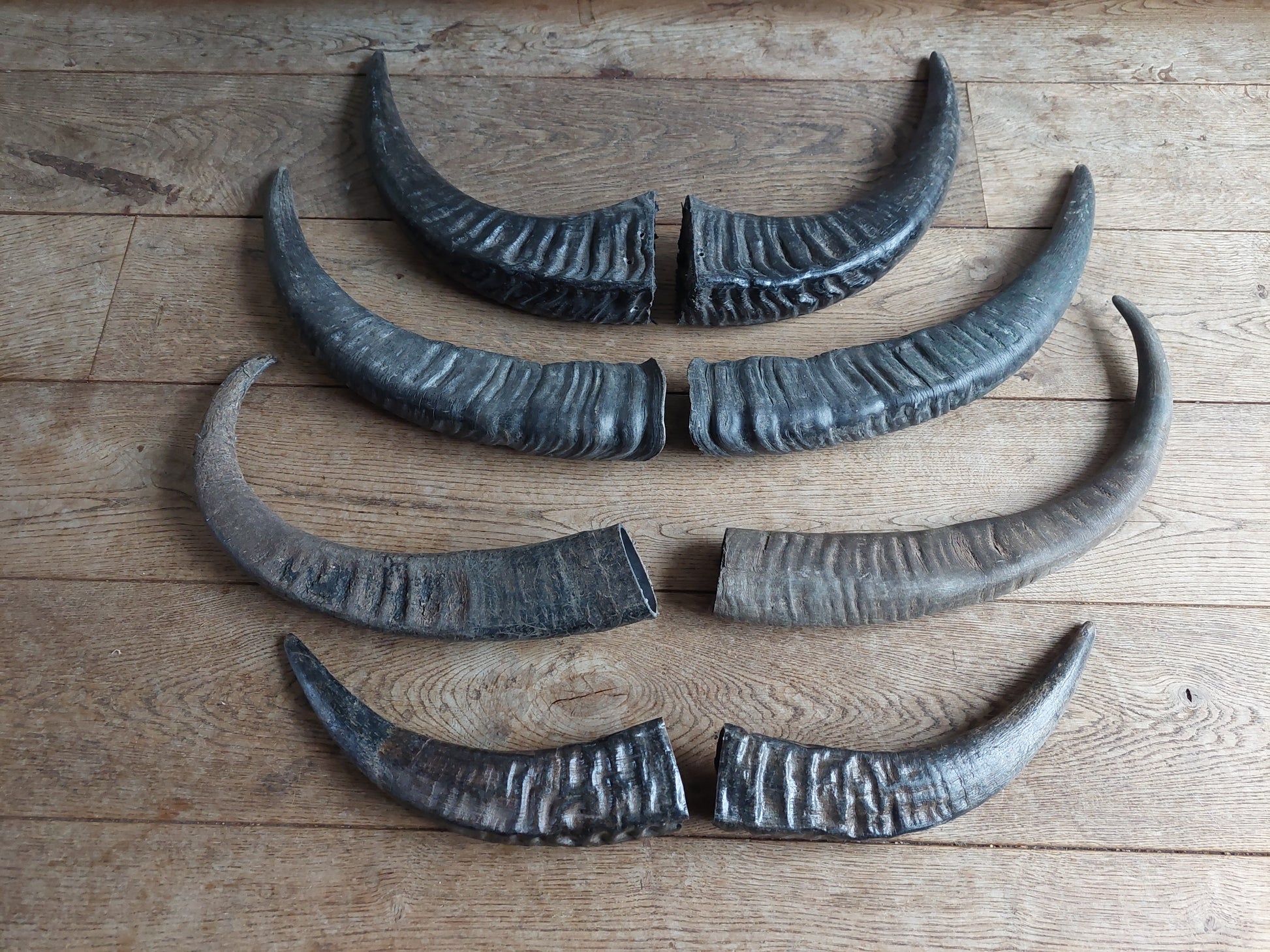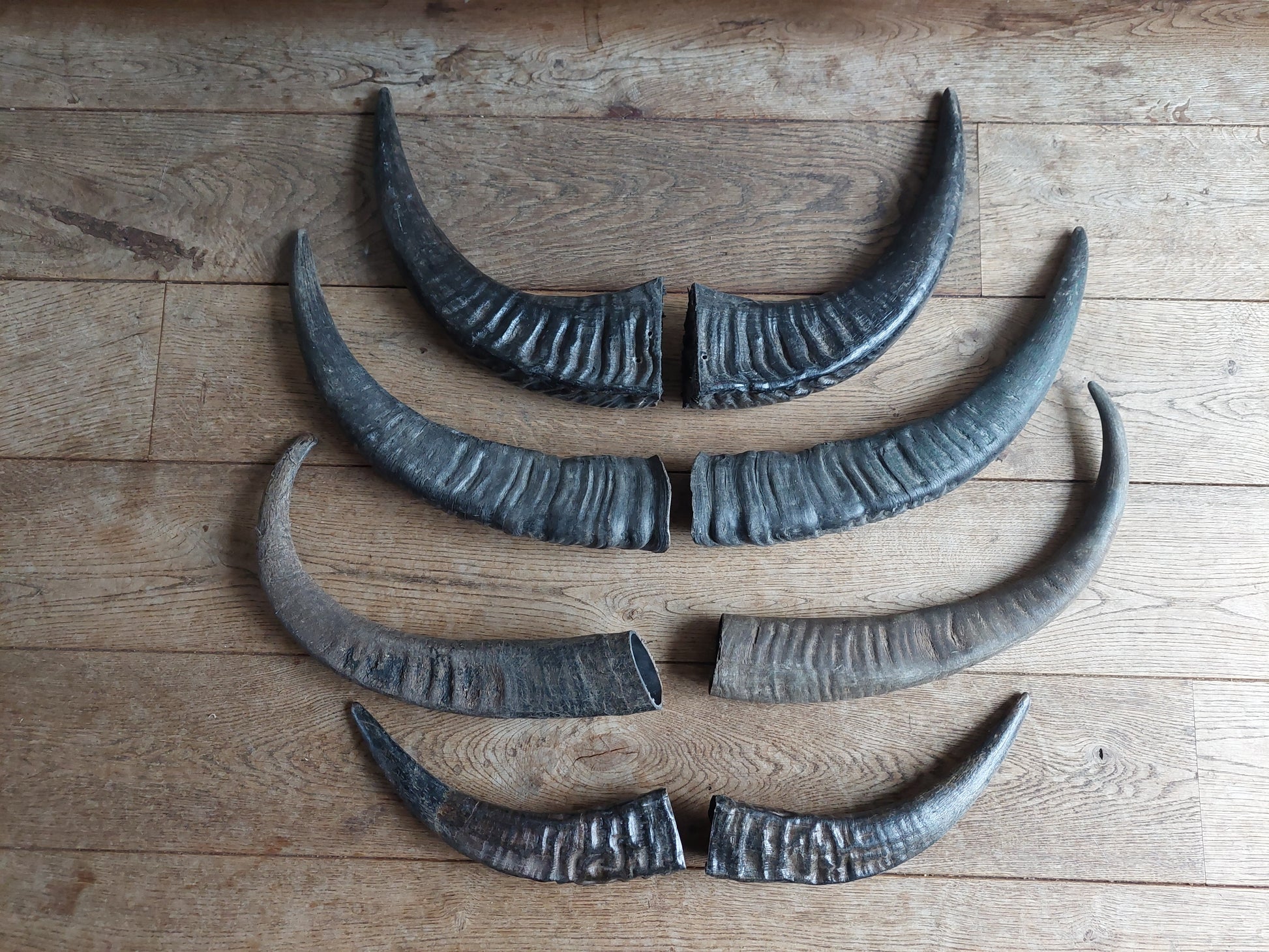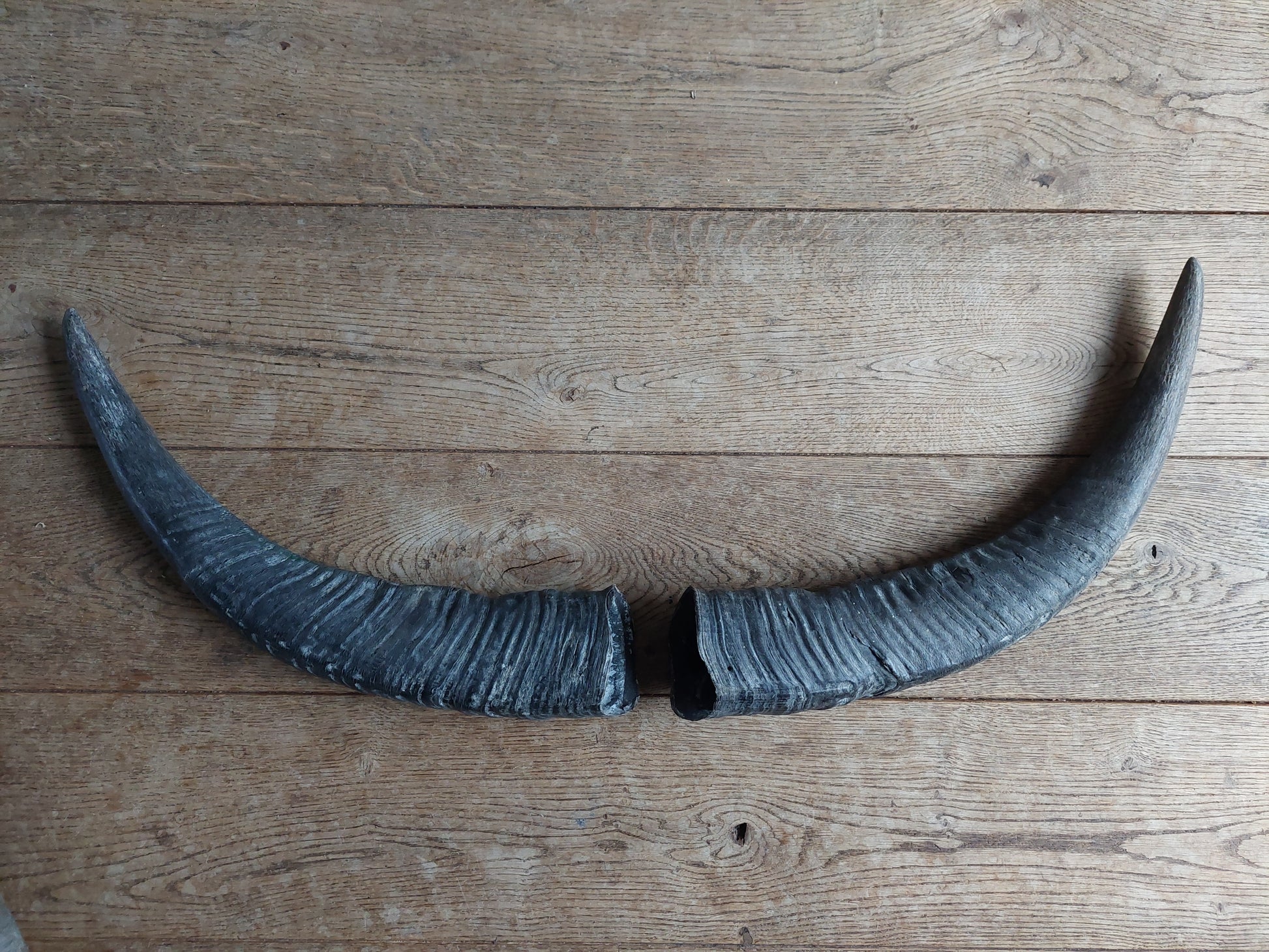 * set 3; 3rd from above on the first overview picture. Length approximately 46 centimeters per horn. Older set, not polished, outer keratin layer a bit fragile here and there. Curve of the horns is not exactly symmetrical.