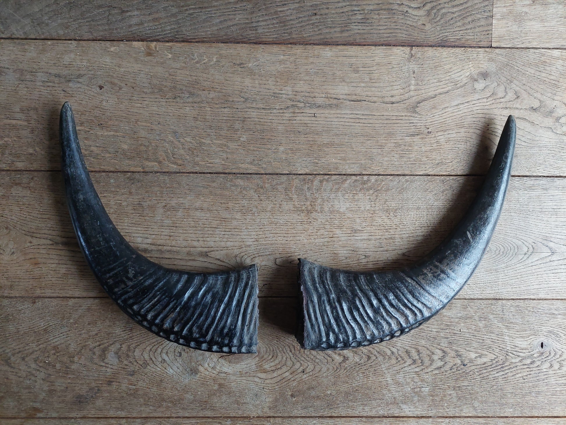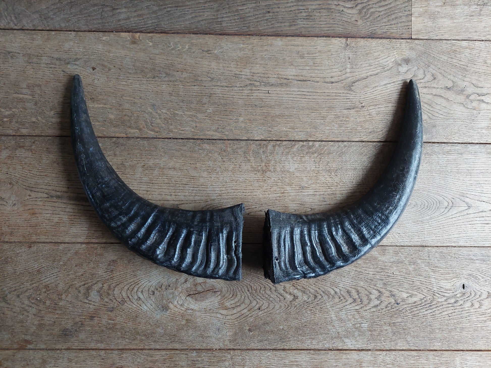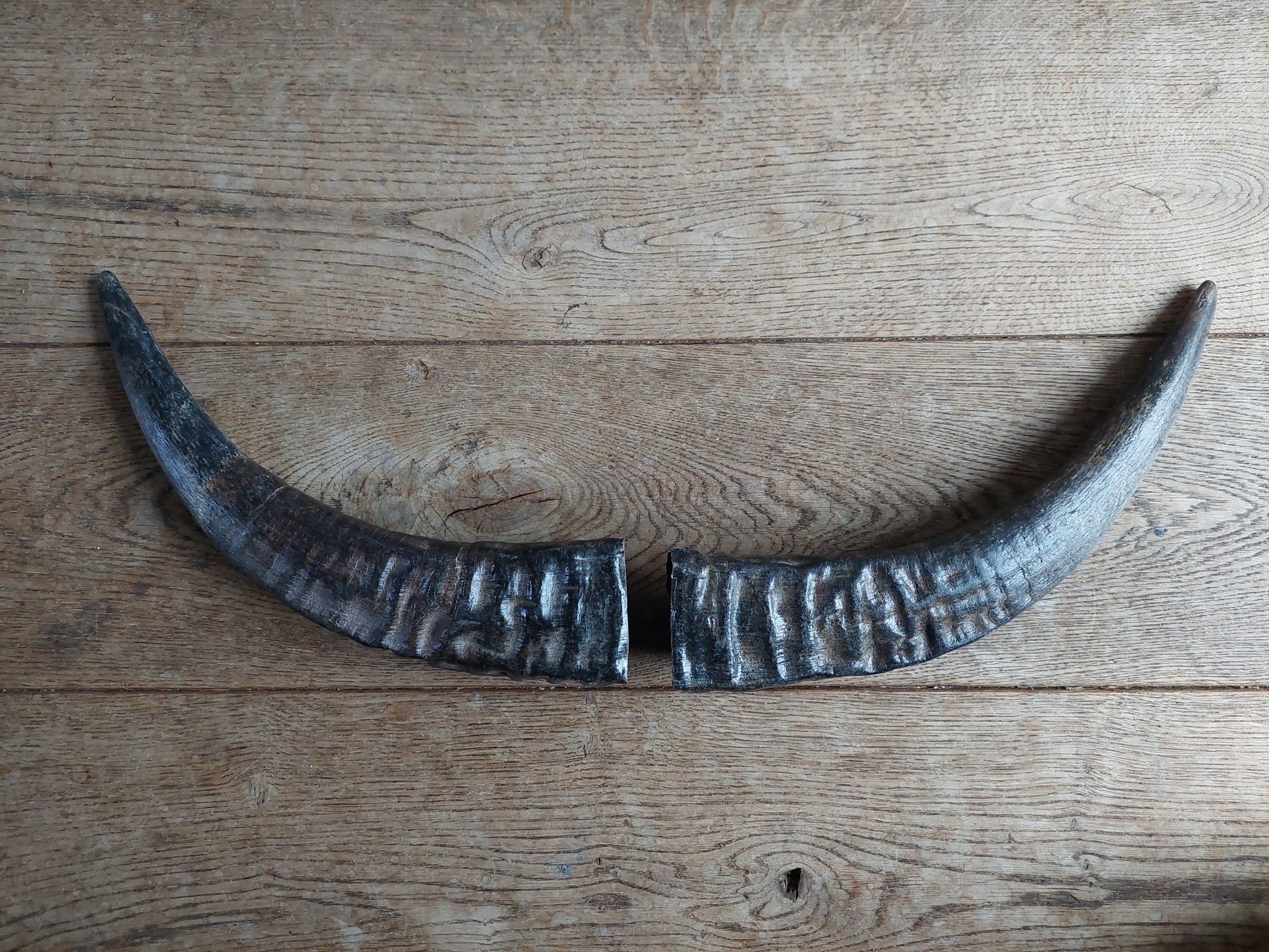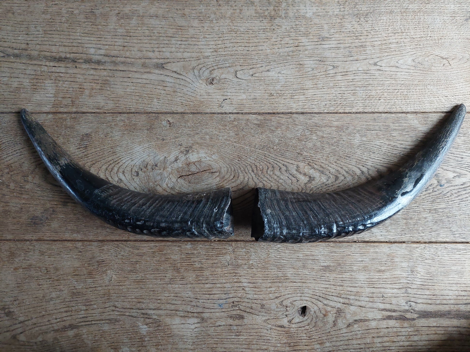 * set 2; 2nd from above on the first overview picture. Length approximately 48 centimeters per horn. Not polished. On one side of each horn there's a little screw hole from previous decorational usage.