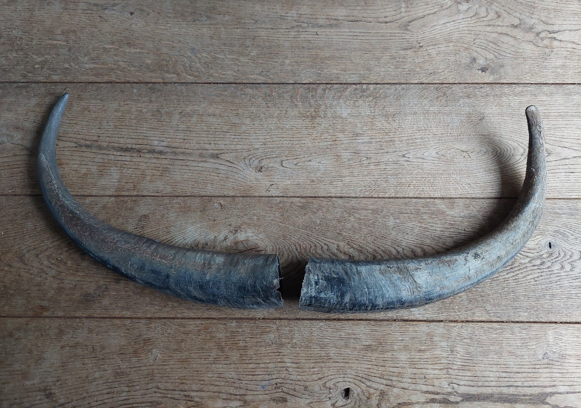 * set 1; top set on the first overview picture. Length approximately 44 centimeters per horn. Strong curve, very broad at the open end. Polished to a nice shine. Has two little screw holes on one side of each horn from previous decorational usage.