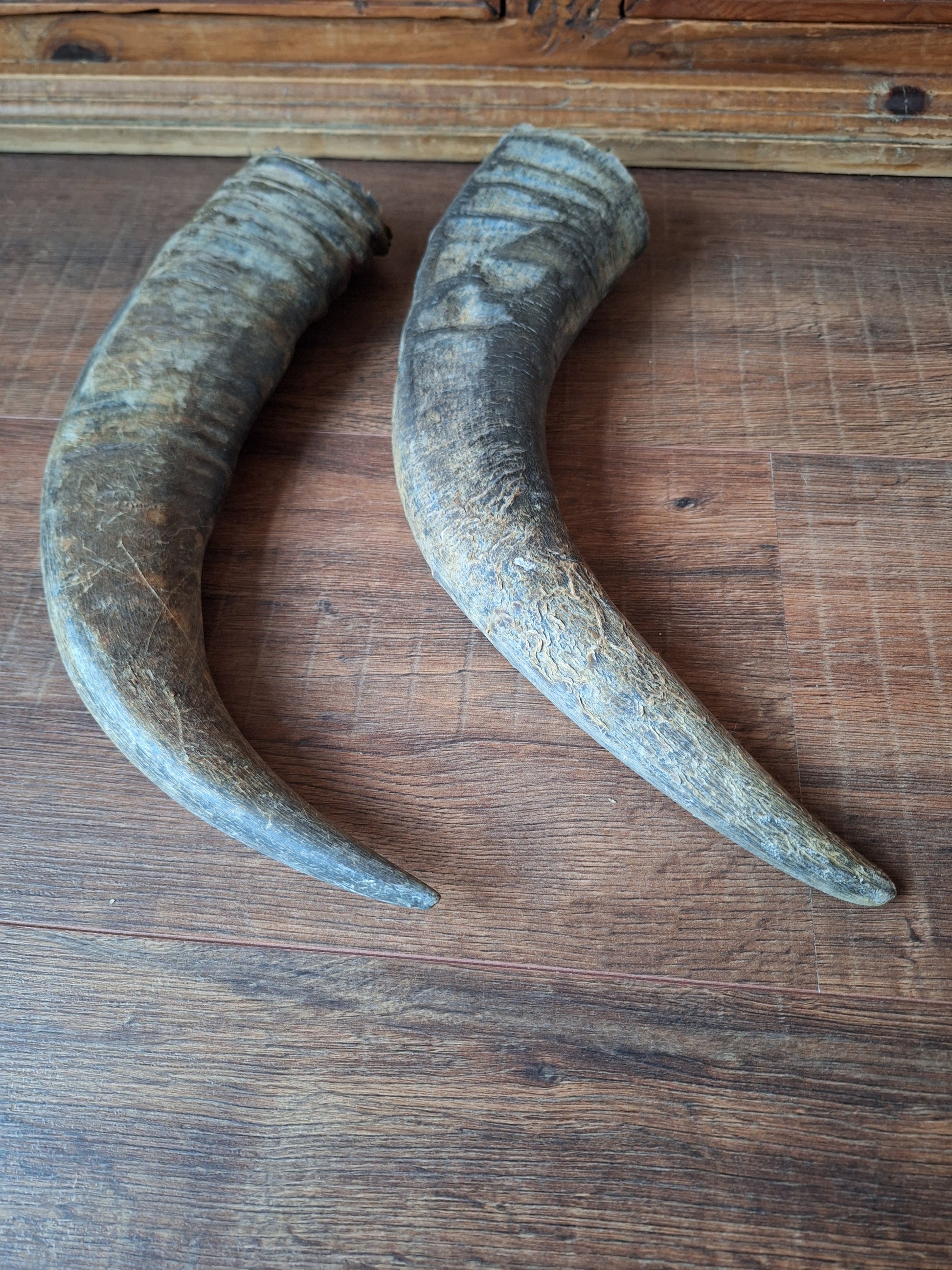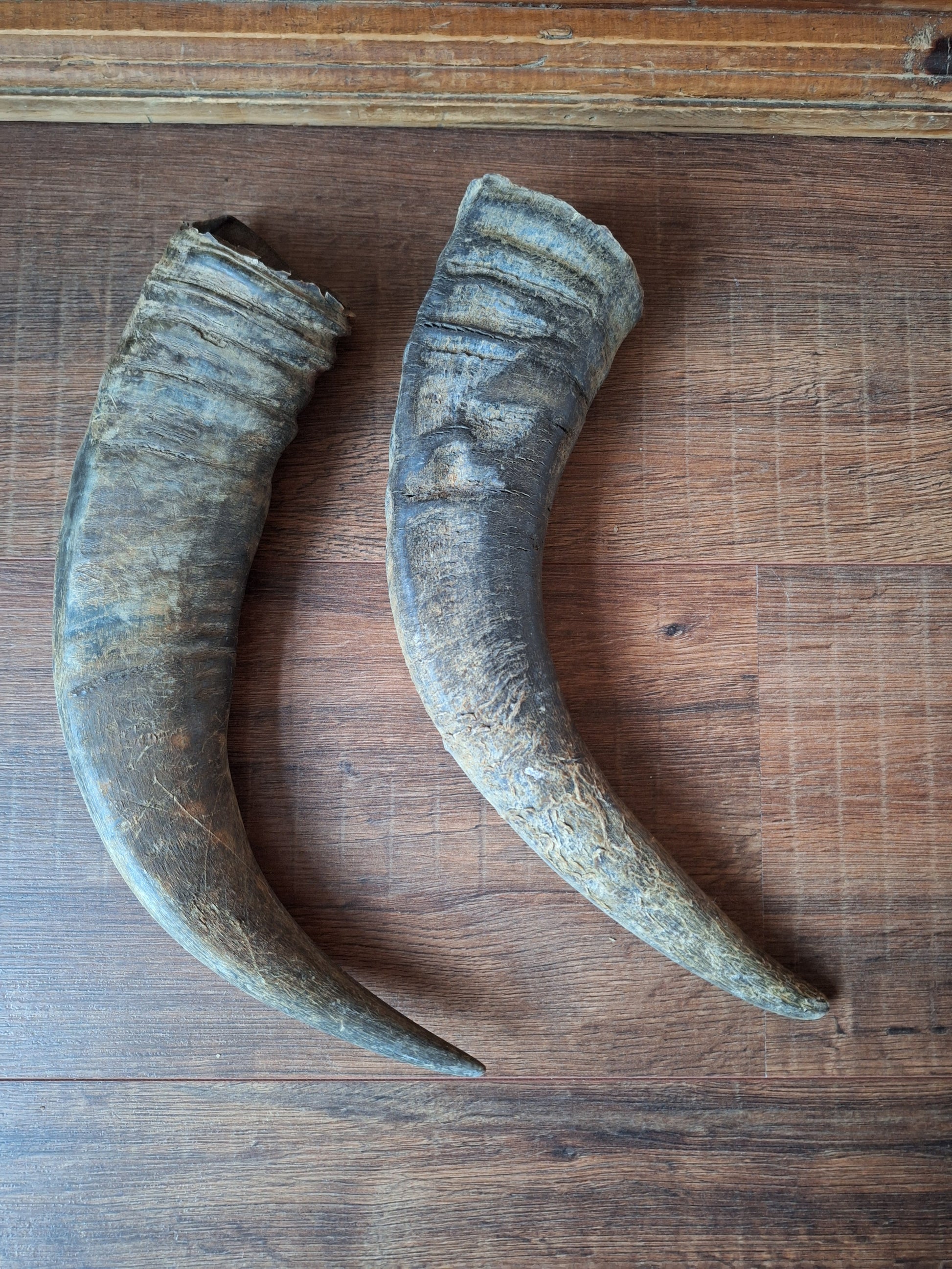 Please note; as can be seen on the pictures, the horns have been marked with painted numbers on the inside by the previous owner. And also on the outside some paint residu can be seen. This might of course not be a problem for your purposes (and maybe, with the right cleaning agent, you might be able to remove it), but because of this, the price for these horns is a bit lower than usual.