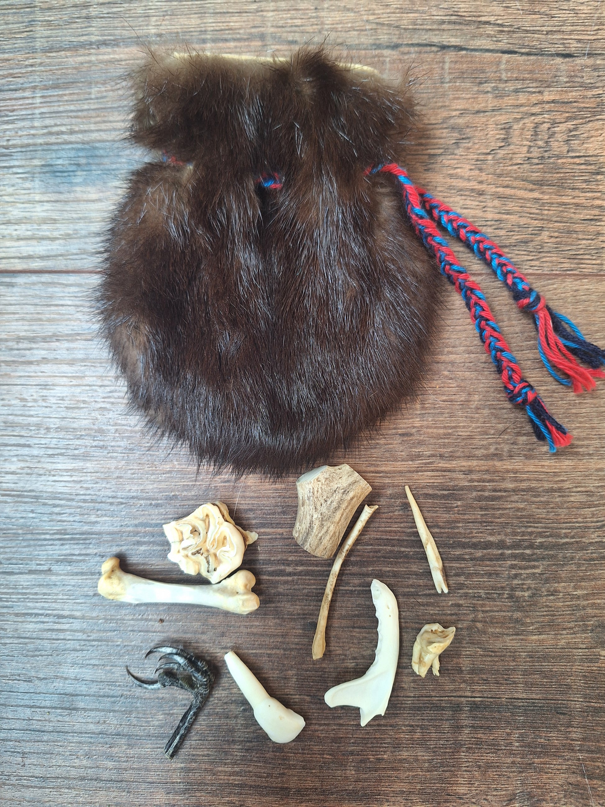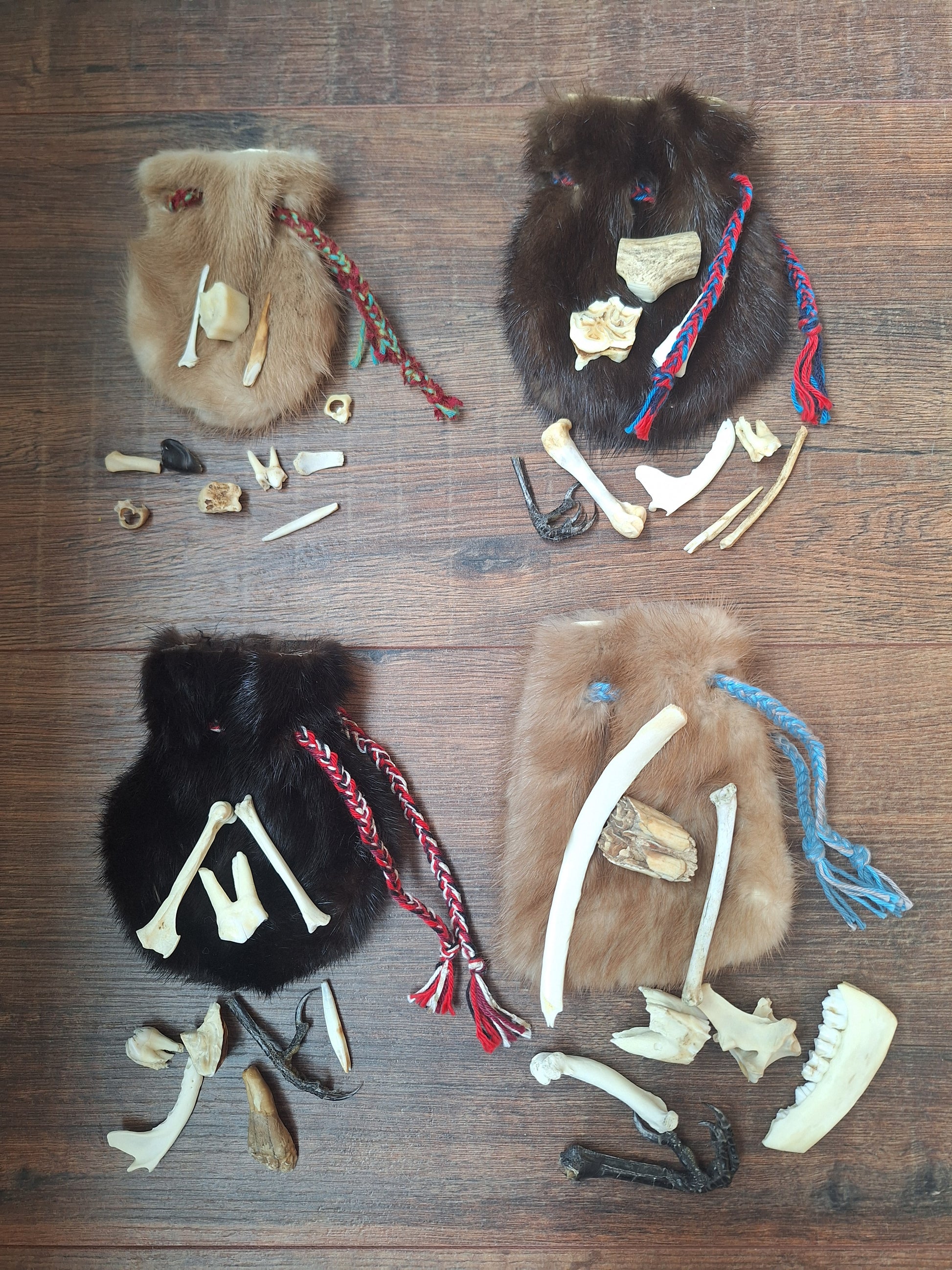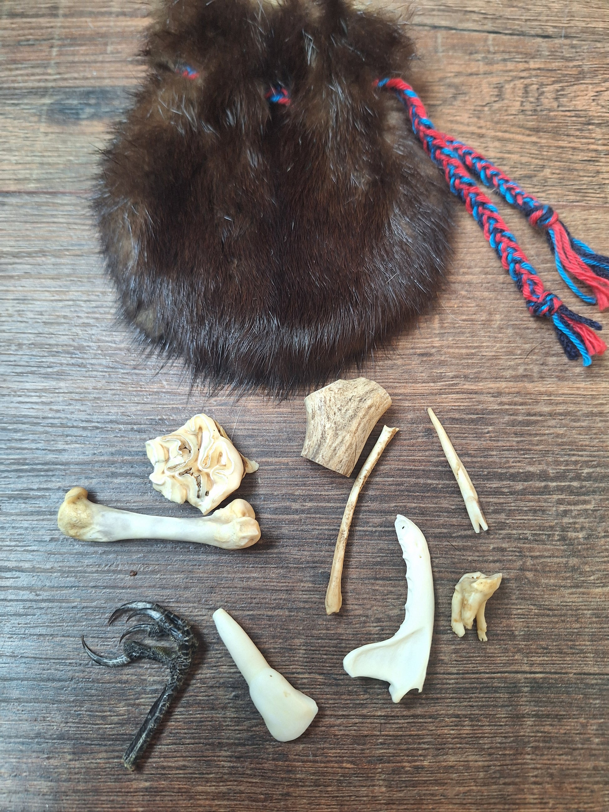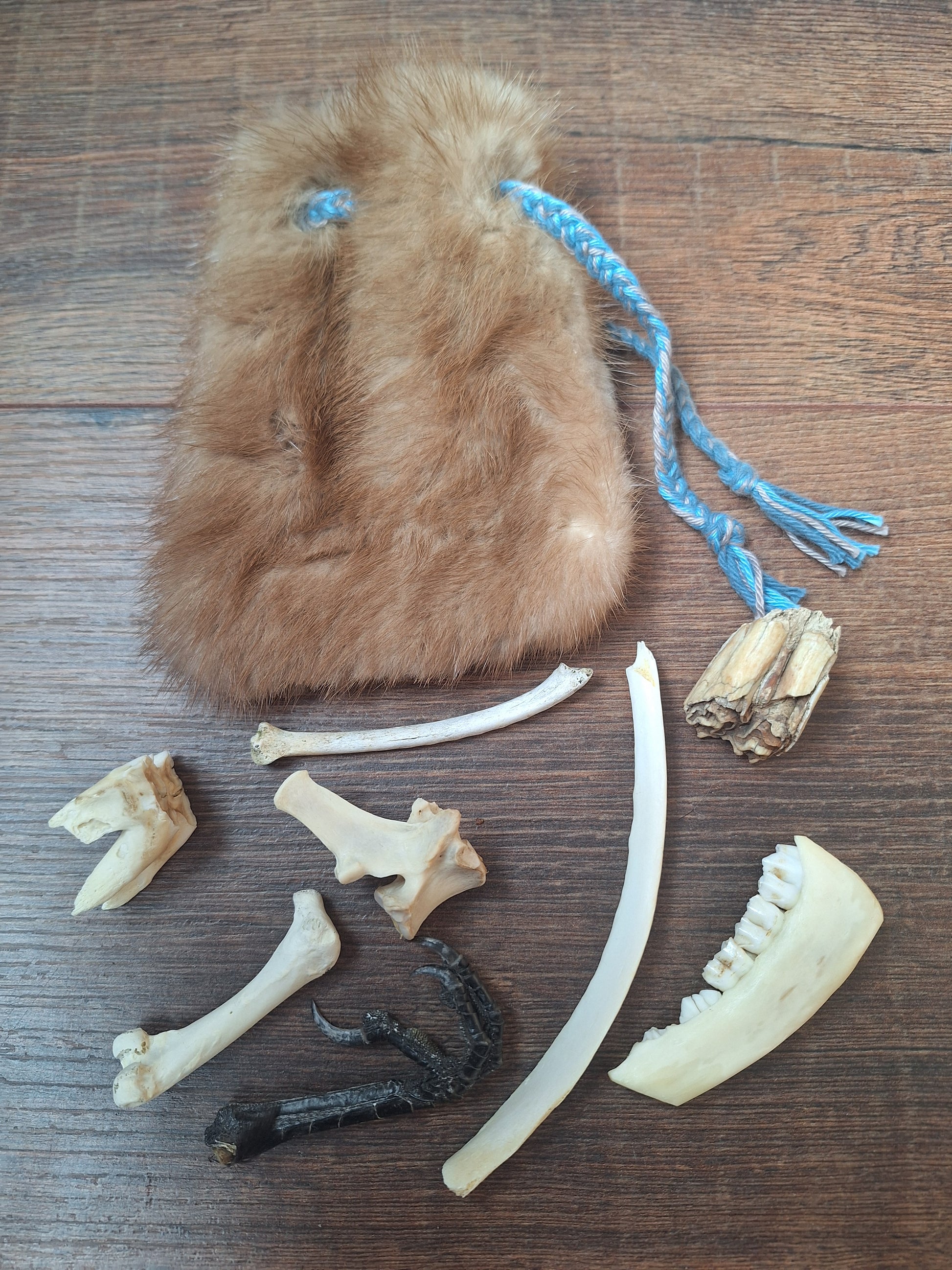 The oracle sets are all unique. They come in different sizes, with different natural items and in different pouches. The pouches have all been hand-sewn from scrap materials, such as left-over pieces of fur, hide or wool. The bones, teeth and other animal parts used in them, are often B-quality; they can be a bit damaged, discolored or broken. Using these ‘not perfect’ materials and items in these sets, serves a double function. On the one hand this is because of a deep respect for the natural world; using items that otherwise would maybe be thrown away. And on the other hand, we can offer you these sets now for a reasonable low price, a nice way to try out if this kind of divination works for you.
