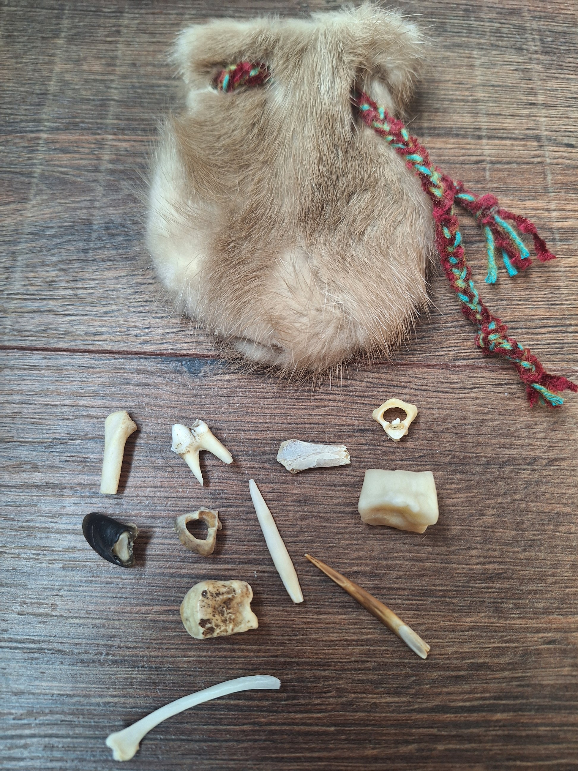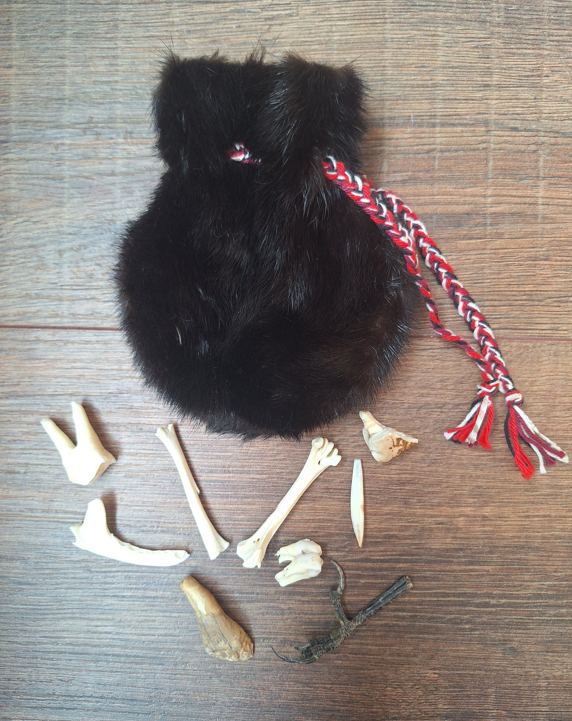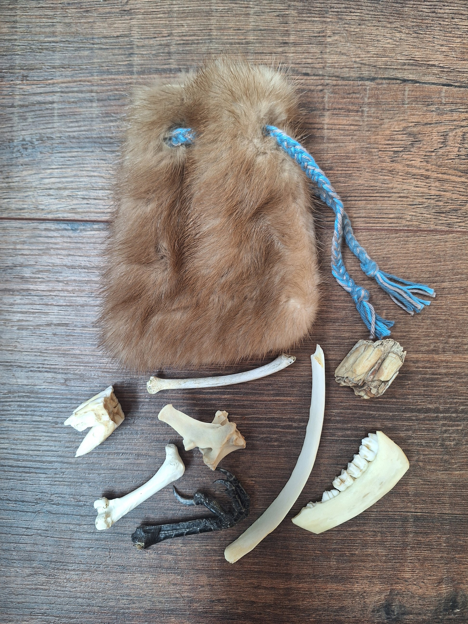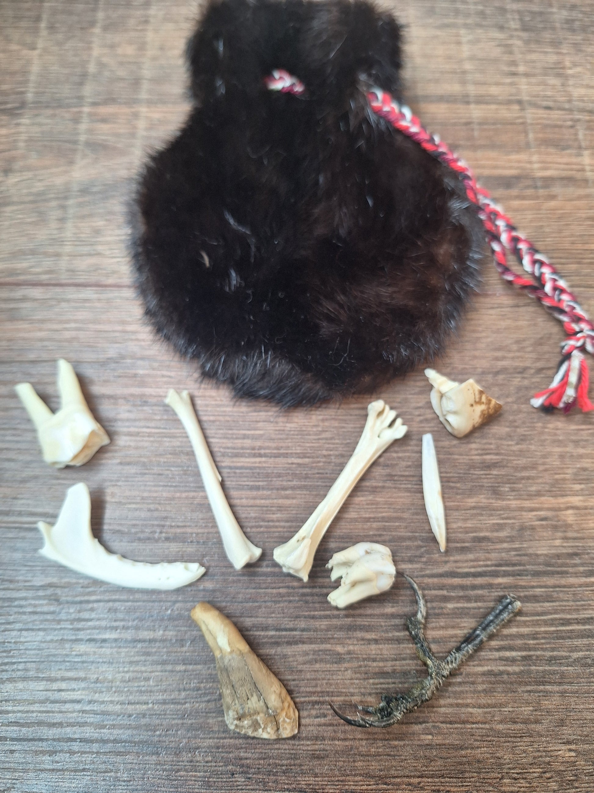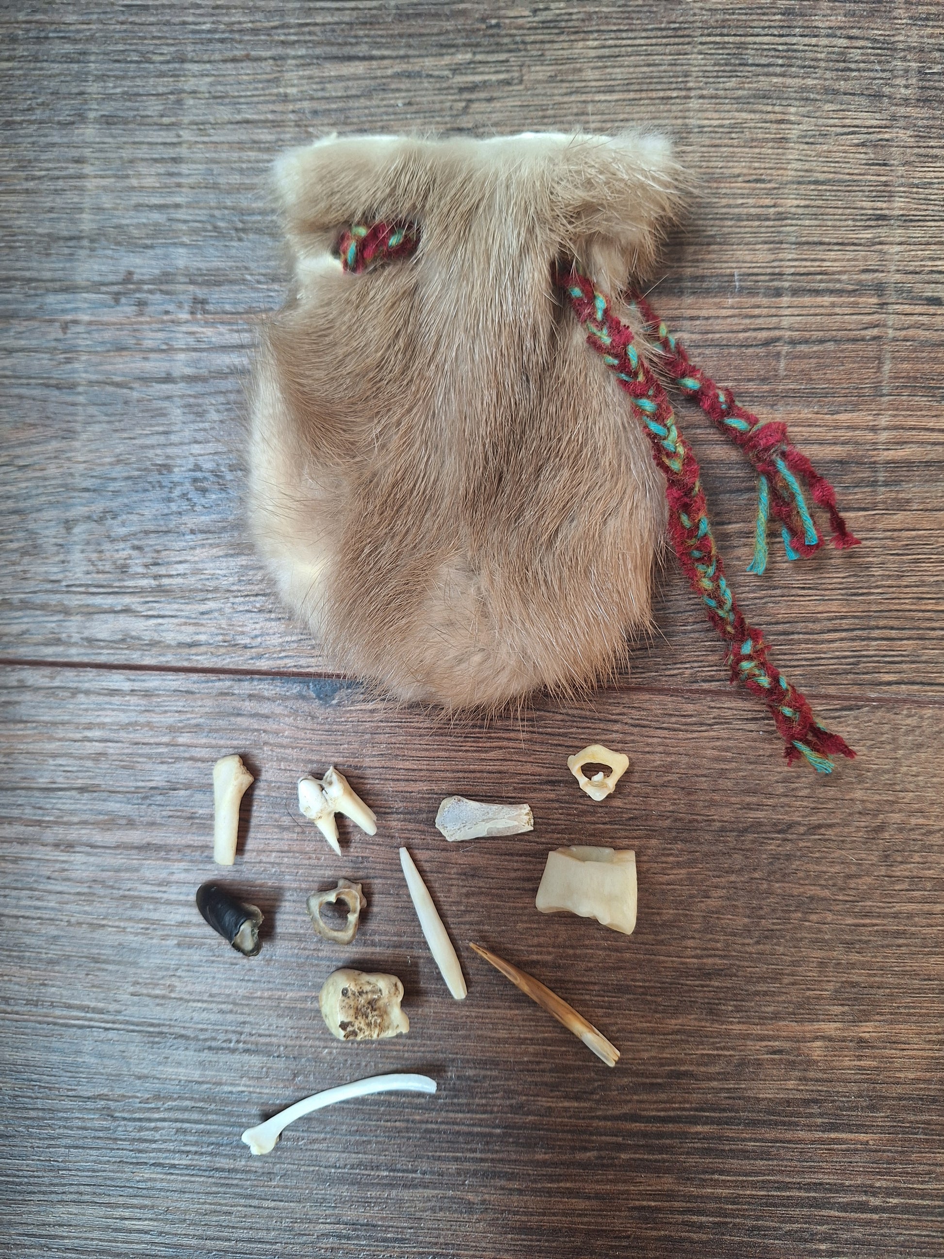The oracle sets are all unique. They come in different sizes, with different natural items and in different pouches. The pouches have all been hand-sewn from scrap materials, such as left-over pieces of fur, hide or wool. The bones, teeth and other animal parts used in them, are often B-quality; they can be a bit damaged, discolored or broken. Using these ‘not perfect’ materials and items in these sets, serves a double function. On the one hand this is because of a deep respect for the natural world; using items that otherwise would maybe be thrown away. And on the other hand, we can offer you these sets now for a reasonable low price, a nice way to try out if this kind of divination works for you.