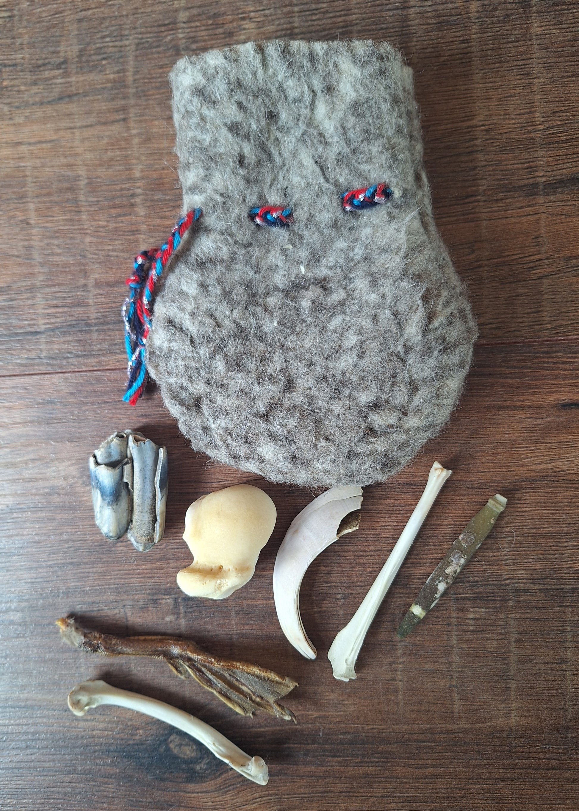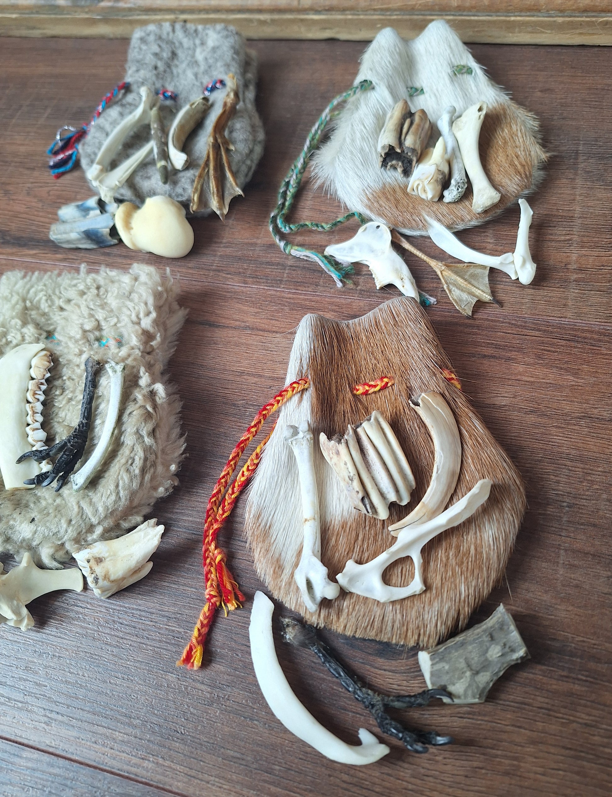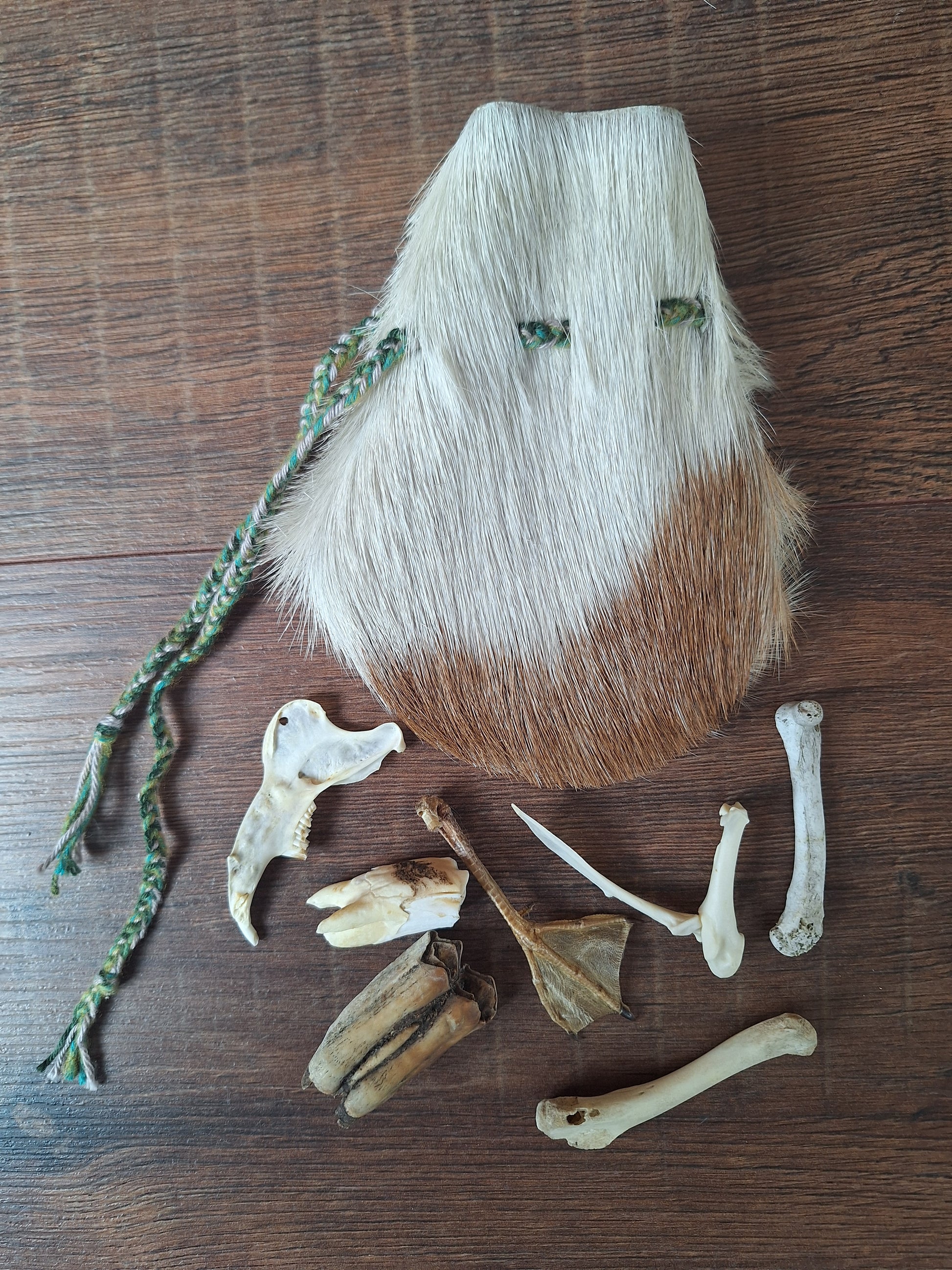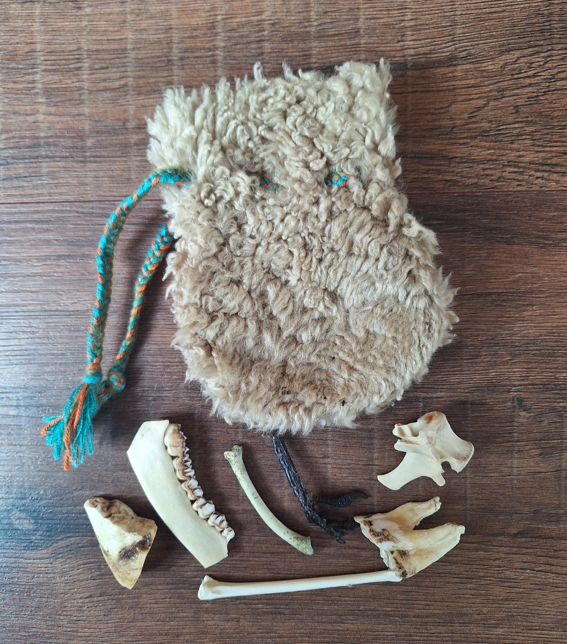 The oracle sets are all unique. They come in different sizes, with different natural items and in different pouches. The pouches have all been hand-sewn from scrap materials, such as left-over pieces of fur, hide or wool. The bones, teeth and other animal parts used in them, are often B-quality; they can be a bit damaged, discolored or broken. Using these ‘not perfect’ materials and items in these sets, serves a double function. On the one hand this is because of a deep respect for the natural world; using items that otherwise would maybe be thrown away. And on the other hand, we can offer you these sets now for a reasonable low price, a nice way to try out if this kind of divination works for you.