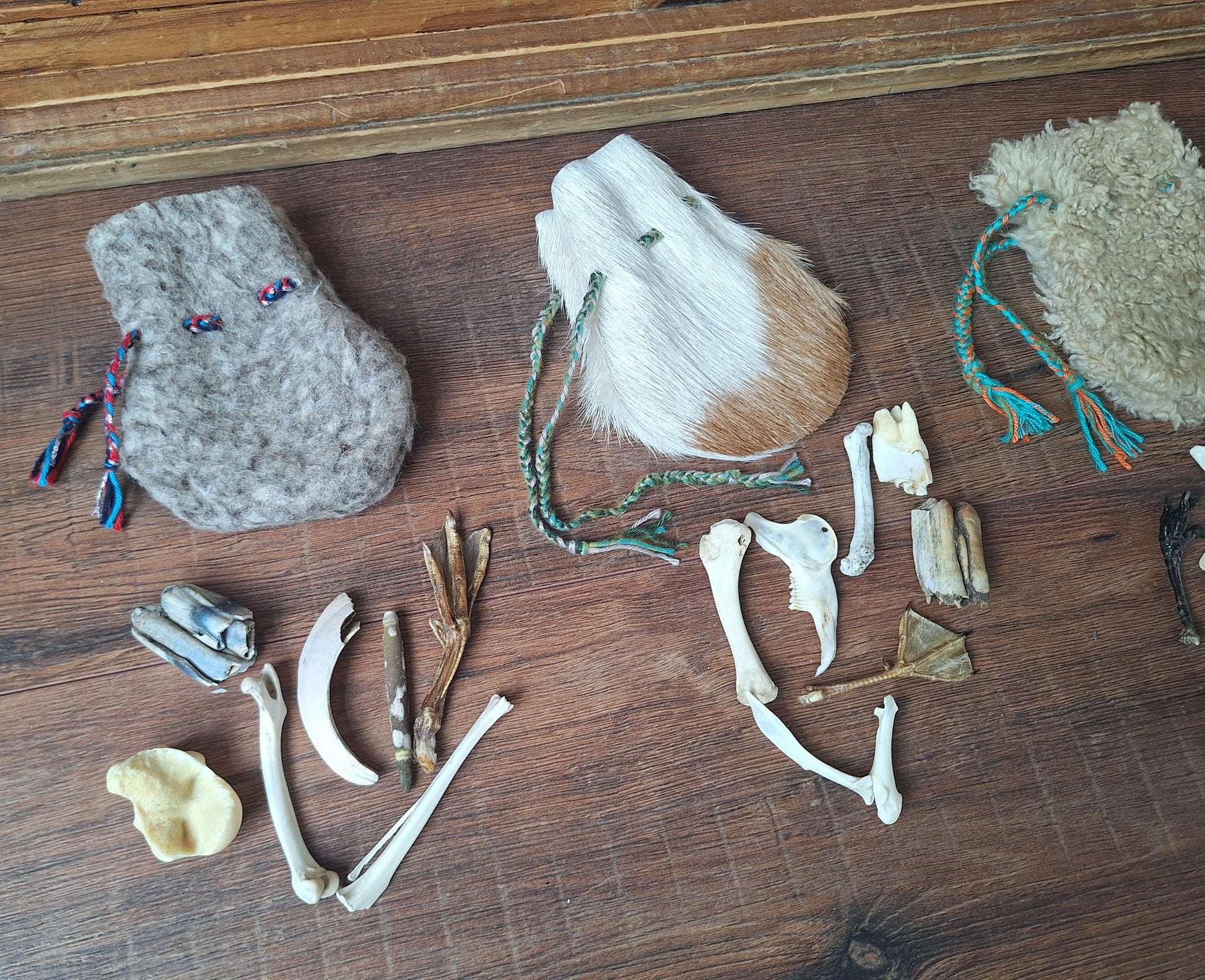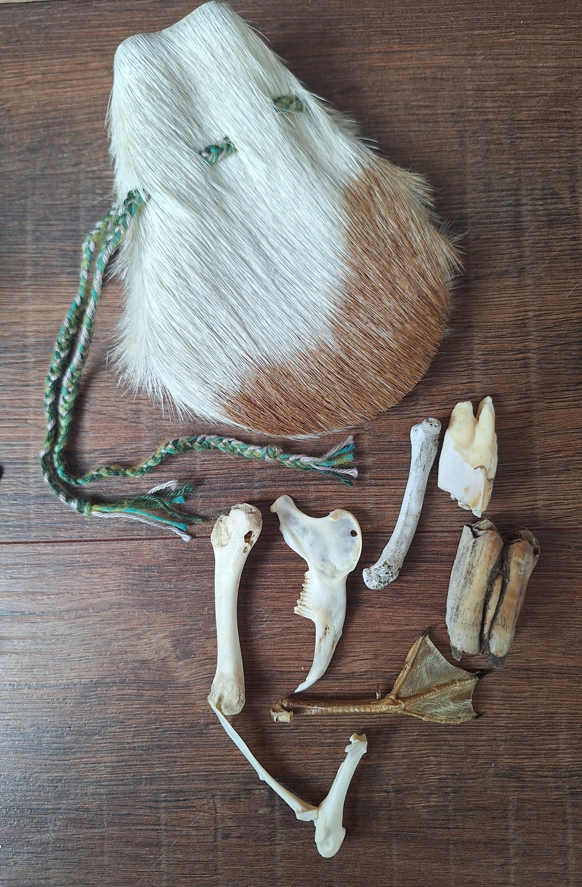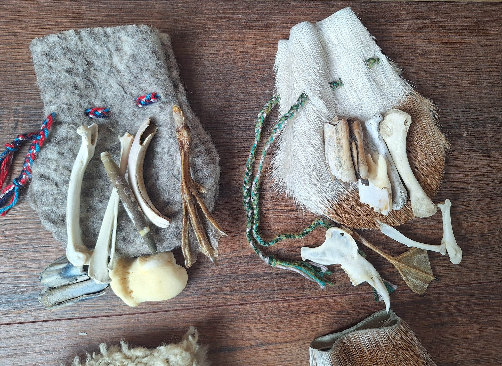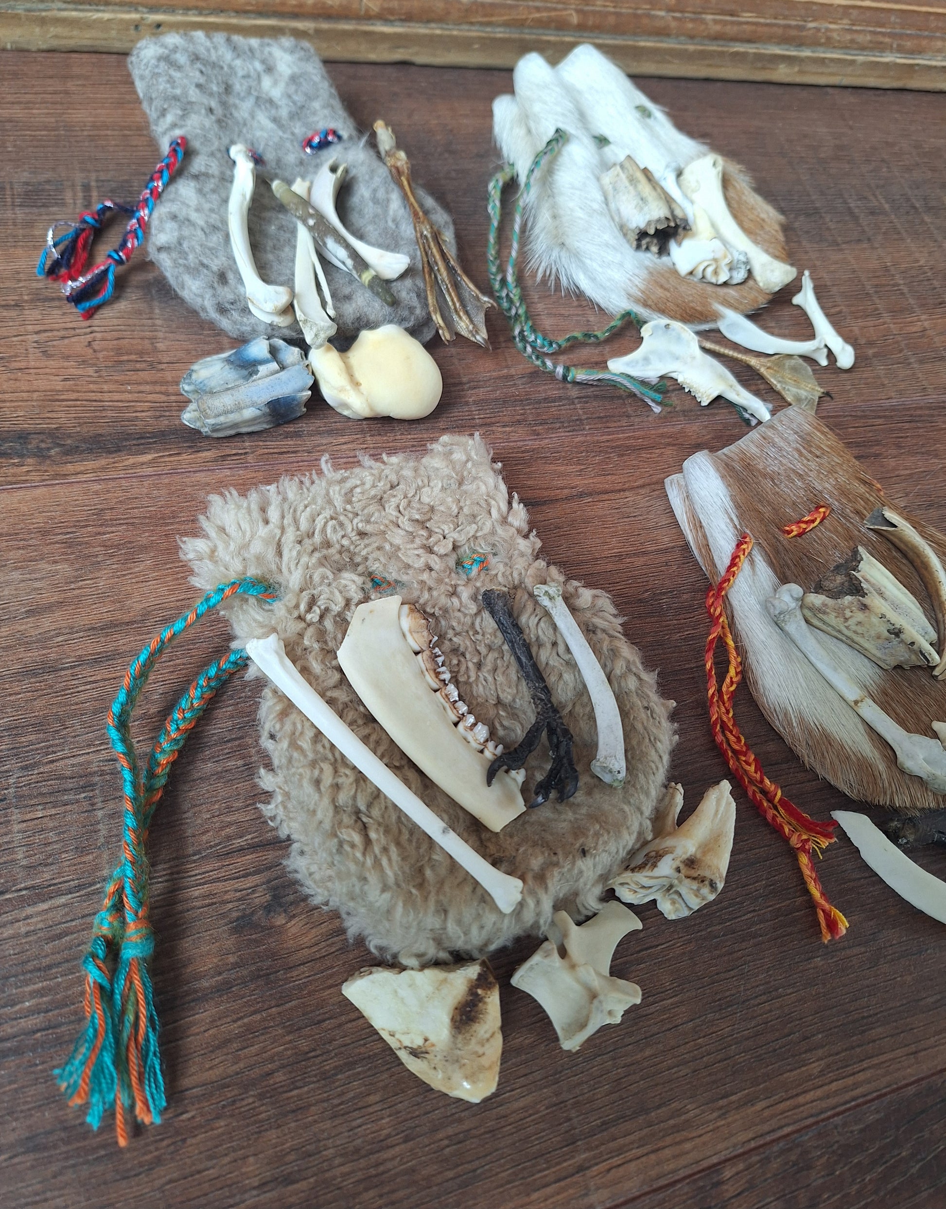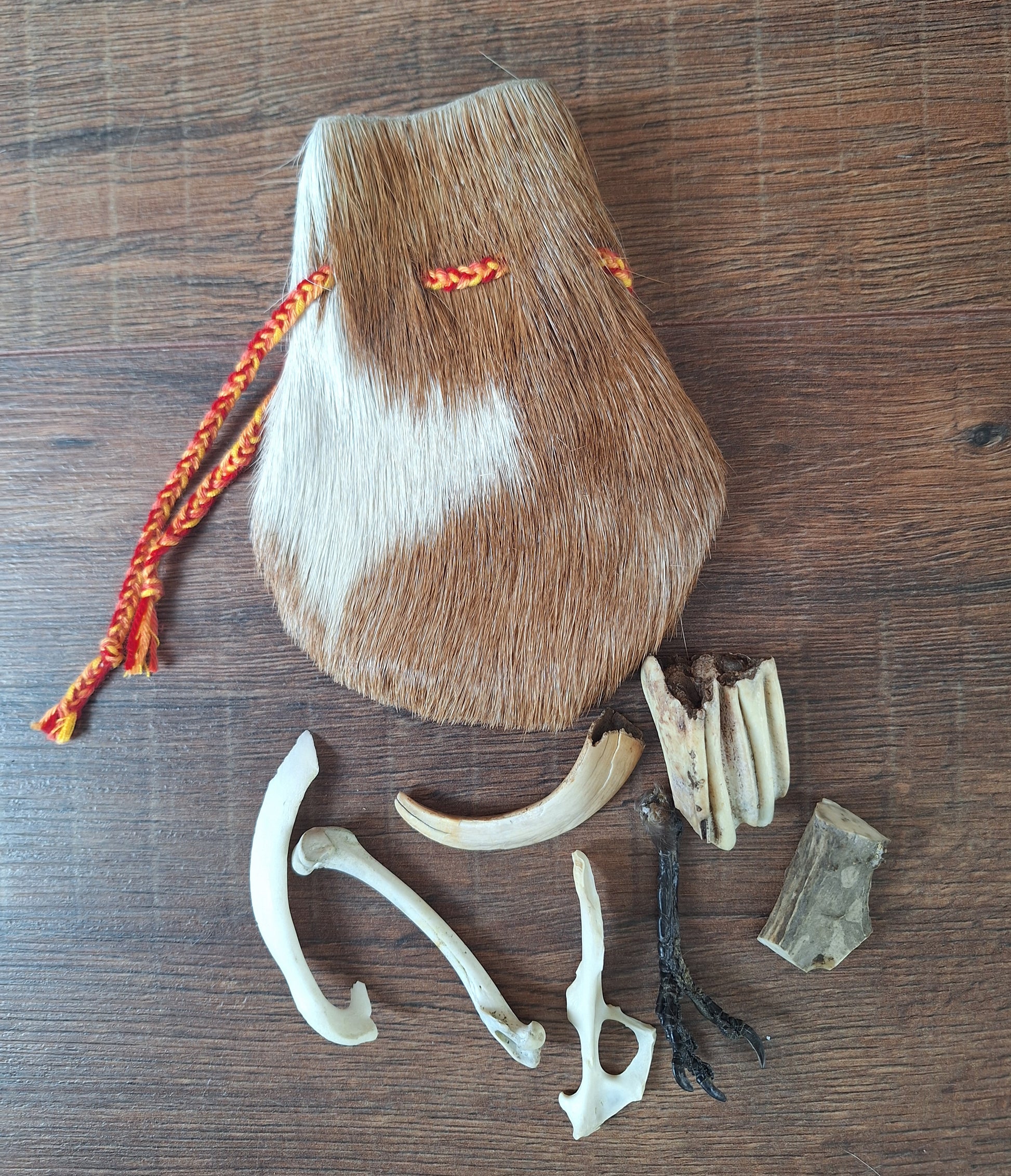 The oracle sets are all unique. They come in different sizes, with different natural items and in different pouches. The pouches have all been hand-sewn from scrap materials, such as left-over pieces of fur, hide or wool. The bones, teeth and other animal parts used in them, are often B-quality; they can be a bit damaged, discolored or broken. Using these ‘not perfect’ materials and items in these sets, serves a double function. On the one hand this is because of a deep respect for the natural world; using items that otherwise would maybe be thrown away. And on the other hand, we can offer you these sets now for a reasonable low price, a nice way to try out if this kind of divination works for you.