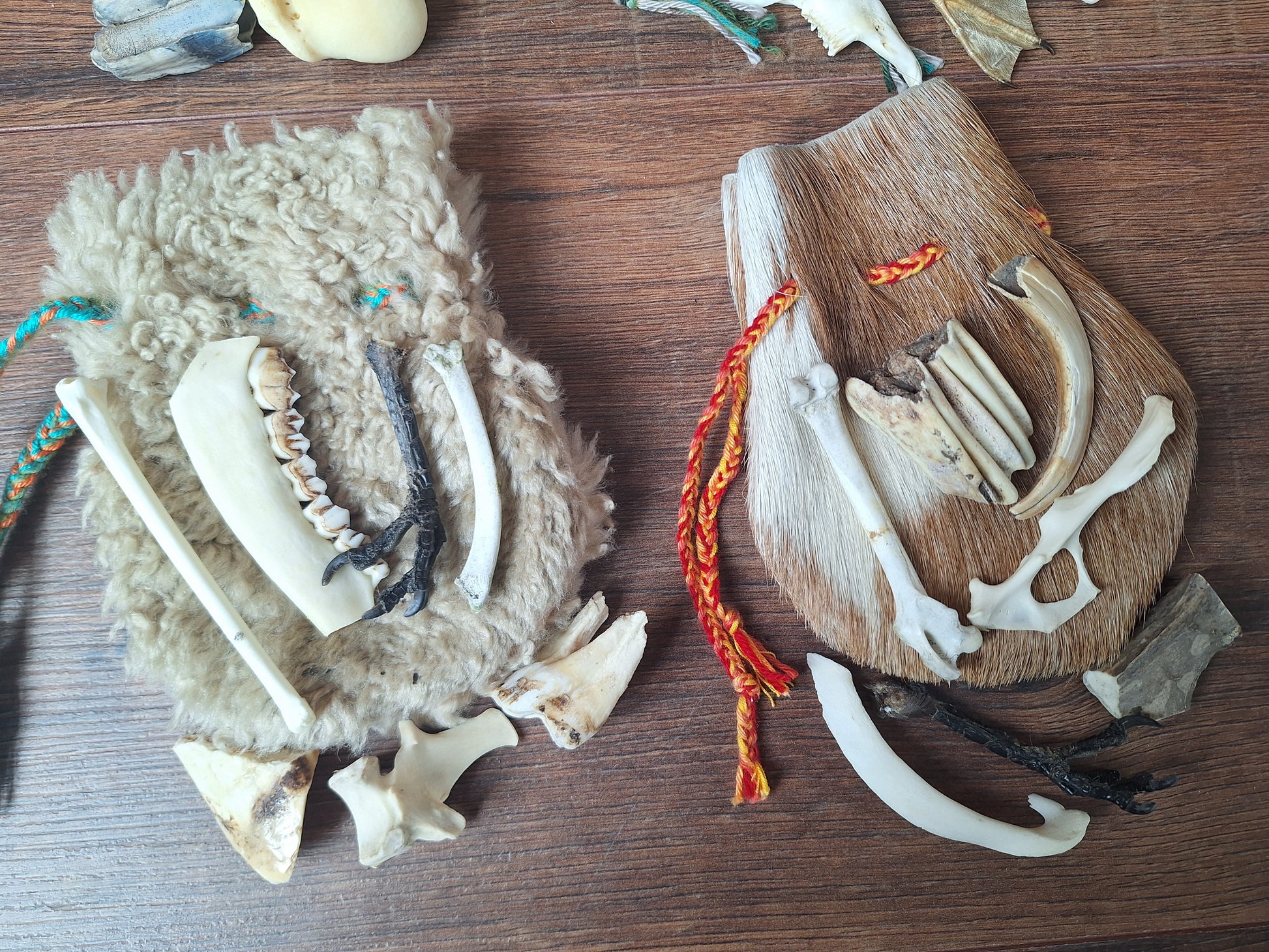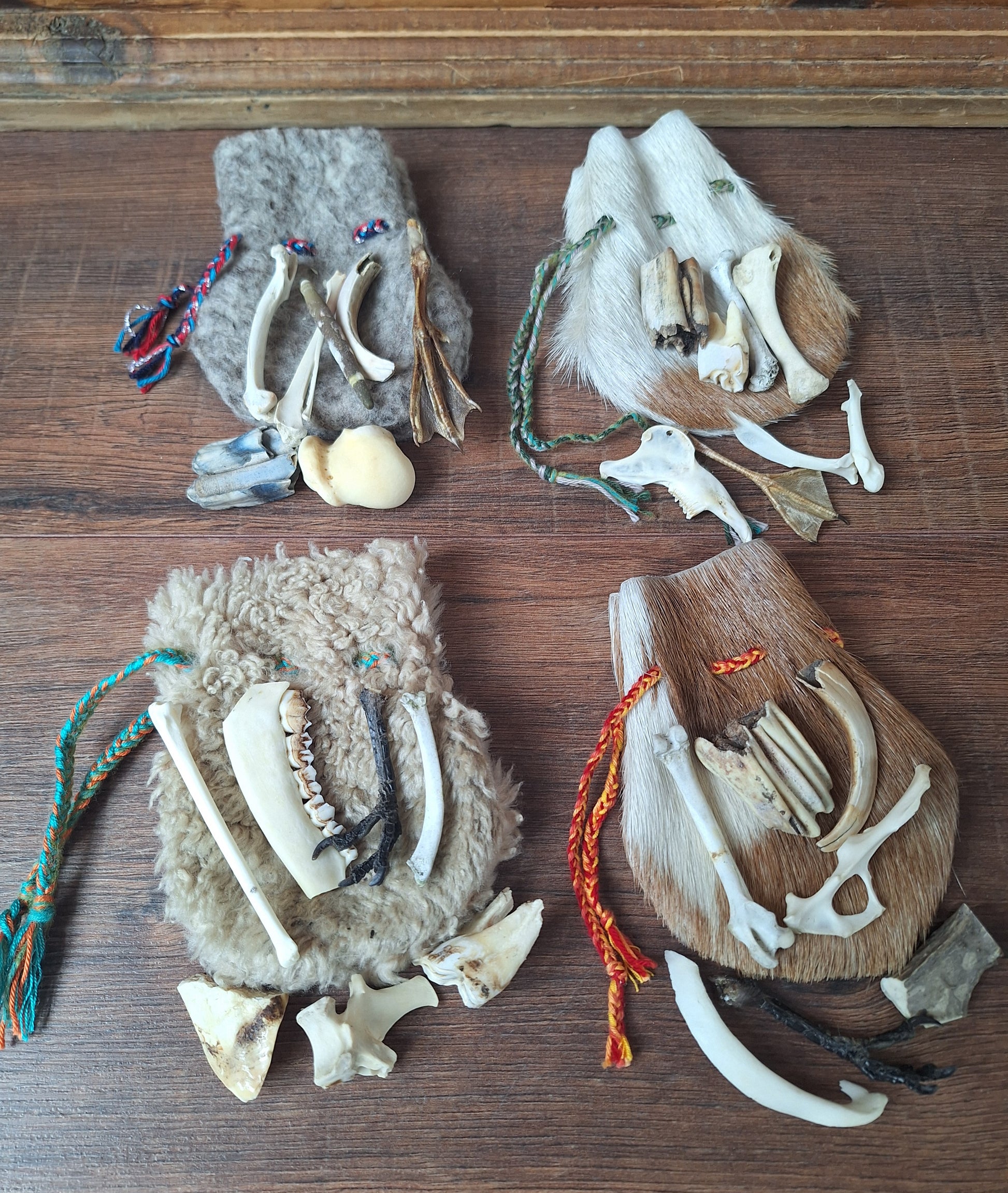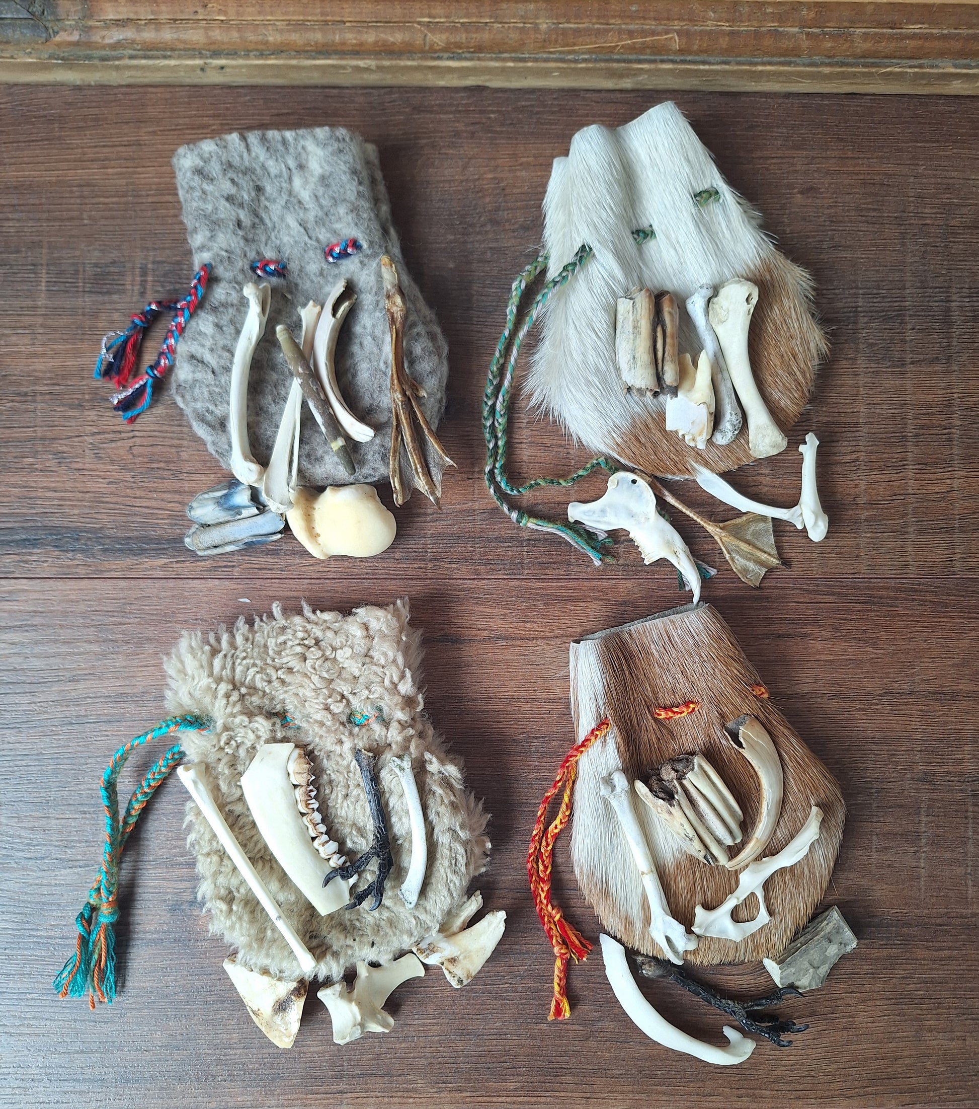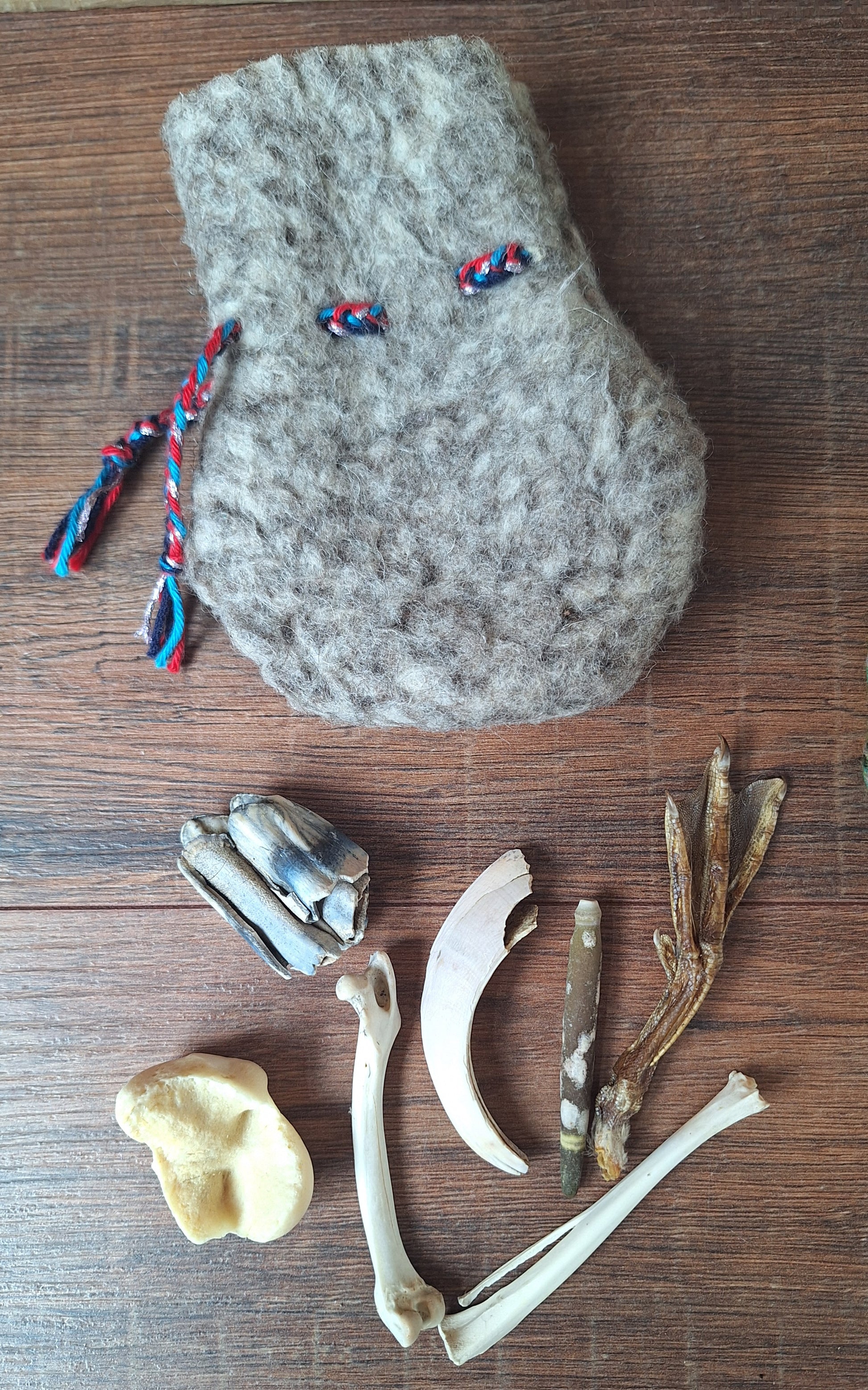 The oracle sets are all unique. They come in different sizes, with different natural items and in different pouches. The pouches have all been hand-sewn from scrap materials, such as left-over pieces of fur, hide or wool. The bones, teeth and other animal parts used in them, are often B-quality; they can be a bit damaged, discolored or broken. Using these ‘not perfect’ materials and items in these sets, serves a double function. On the one hand this is because of a deep respect for the natural world; using items that otherwise would maybe be thrown away. And on the other hand, we can offer you these sets now for a reasonable low price, a nice way to try out if this kind of divination works for you.