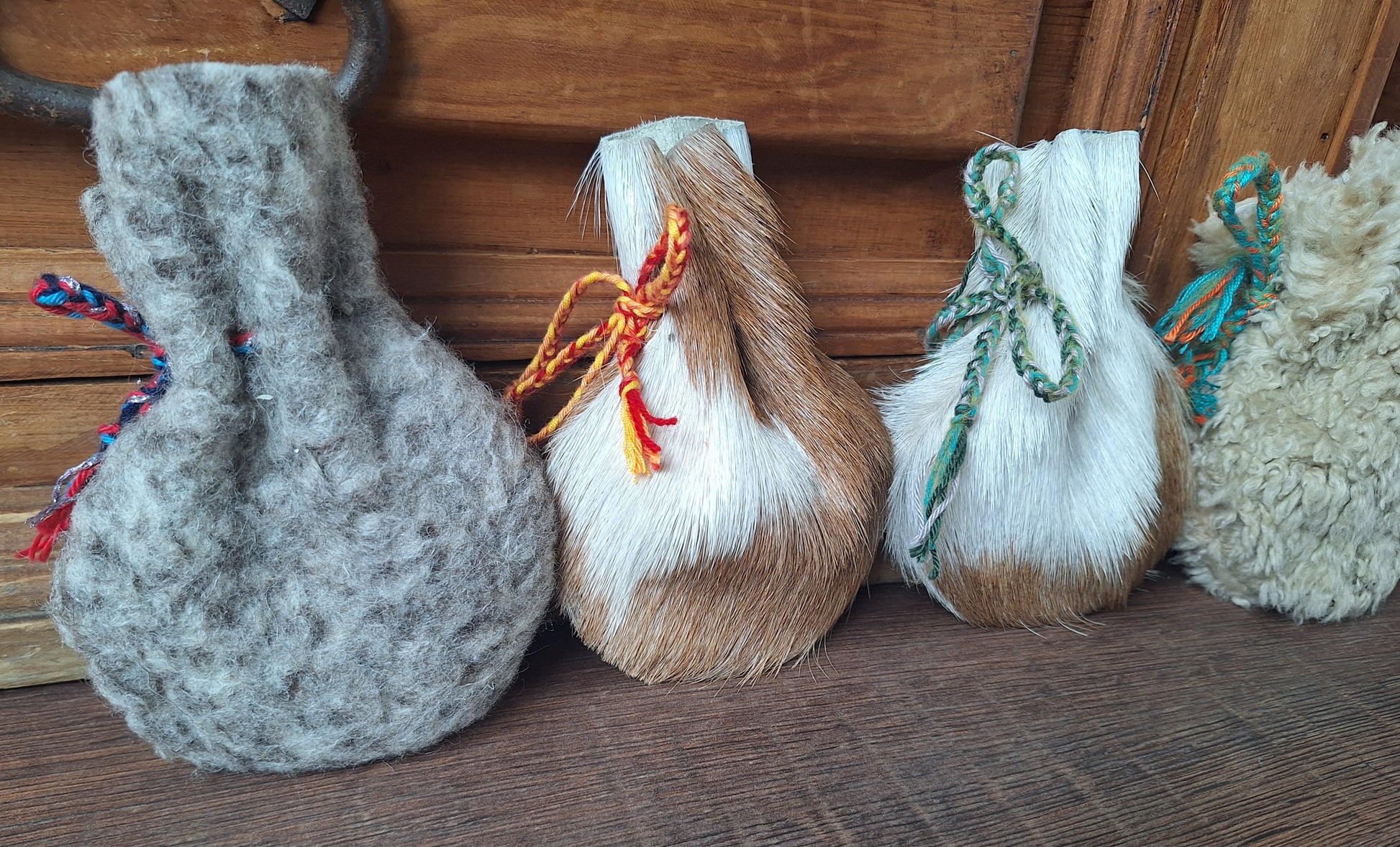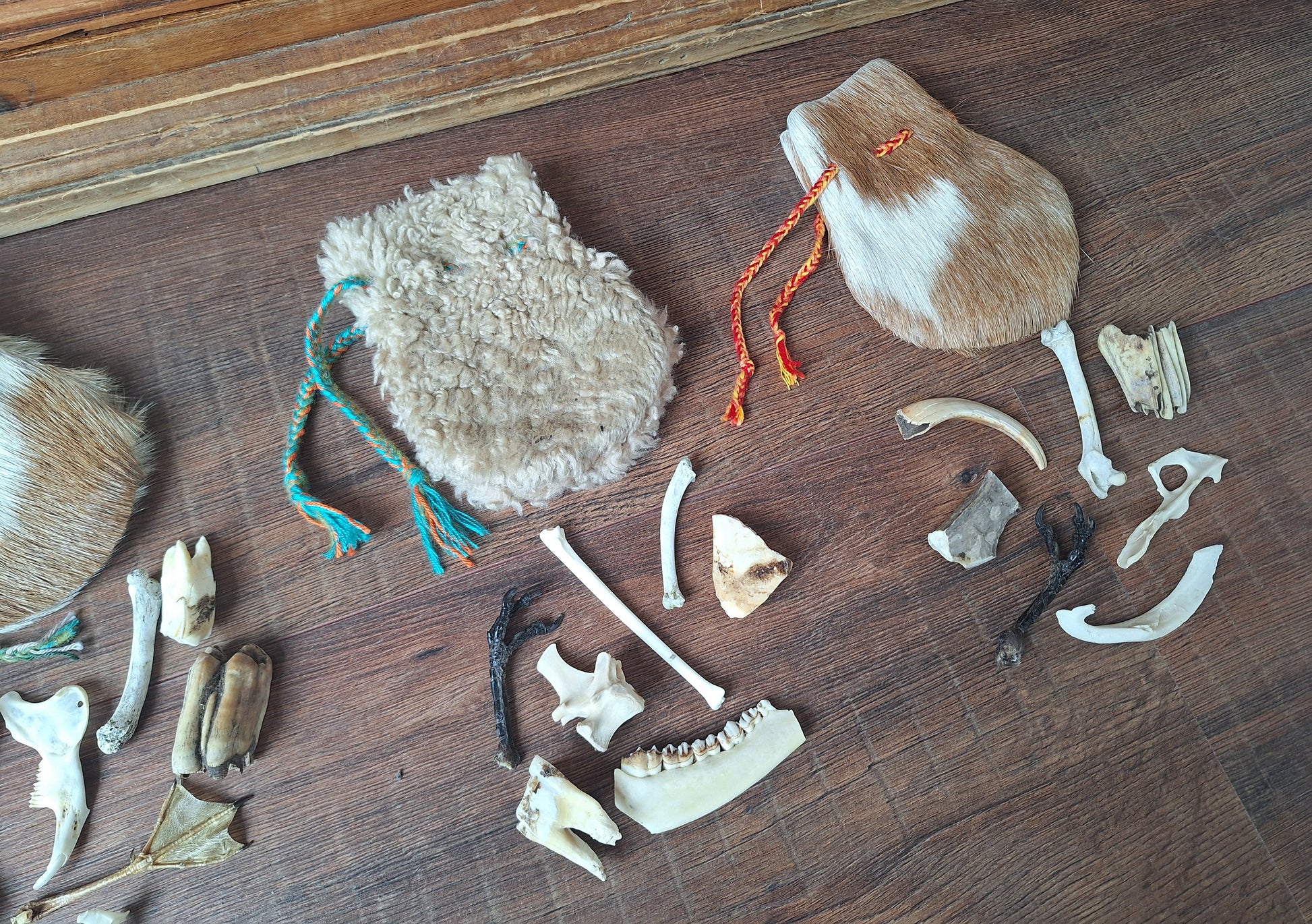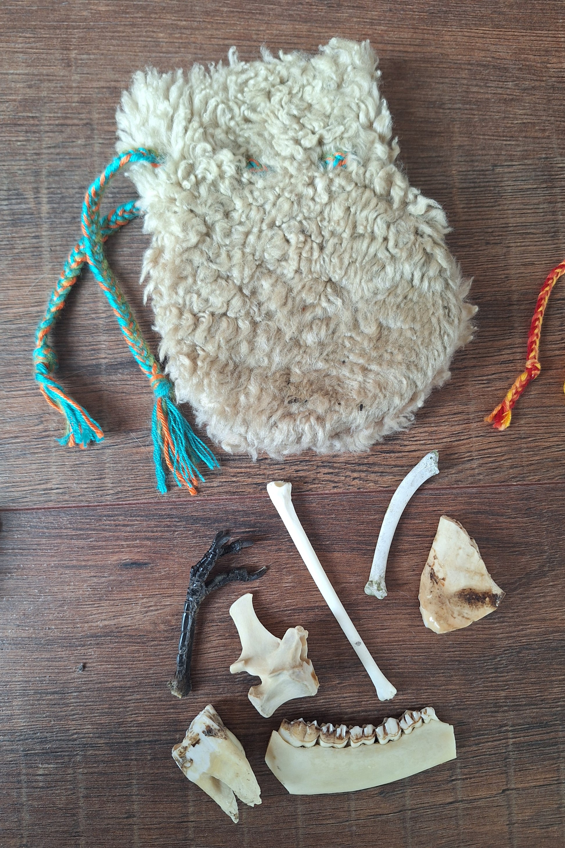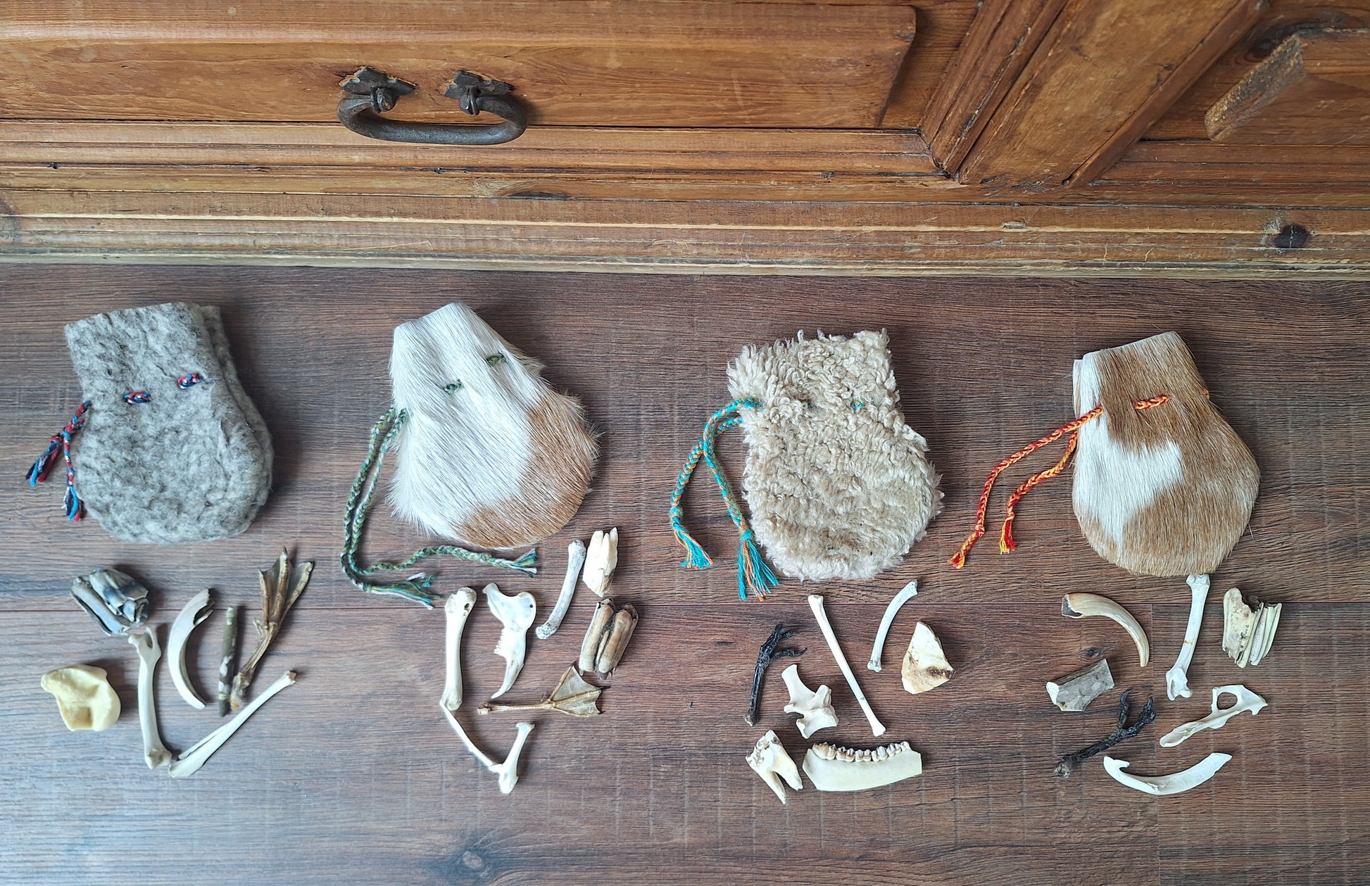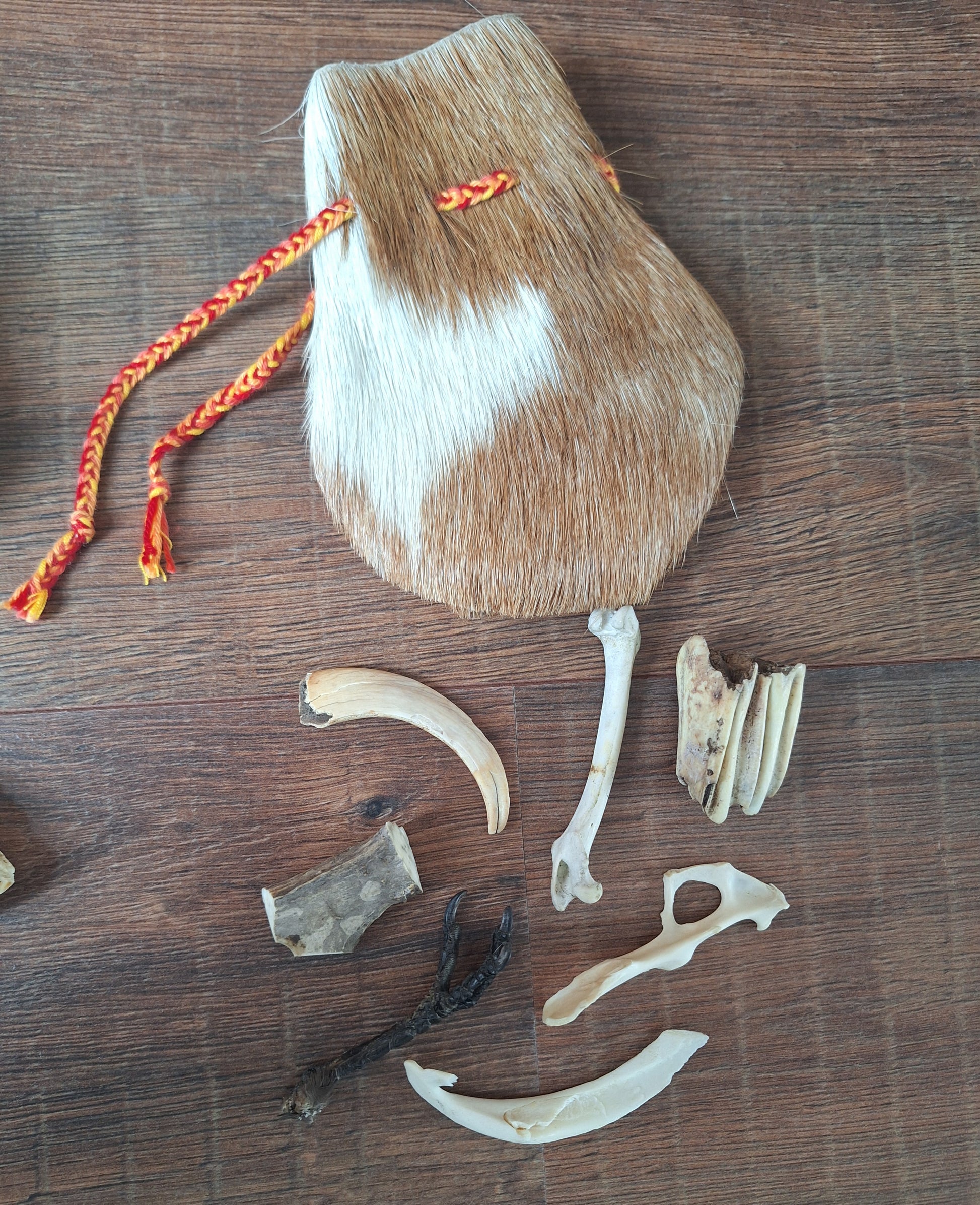 The oracle sets are all unique. They come in different sizes, with different natural items and in different pouches. The pouches have all been hand-sewn from scrap materials, such as left-over pieces of fur, hide or wool. The bones, teeth and other animal parts used in them, are often B-quality; they can be a bit damaged, discolored or broken. Using these ‘not perfect’ materials and items in these sets, serves a double function. On the one hand this is because of a deep respect for the natural world; using items that otherwise would maybe be thrown away. And on the other hand, we can offer you these sets now for a reasonable low price, a nice way to try out if this kind of divination works for you.