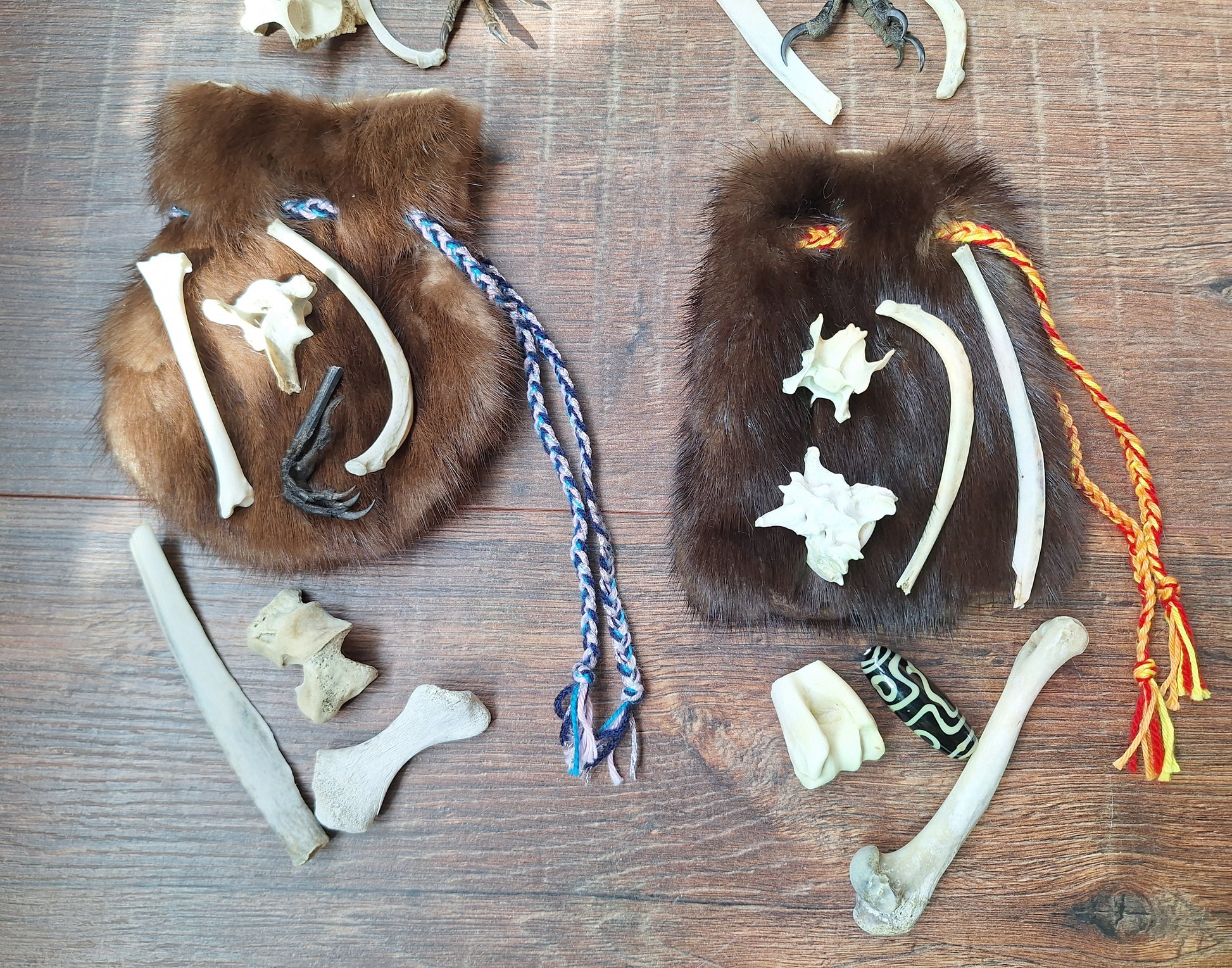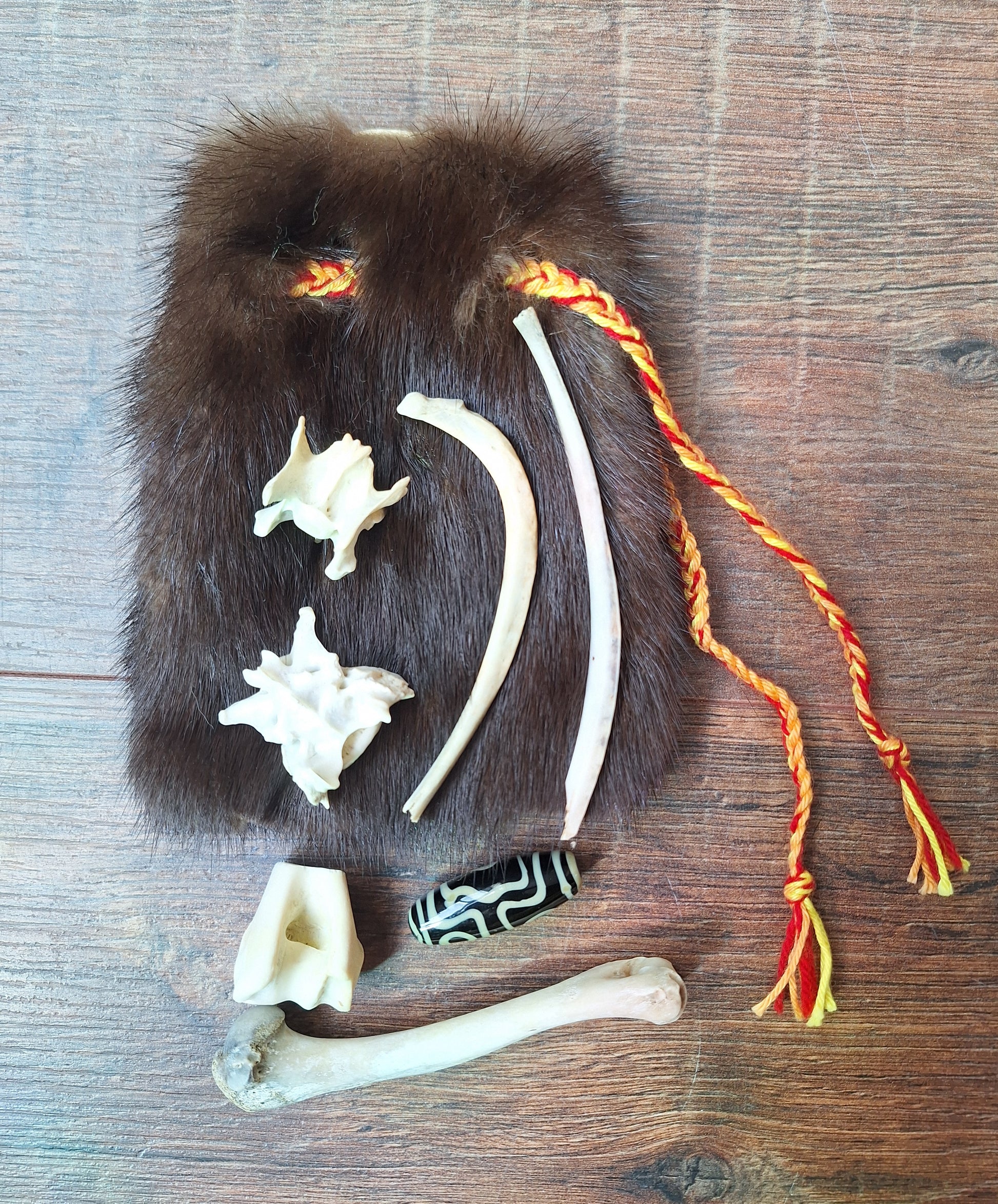 The oracle sets are all unique. They come in different sizes, with different natural items and in different pouches. The pouches have all been hand-sewn from scrap materials, such as left-over pieces of fur, hide or wool. The bones, teeth and other animal parts used in them, are often B-quality; they can be a bit damaged, discolored or broken. Using these ‘not perfect’ materials and items in these sets, serves a double function. On the one hand this is because of a deep respect for the natural world; using items that otherwise would maybe be thrown away. And on the other hand, we can offer you these sets now for a reasonable low price, a nice way to try out if this kind of divination works for you.