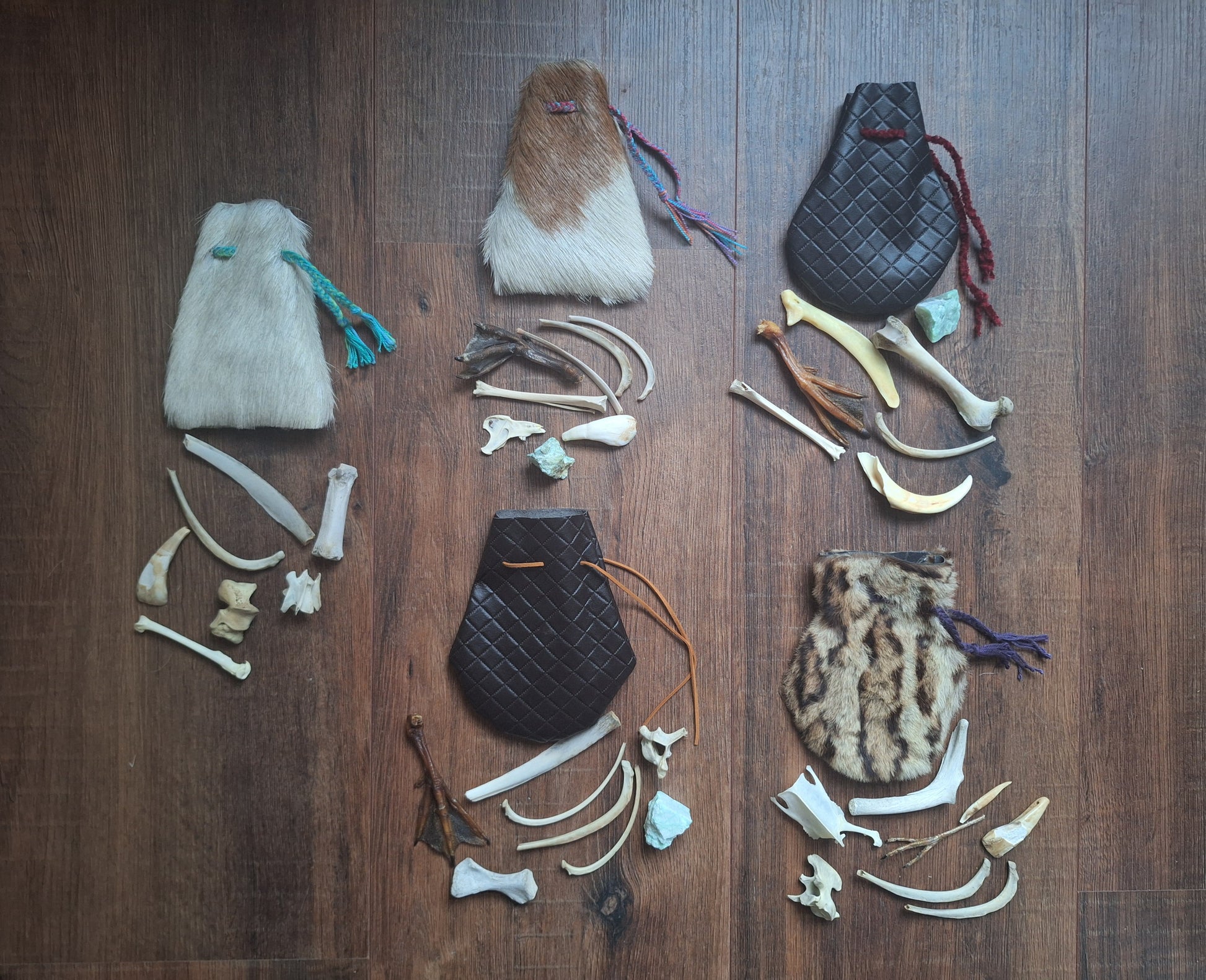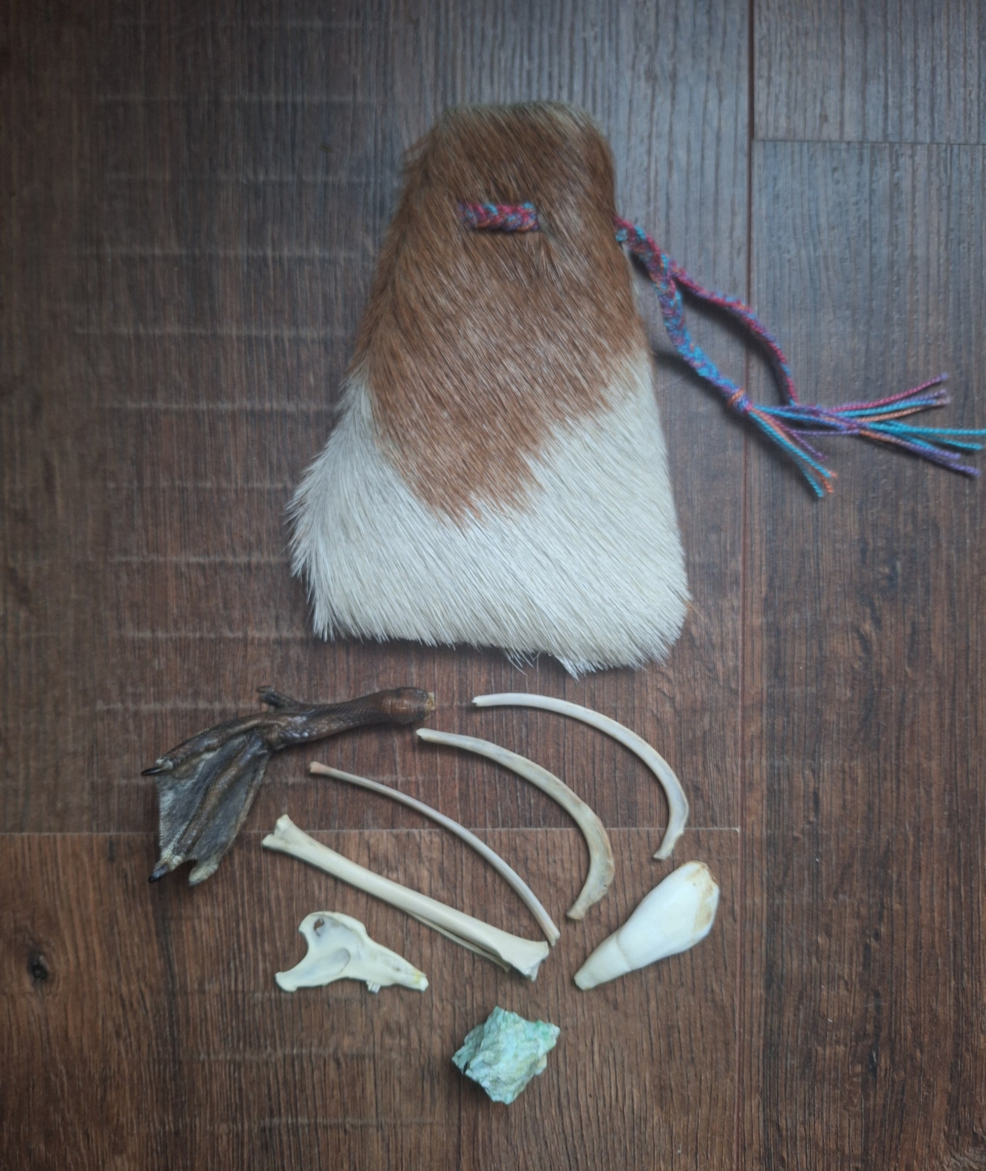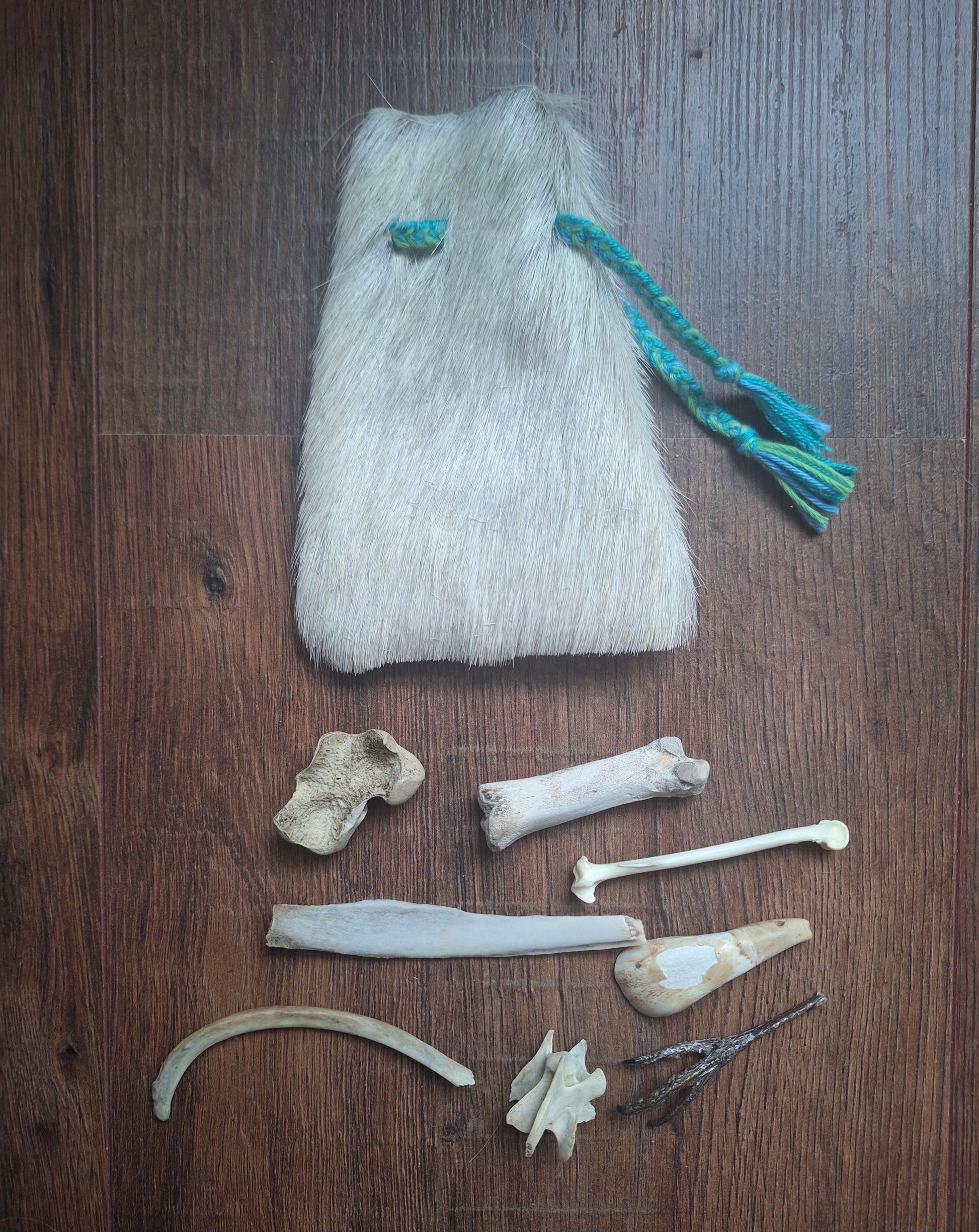 The oracle sets are all unique. They come in different sizes, with different natural items and in different pouches. The pouches have all been hand-sewn from scrap materials, such as left-over pieces of fur, hide or wool. The bones, teeth and other animal parts used in them, are often B-quality; they can be a bit damaged, discolored or broken. Using these ‘not perfect’ materials and items in these sets, serves a double function. On the one hand this is because of a deep respect for the natural world; using items that otherwise would maybe be thrown away. And on the other hand, we can offer you these sets now for a reasonable low price, a nice way to try out if this kind of divination works for you.