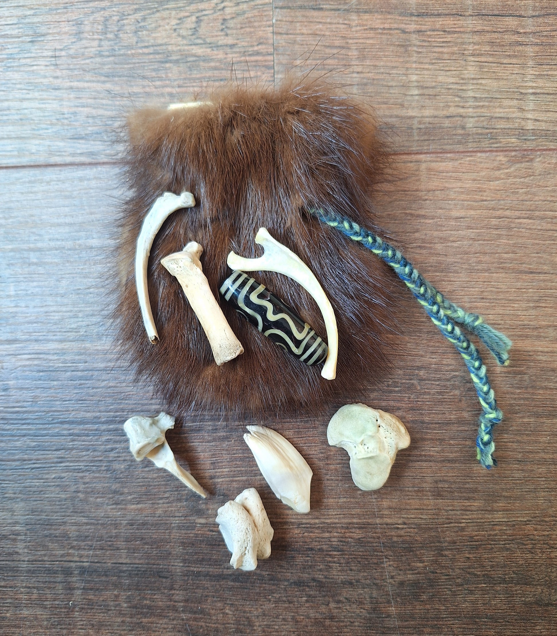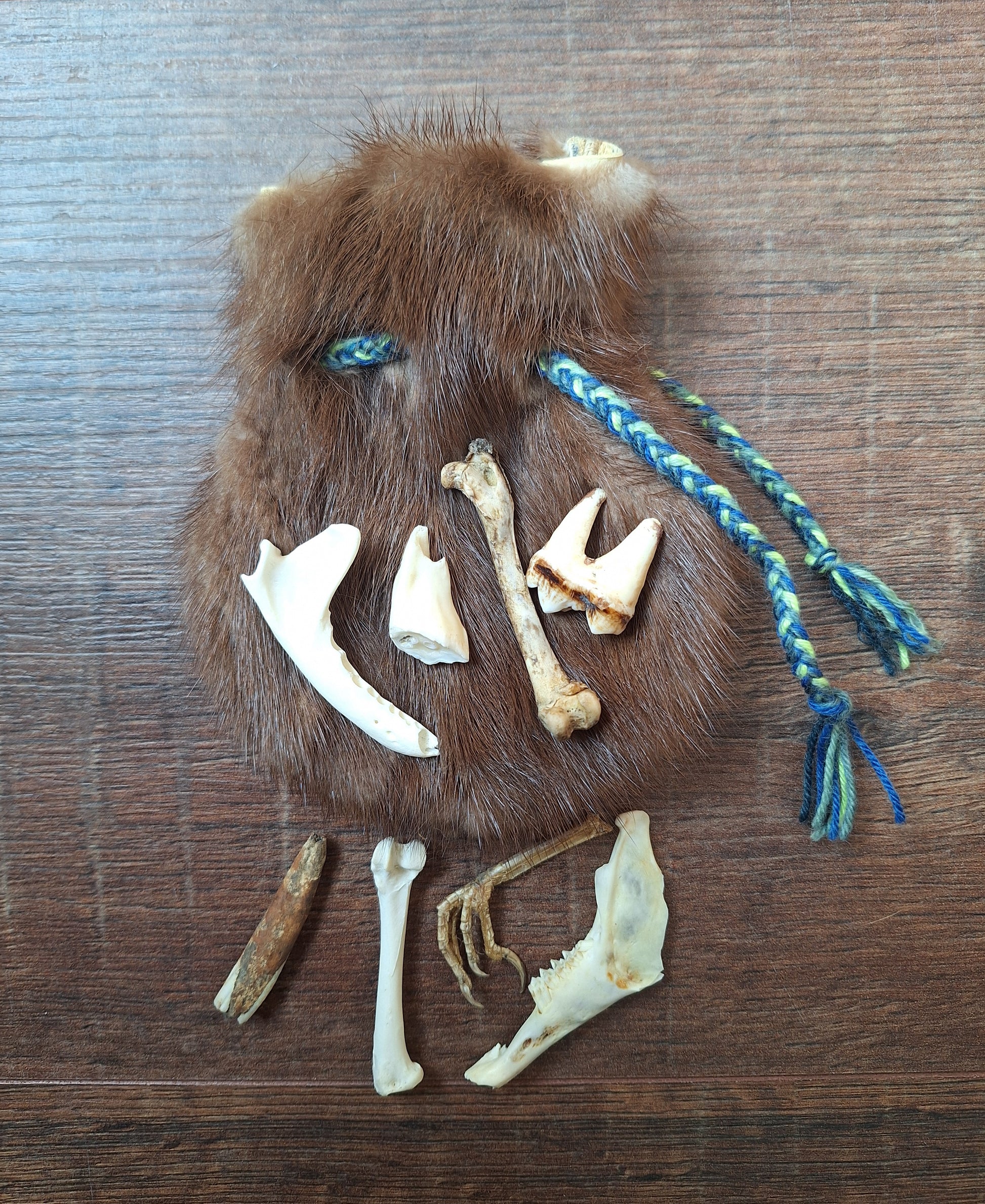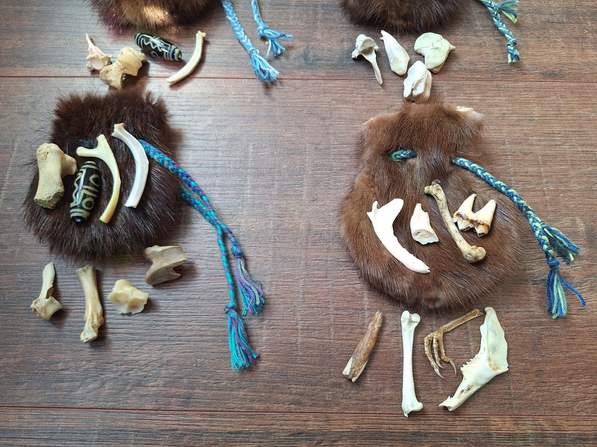 The oracle sets are all unique. They come in different sizes, with different natural items and in different pouches. The pouches have all been hand-sewn from scrap materials, such as left-over pieces of fur, hide or wool. The bones, teeth and other animal parts used in them, are often B-quality; they can be a bit damaged, discolored or broken. Using these ‘not perfect’ materials and items in these sets, serves a double function. On the one hand this is because of a deep respect for the natural world; using items that otherwise would maybe be thrown away. And on the other hand, we can offer you these sets now for a reasonable low price, a nice way to try out if this kind of divination works for you.