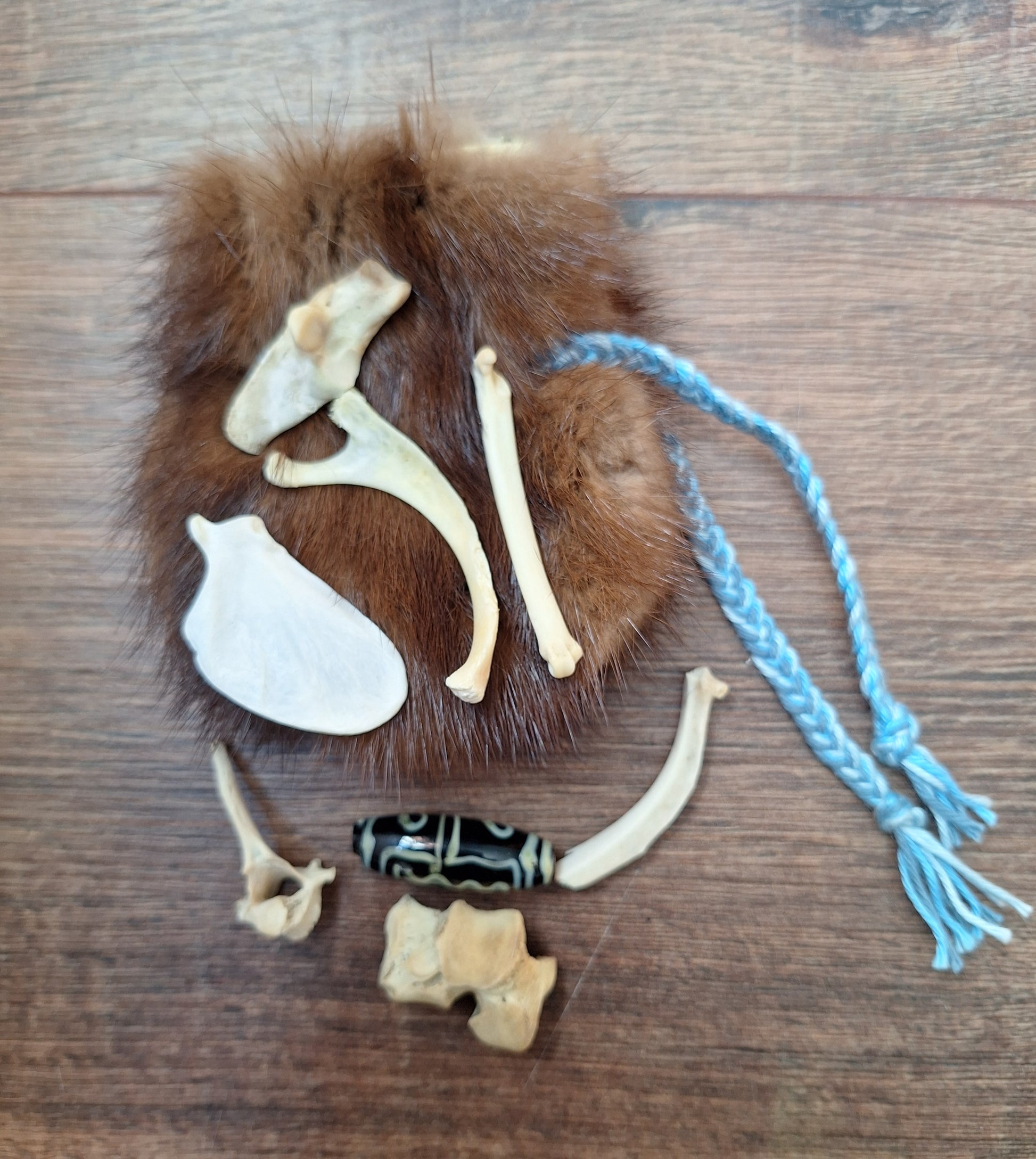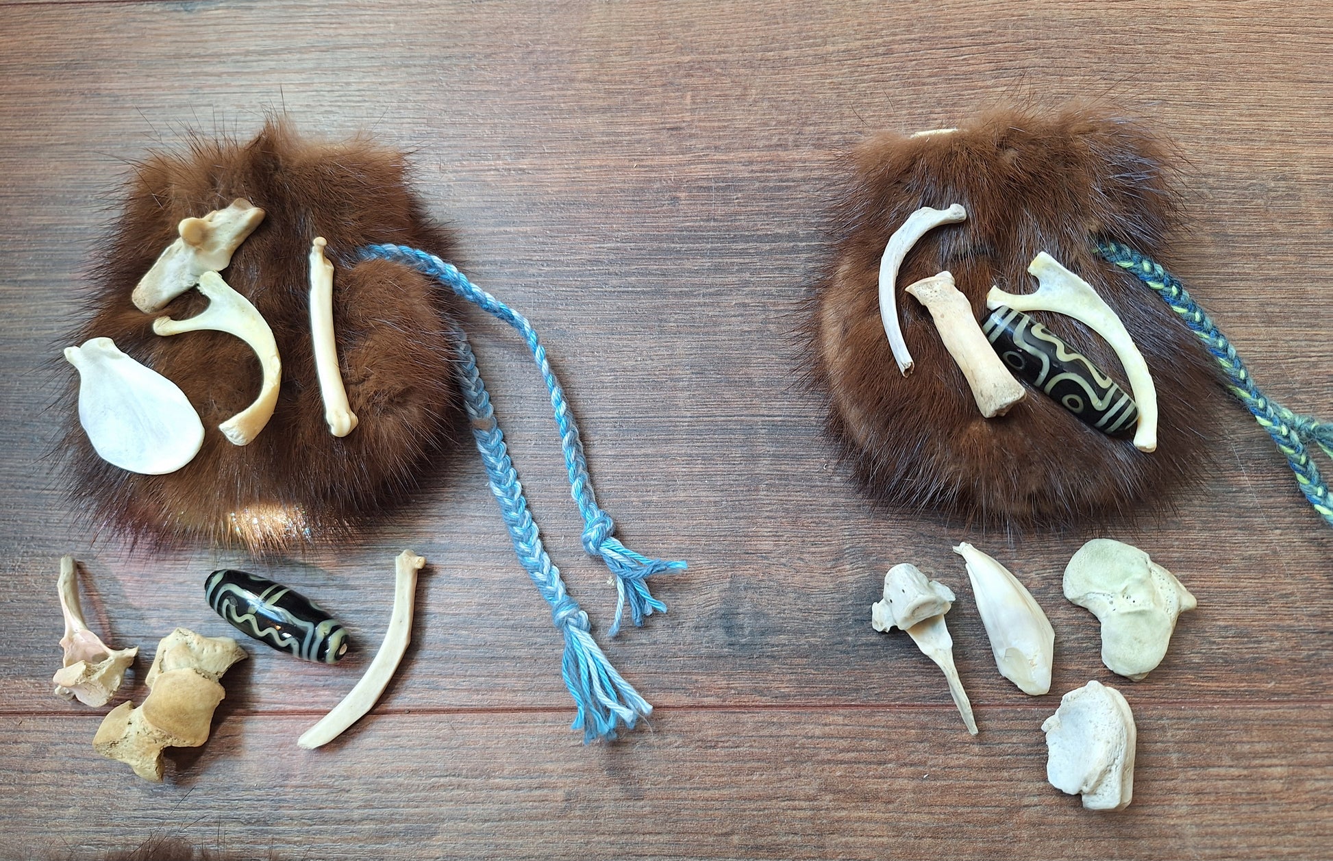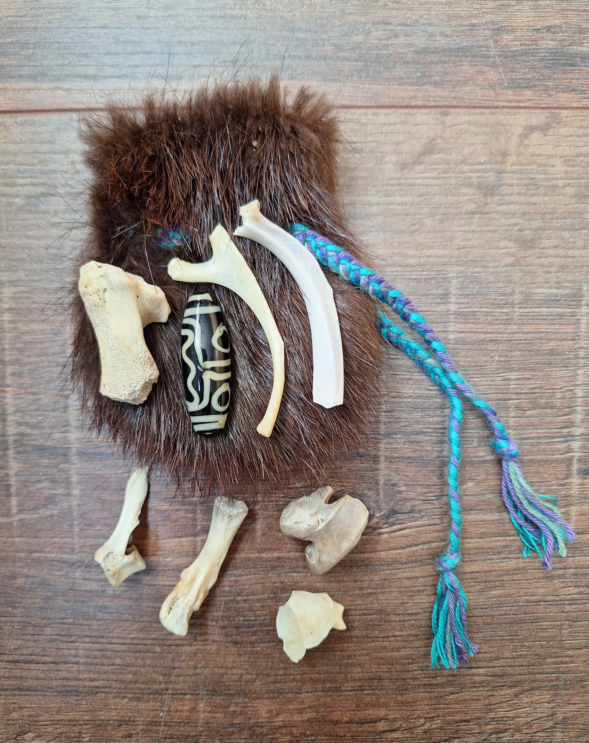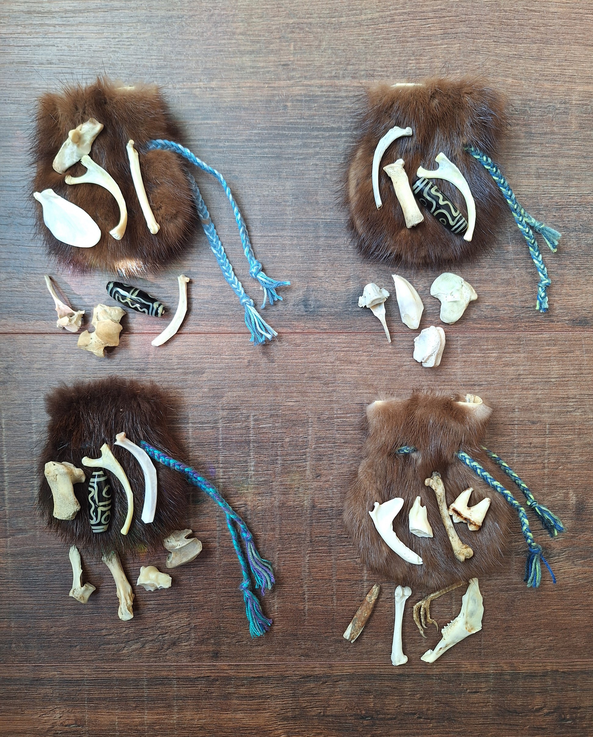 The oracle sets are all unique. They come in different sizes, with different natural items and in different pouches. The pouches have all been hand-sewn from scrap materials, such as left-over pieces of fur, hide or wool. The bones, teeth and other animal parts used in them, are often B-quality; they can be a bit damaged, discolored or broken. Using these ‘not perfect’ materials and items in these sets, serves a double function. On the one hand this is because of a deep respect for the natural world; using items that otherwise would maybe be thrown away. And on the other hand, we can offer you these sets now for a reasonable low price, a nice way to try out if this kind of divination works for you.