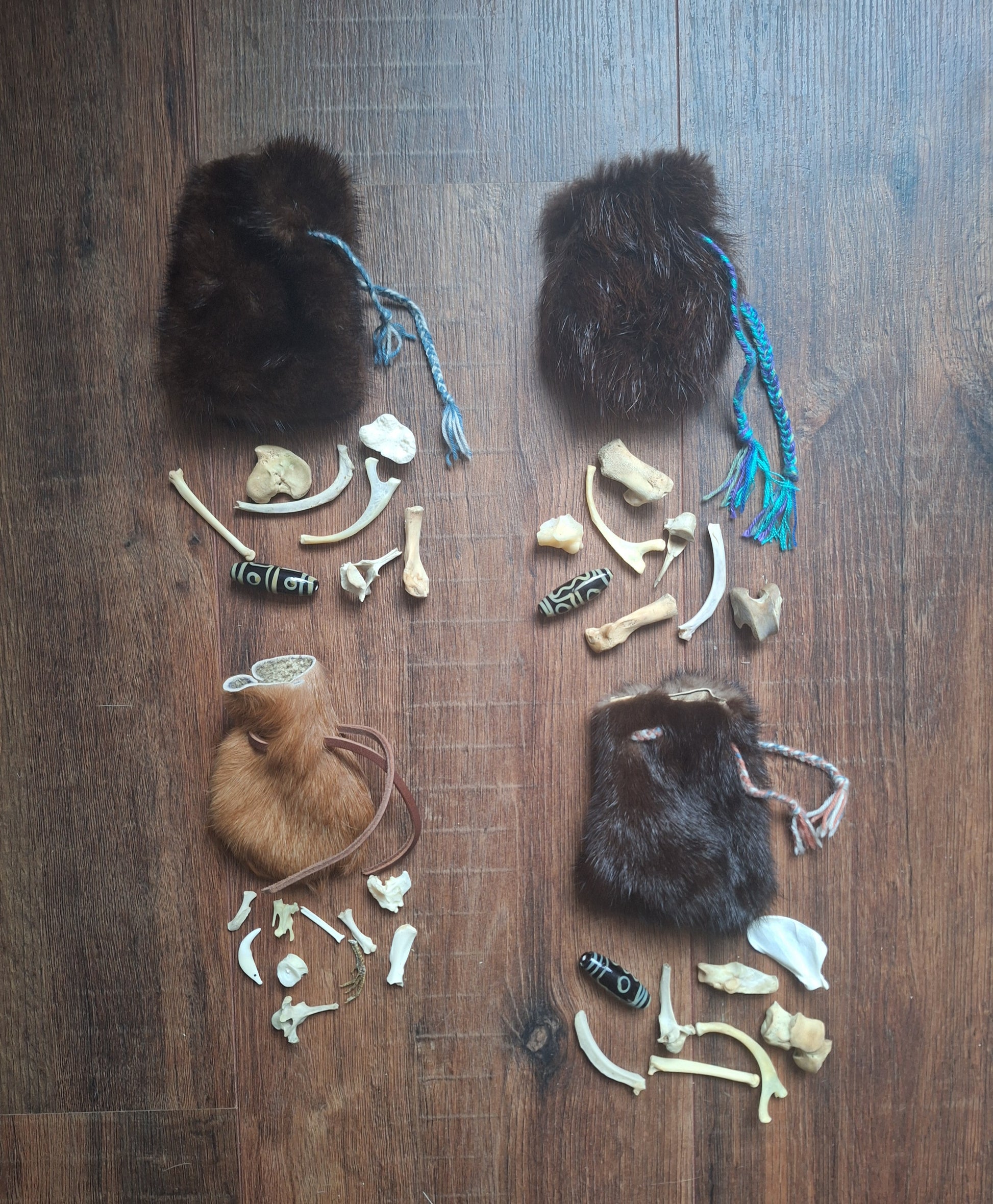 The oracle sets are all unique. They come in different sizes, with different natural items and in different pouches. The pouches have all been hand-sewn from scrap materials, such as left-over pieces of fur, hide or wool. The bones, teeth and other animal parts used in them, are often B-quality; they can be a bit damaged, discolored or broken. Using these ‘not perfect’ materials and items in these sets, serves a double function. On the one hand this is because of a deep respect for the natural world; using items that otherwise would maybe be thrown away. And on the other hand, we can offer you these sets now for a reasonable low price, a nice way to try out if this kind of divination works for you.