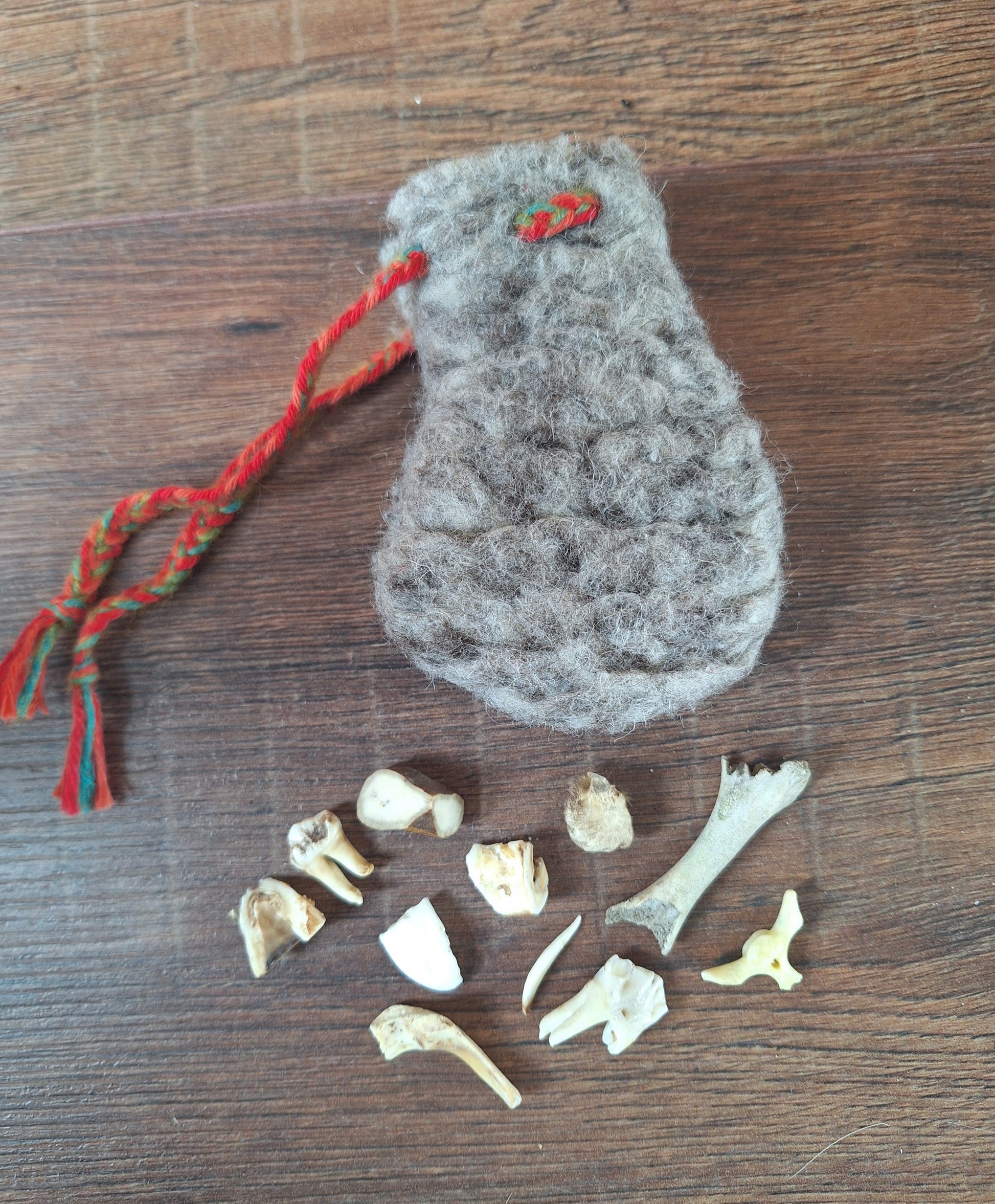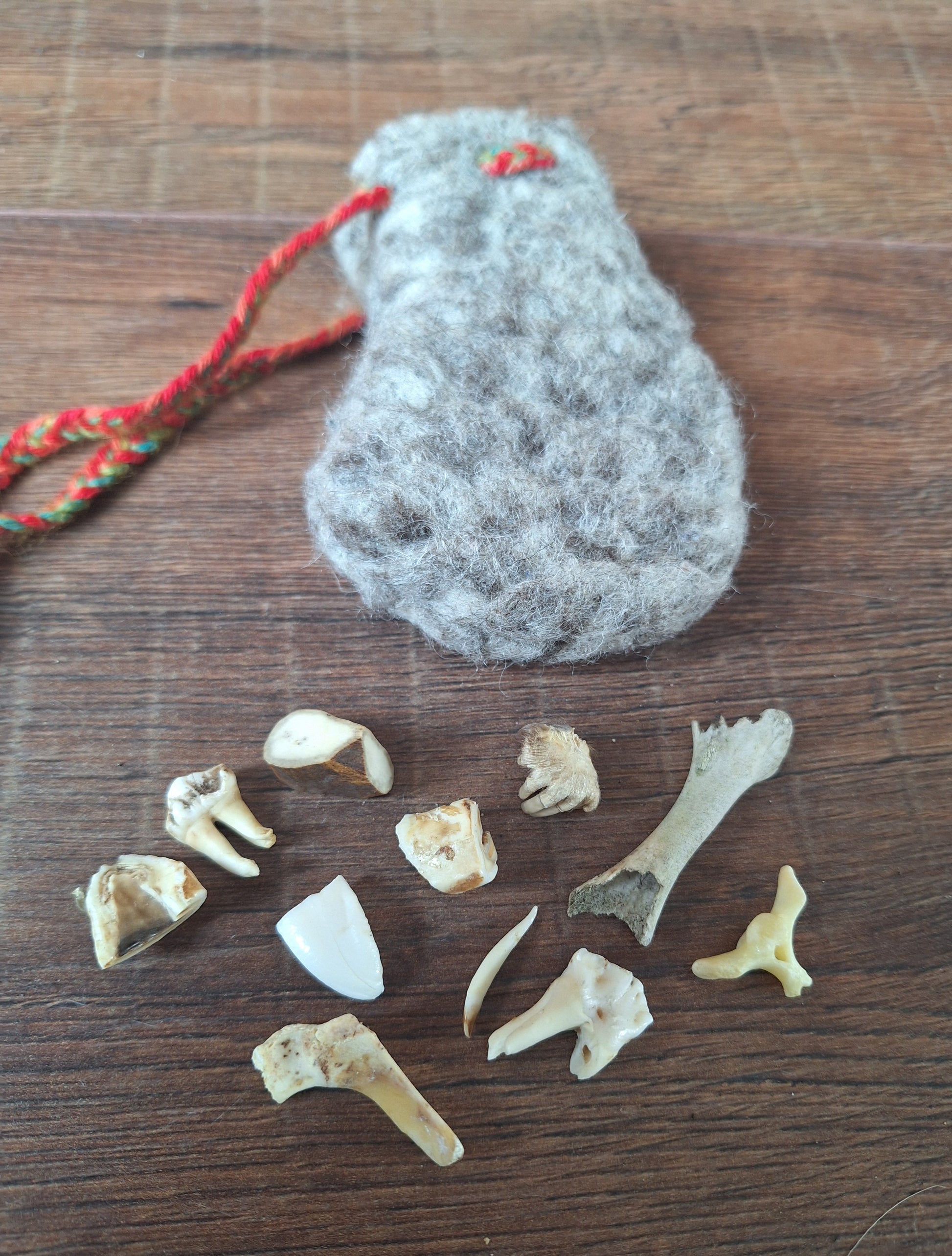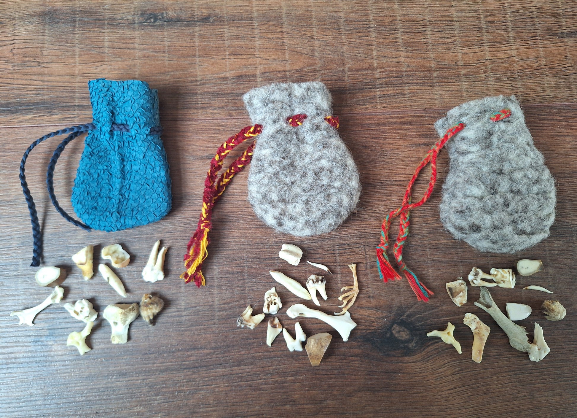 The oracle sets are all unique. They come in different sizes, with different natural items and in different pouches. The pouches have all been hand-sewn from scrap materials, such as left-over pieces of fur, hide or wool. The bones, teeth and other animal parts used in them, are often B-quality; they can be a bit damaged, discolored or broken. Using these ‘not perfect’ materials and items in these sets, serves a double function. On the one hand this is because of a deep respect for the natural world; using items that otherwise would maybe be thrown away. And on the other hand, we can offer you these sets now for a reasonable low price, a nice way to try out if this kind of divination works for you.