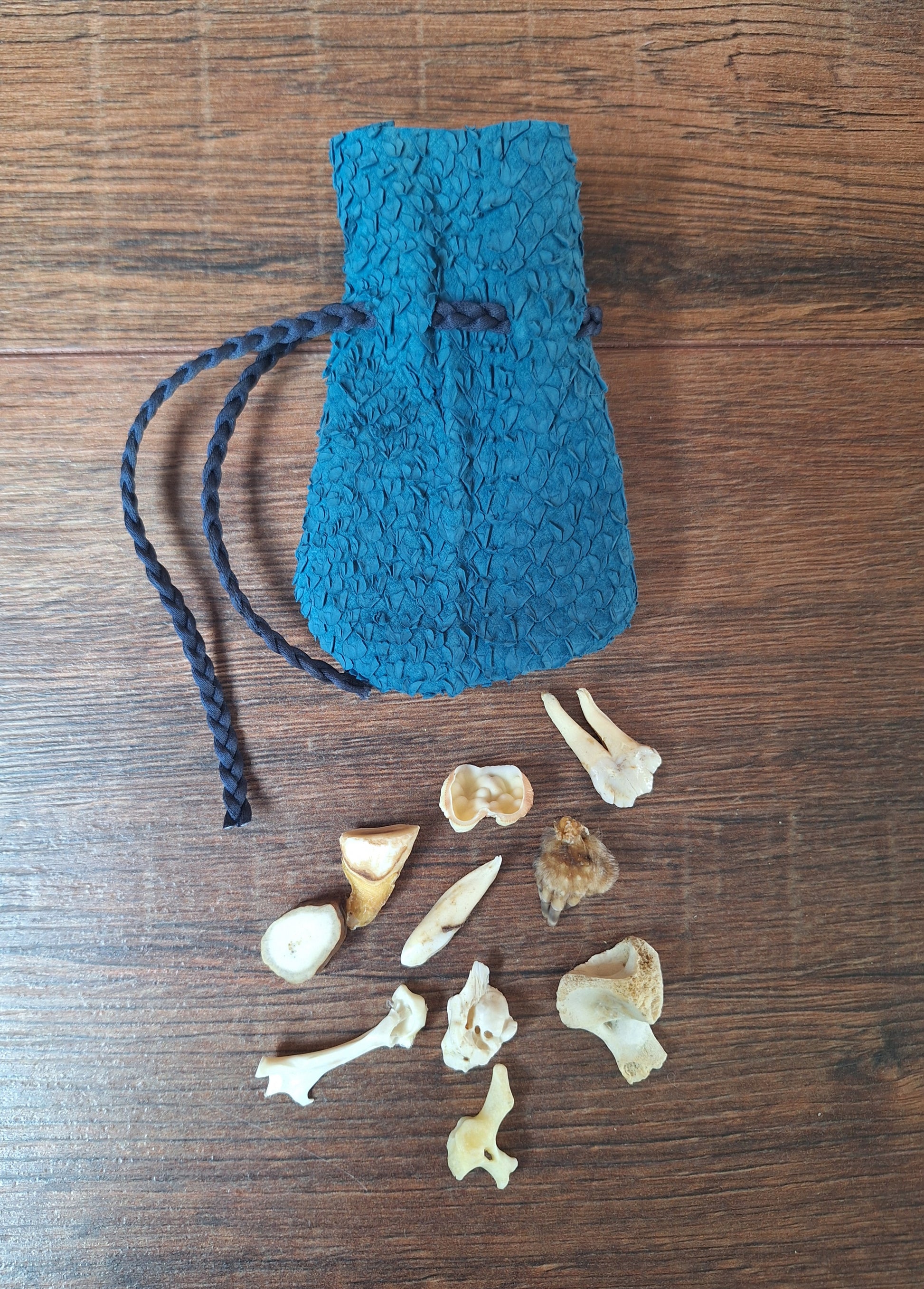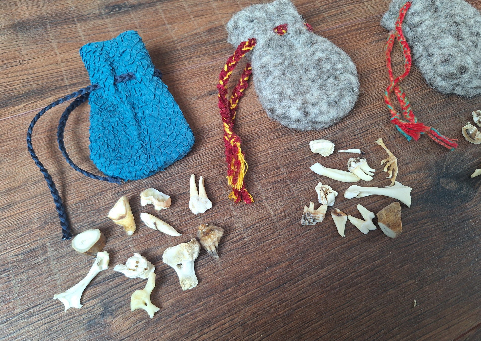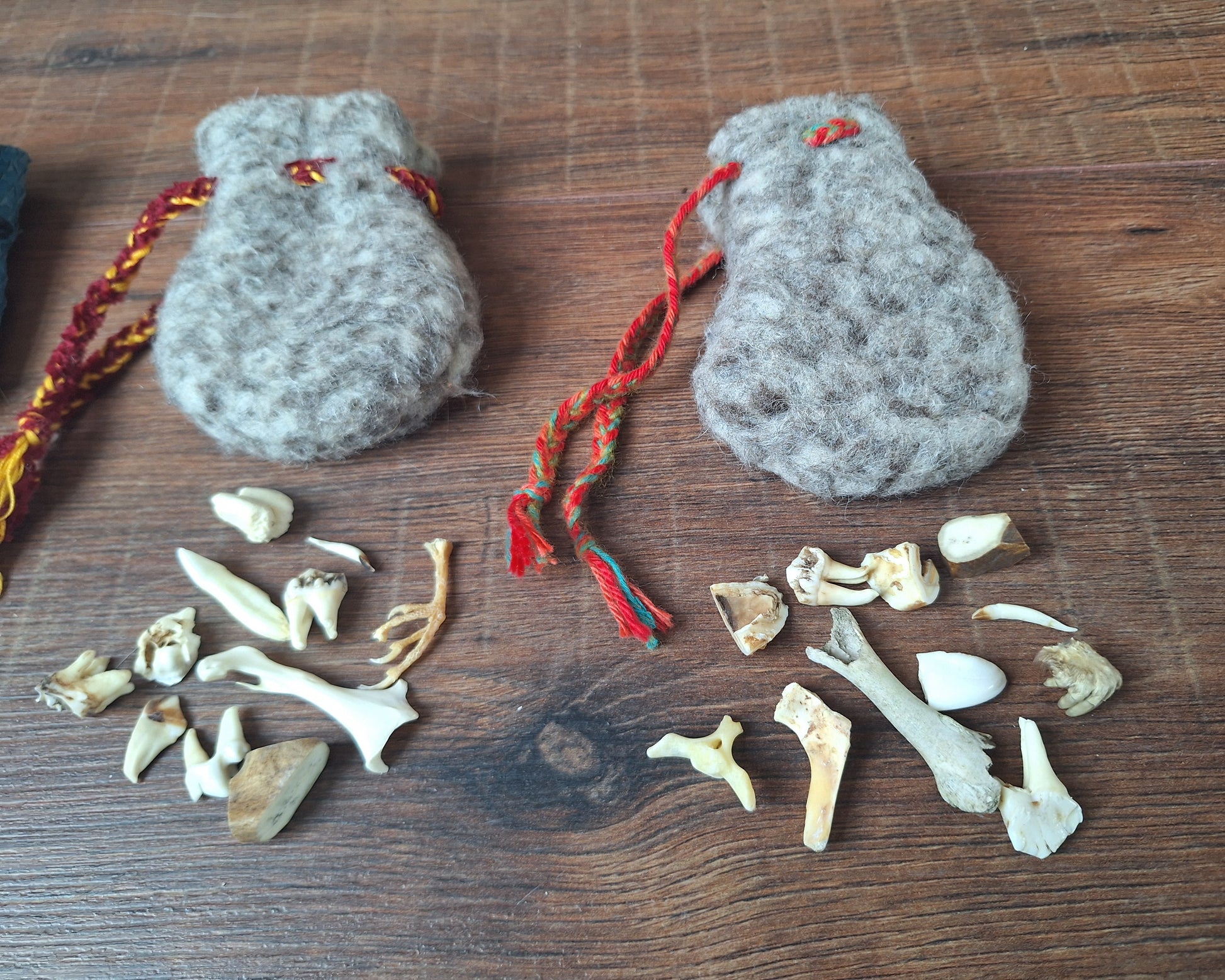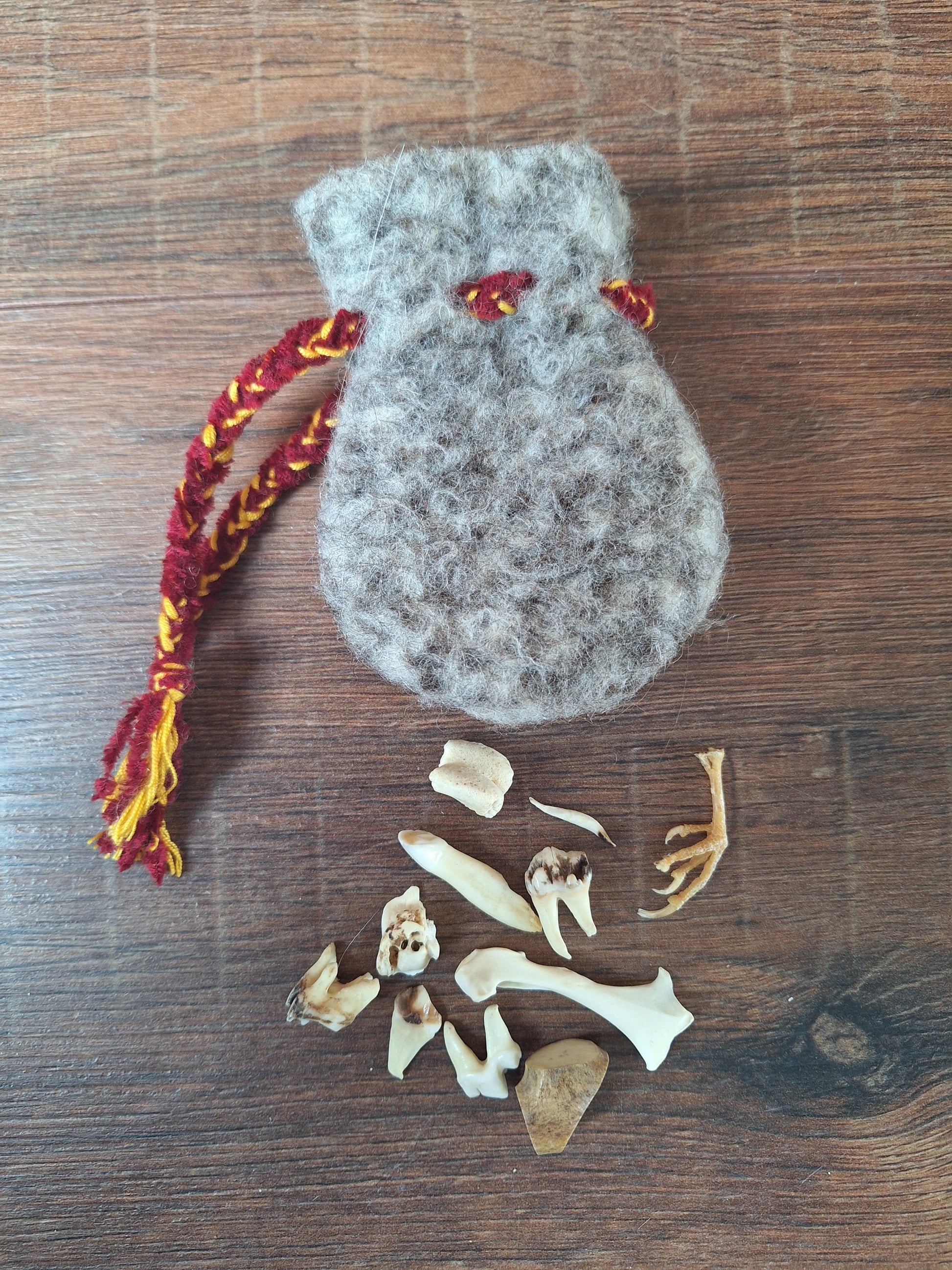 The oracle sets are all unique. They come in different sizes, with different natural items and in different pouches. The pouches have all been hand-sewn from scrap materials, such as left-over pieces of fur, hide or wool. The bones, teeth and other animal parts used in them, are often B-quality; they can be a bit damaged, discolored or broken. Using these ‘not perfect’ materials and items in these sets, serves a double function. On the one hand this is because of a deep respect for the natural world; using items that otherwise would maybe be thrown away. And on the other hand, we can offer you these sets now for a reasonable low price, a nice way to try out if this kind of divination works for you.