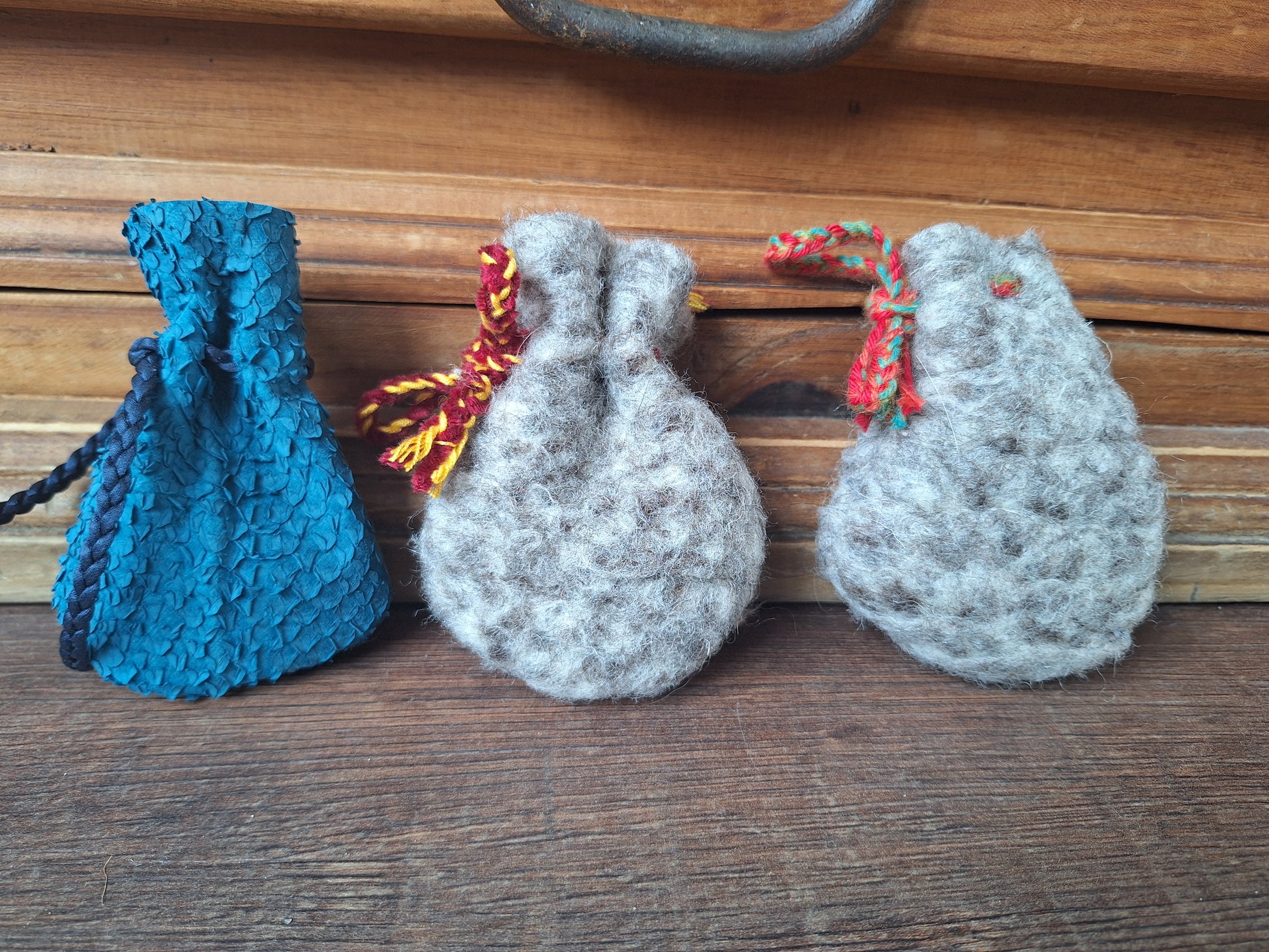 The sets here on these pictures are 'small' size (elsewhere in our webshop you will find also 'medium' and 'large' size sets). For reference; the handsewn pouches from these sets are approximately 10 centimeters high.