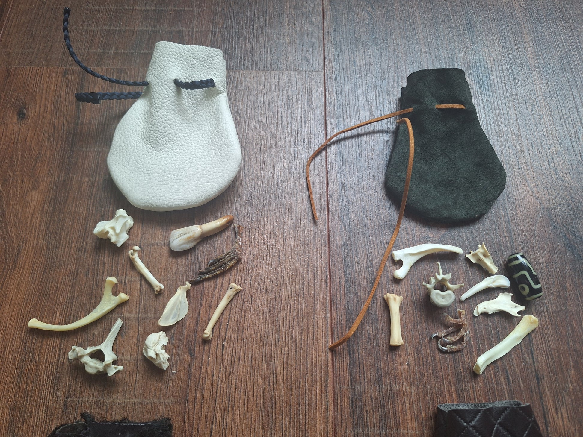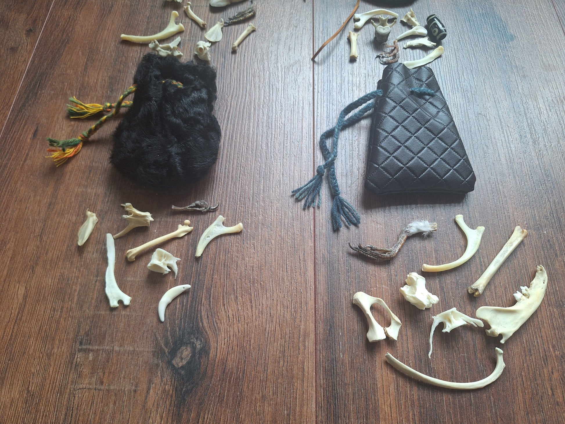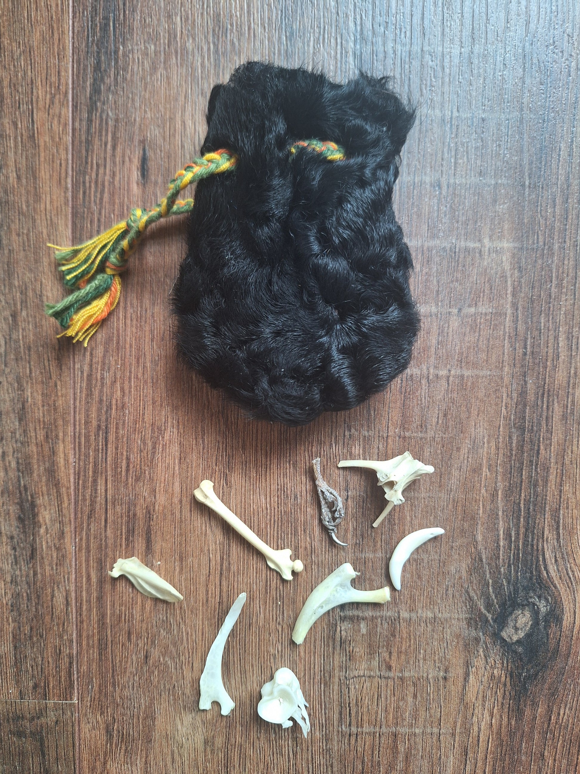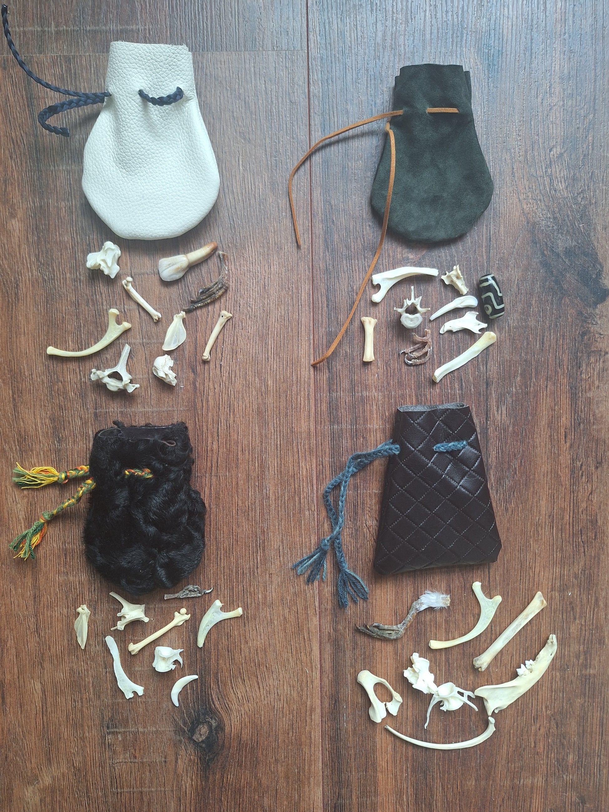 The oracle sets are all unique. They come in different sizes, with different natural items and in different pouches. The pouches have all been hand-sewn from scrap materials, such as left-over pieces of fur, hide or wool. The bones, teeth and other animal parts used in them, are often B-quality; they can be a bit damaged, discolored or broken. Using these ‘not perfect’ materials and items in these sets, serves a double function. On the one hand this is because of a deep respect for the natural world; using items that otherwise would maybe be thrown away. And on the other hand, we can offer you these sets now for a reasonable low price, a nice way to try out if this kind of divination works for you.