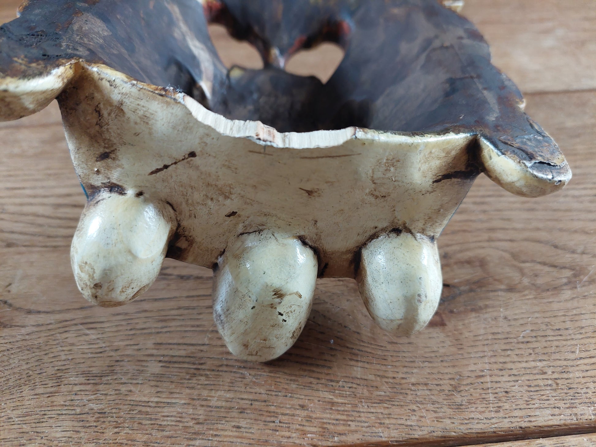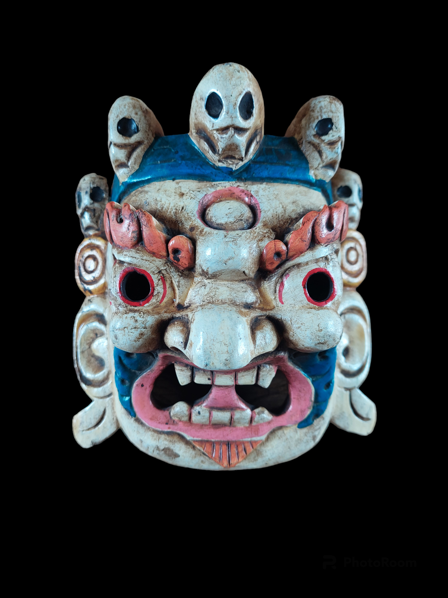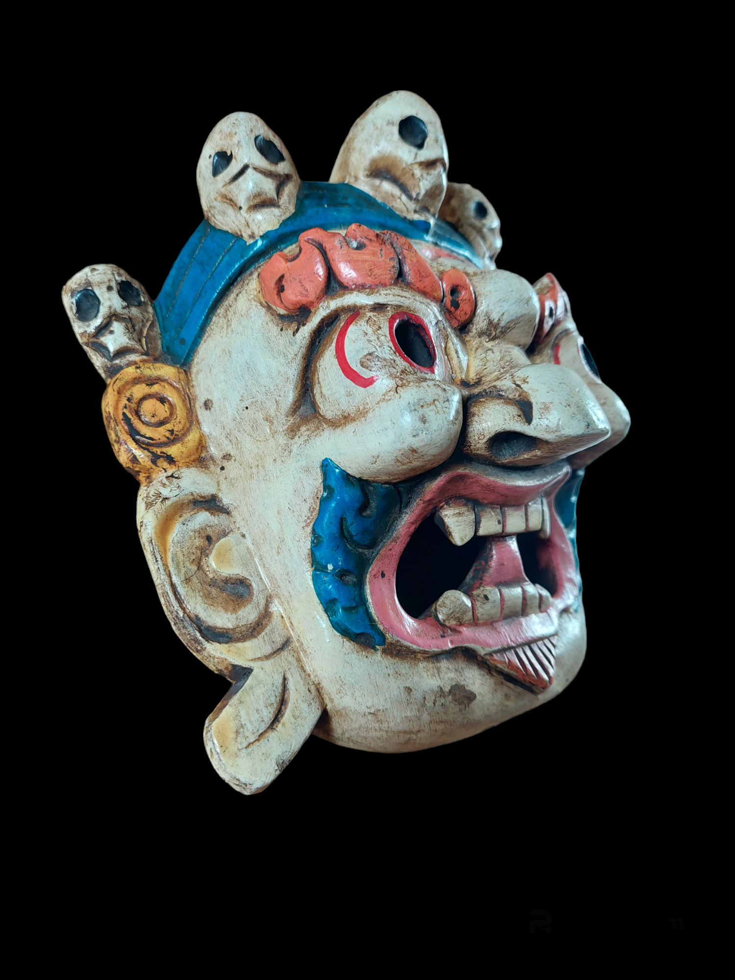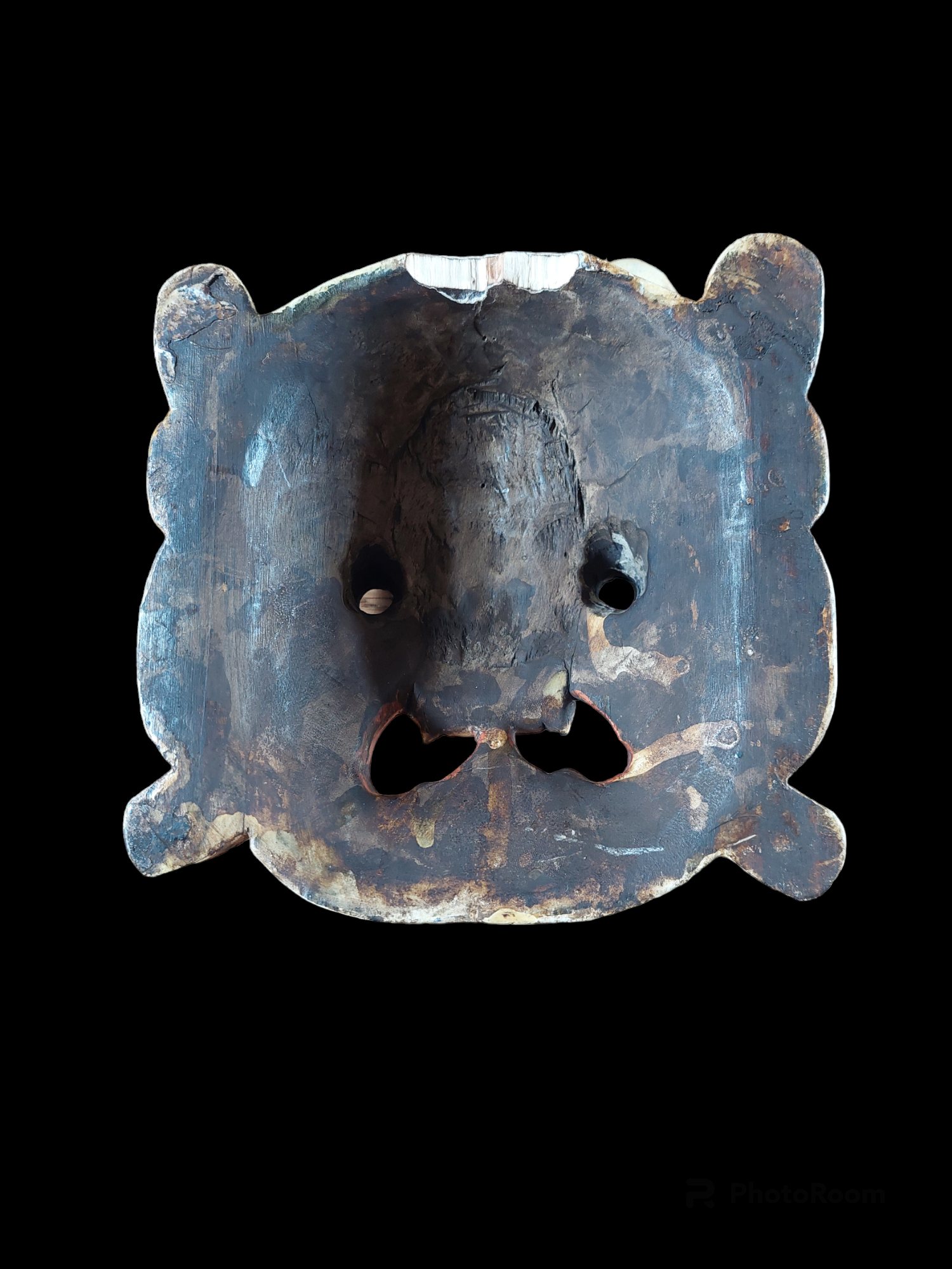 This wooden mask comes from Nepal. Sizes are approximately; 17 centimeters high and 14 centimeters wide. It is painted in bright colors. Due to its age and usage, the paint of course isn't in perfect condition anymore, but instead has a nice rustique look and feel to it. Please look closely at the pictures to observe the condition of this item; there is one damage to the wood, at the backside - top of the head. But this won't show, when you have it hanging on your wall.