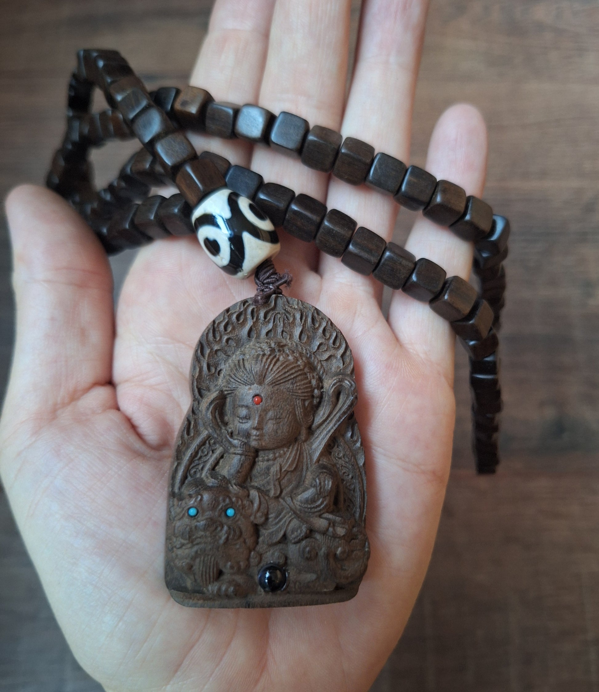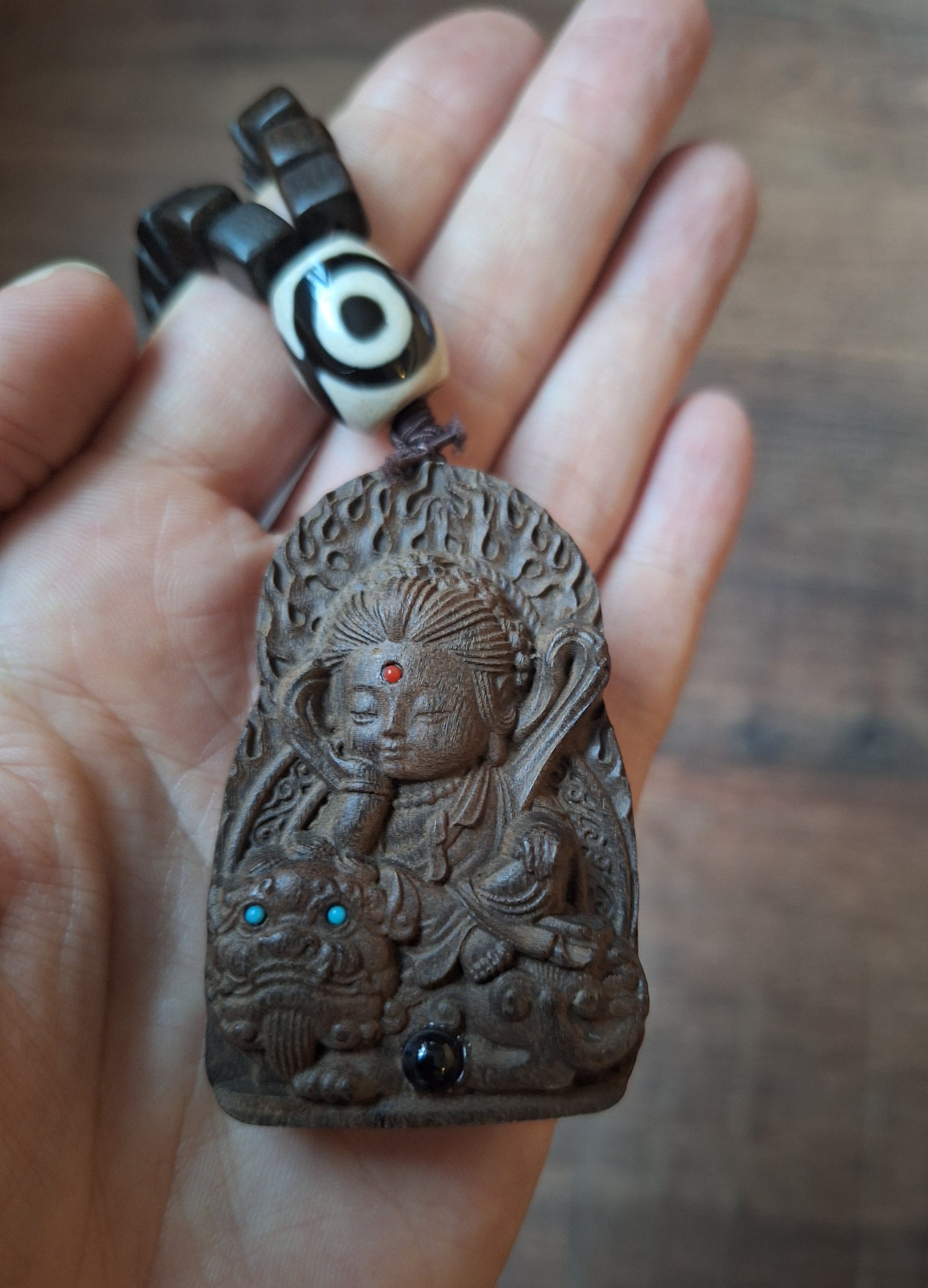 Recently made wooden mala, with a nice woodcarved pendant depicting Guanyin on a Chinese lion (Foo Dog, temple-lion).