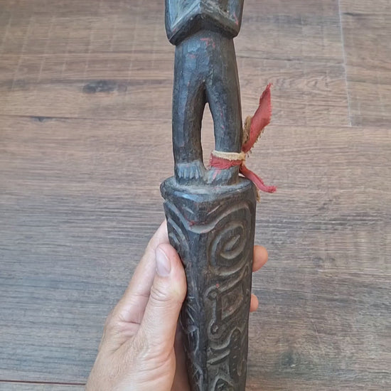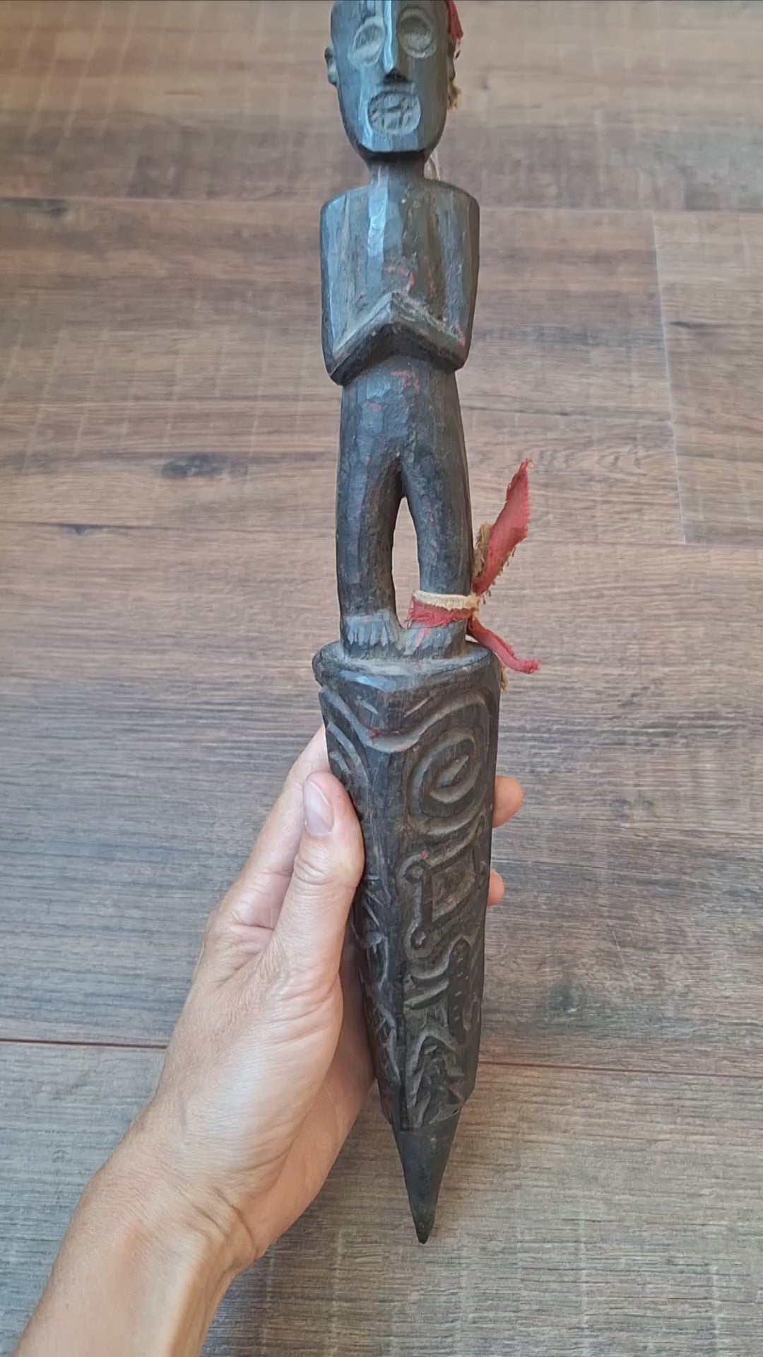 Antique wooden phurba from Nepal. Artisan handcarved masterpiece with some minor imperfections and damages due to its age and previous usage, but overall still in very good condition.