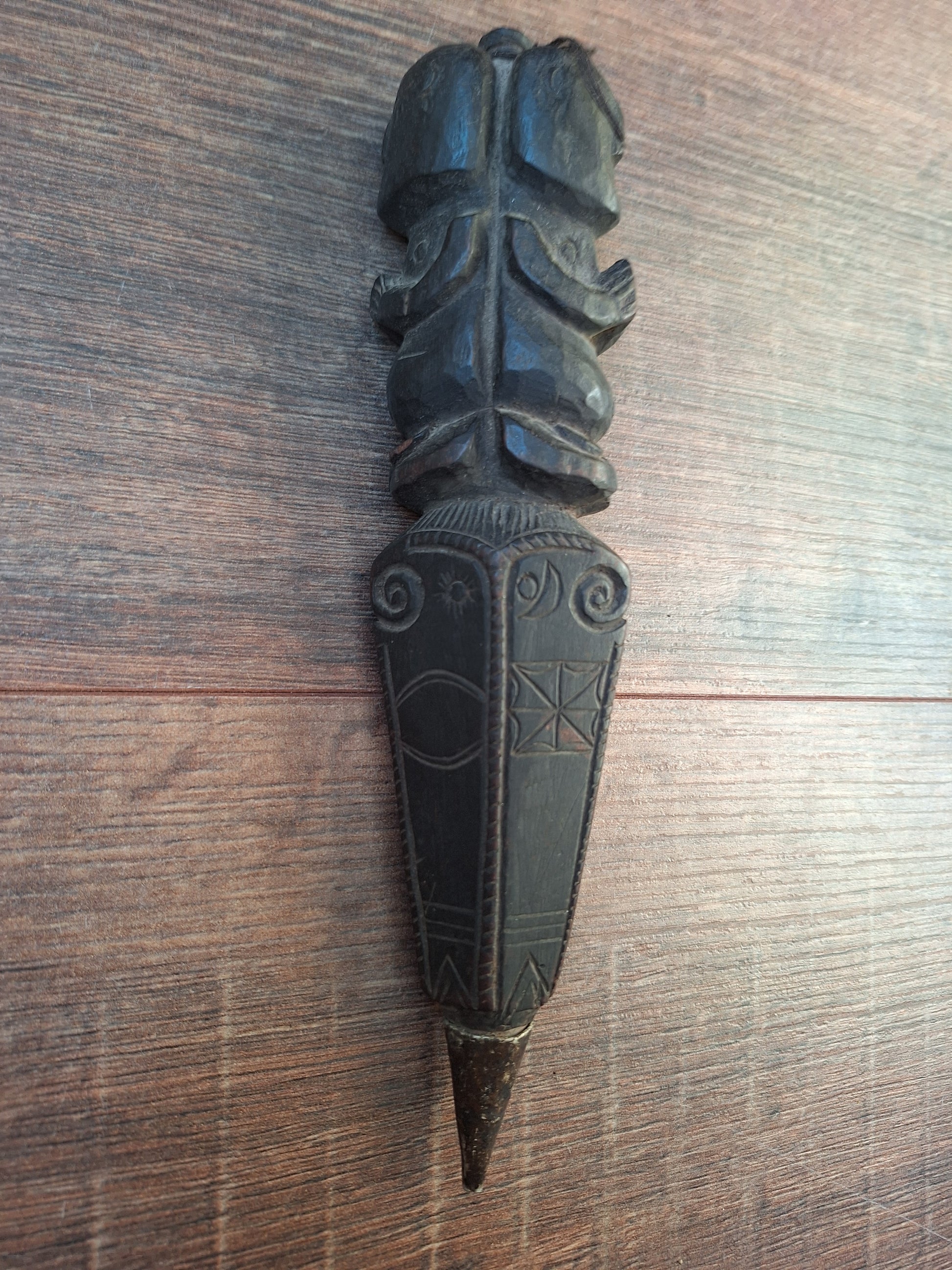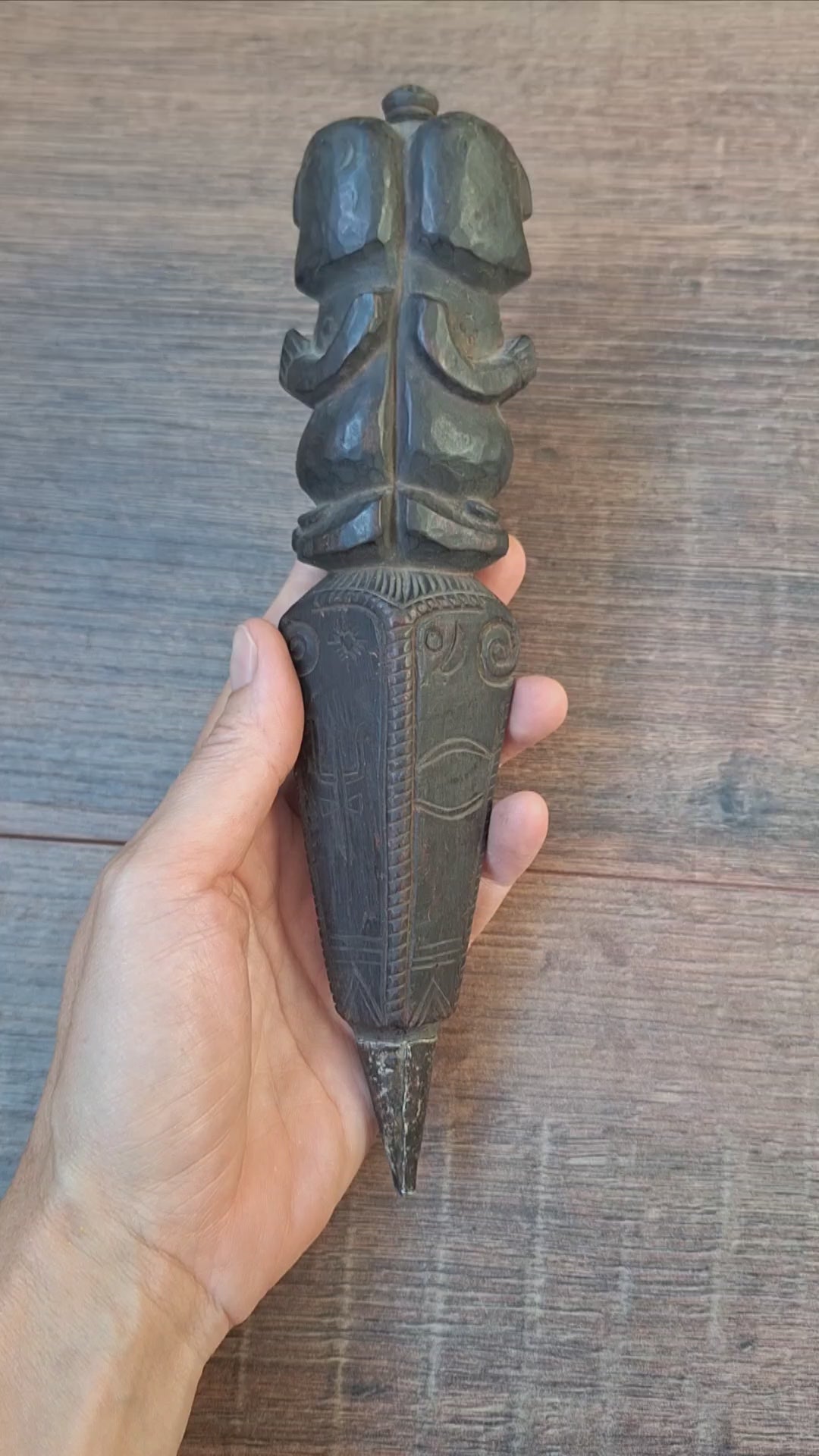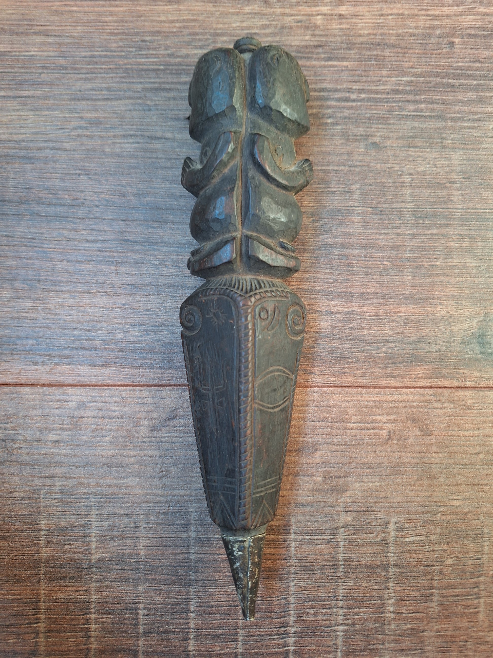 Old wooden phurba from Nepal. Artisan handcarved masterpiece with some minor imperfections and damages due to its age and previous usage, but overall still in very good condition. This one is quite unique in its appearance, especially because of the four-sided blade.