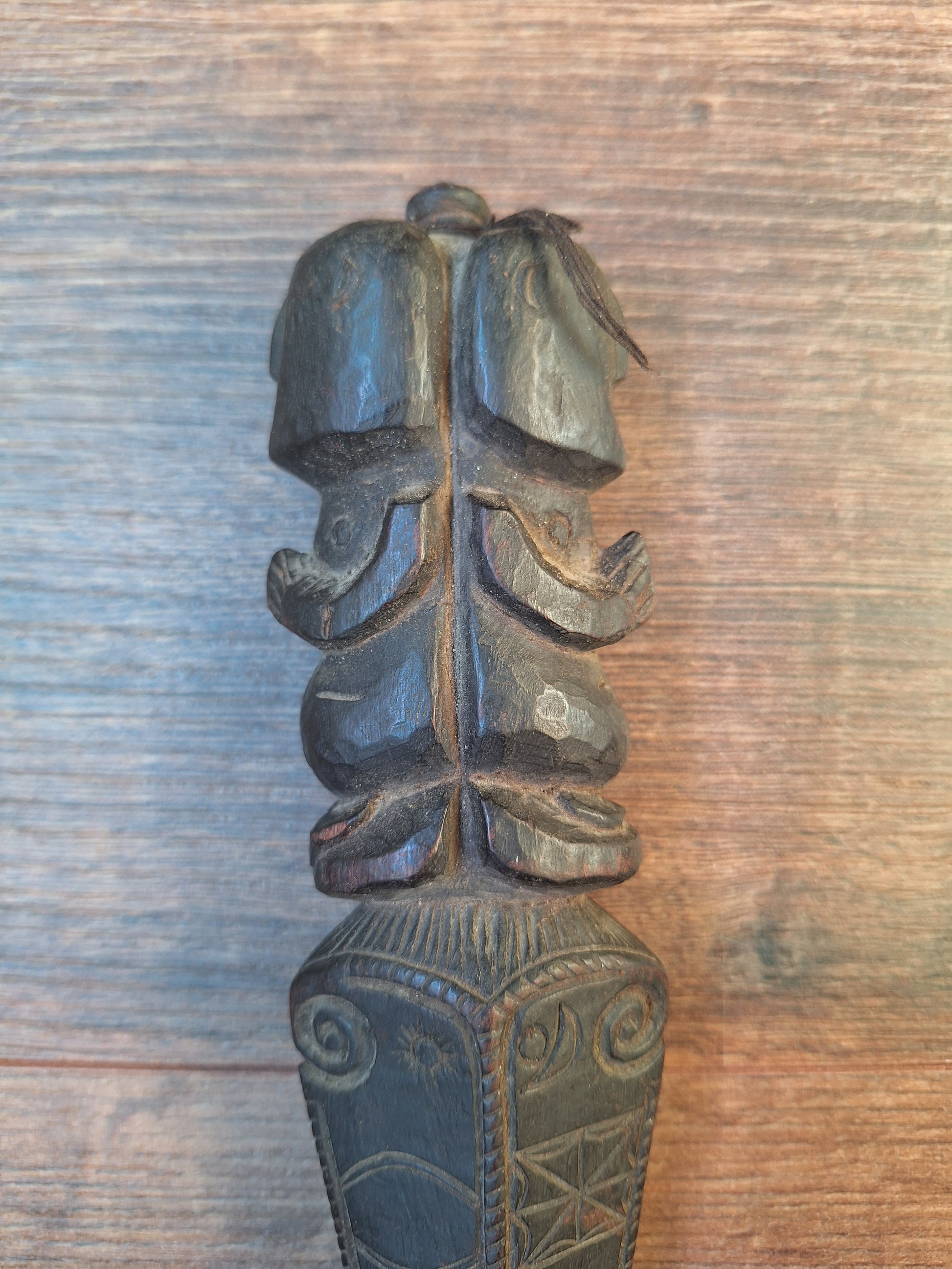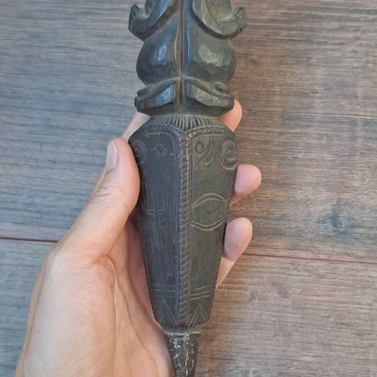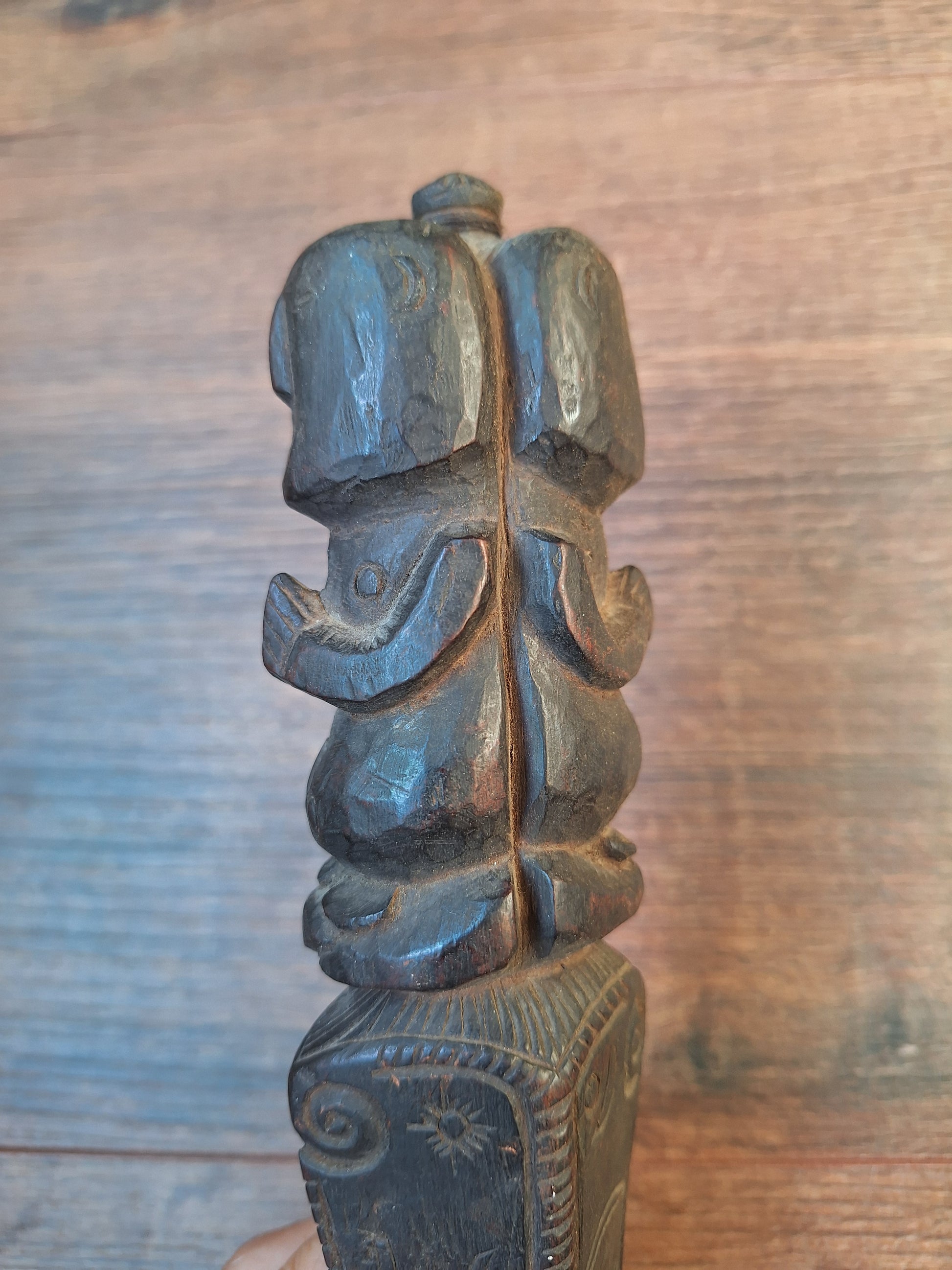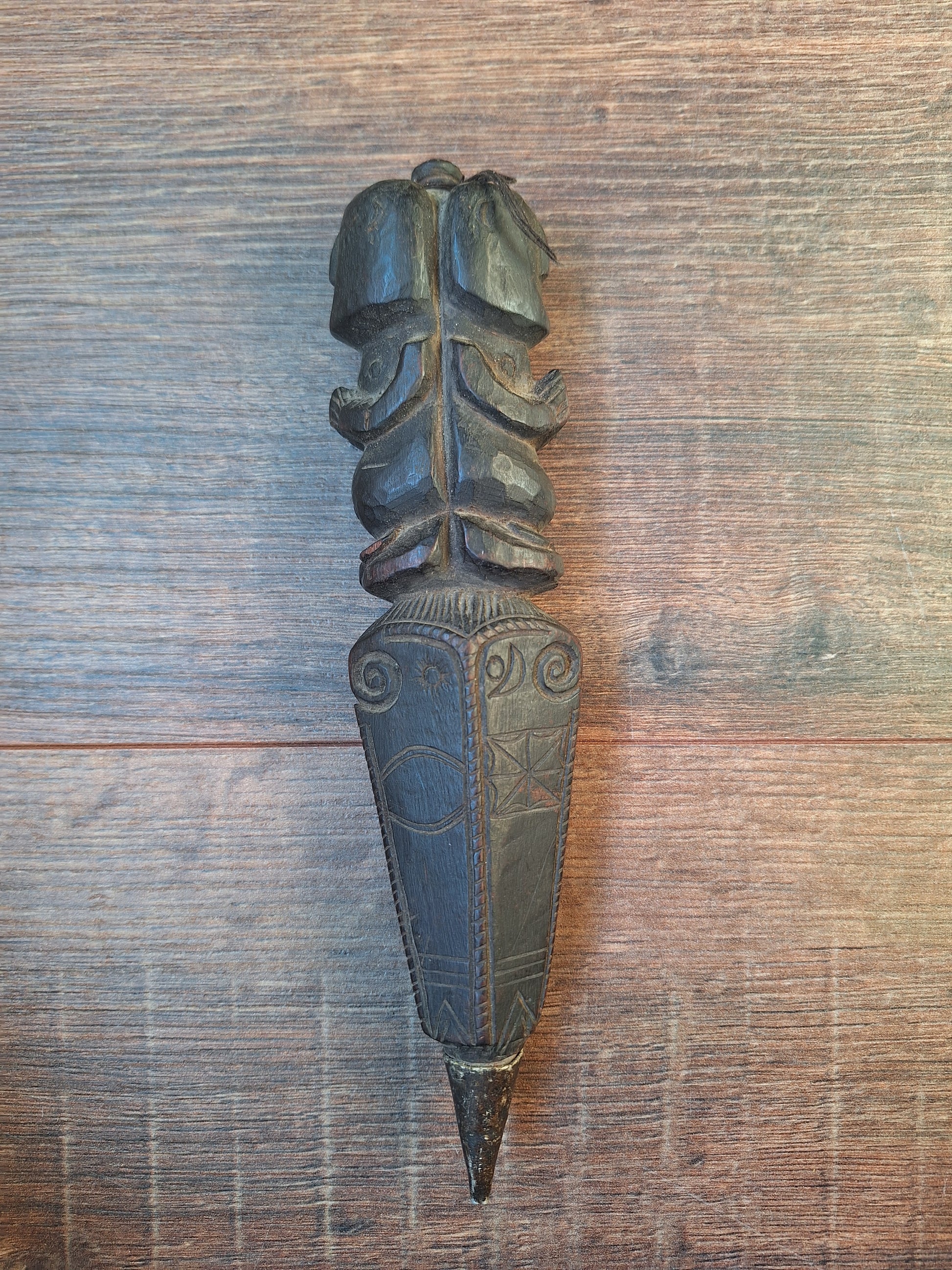 Old wooden phurba from Nepal. Artisan handcarved masterpiece with some minor imperfections and damages due to its age and previous usage, but overall still in very good condition. This one is quite unique in its appearance, especially because of the four-sided blade.