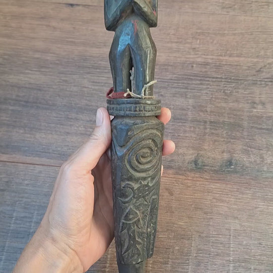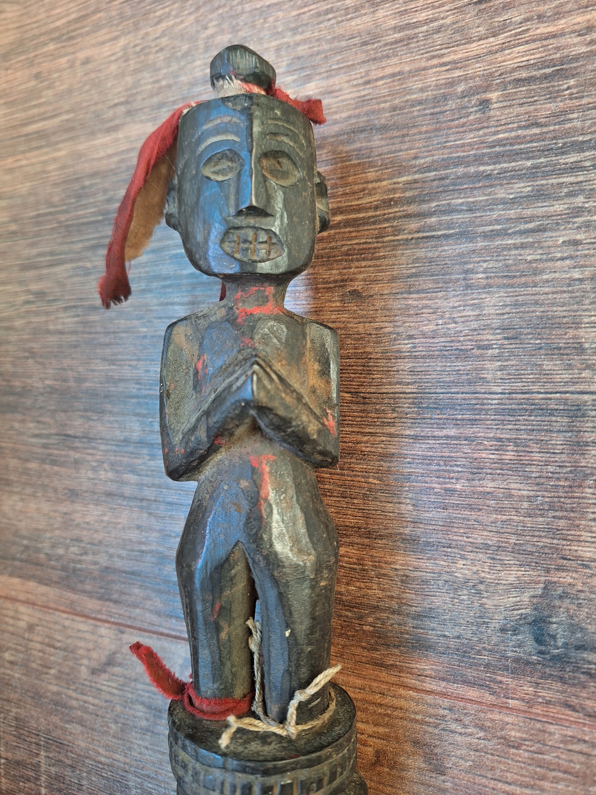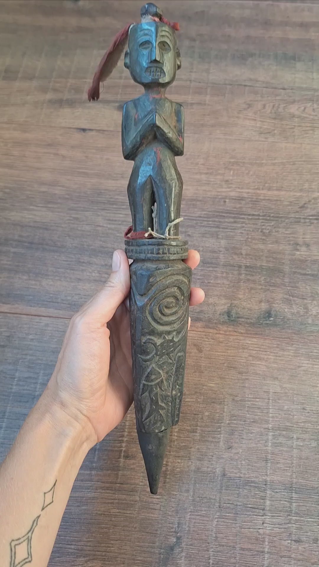 Antique wooden phurba from Nepal. Artisan handcarved masterpiece with some minor imperfections and damages due to its age and previous usage, but overall still in very good condition.