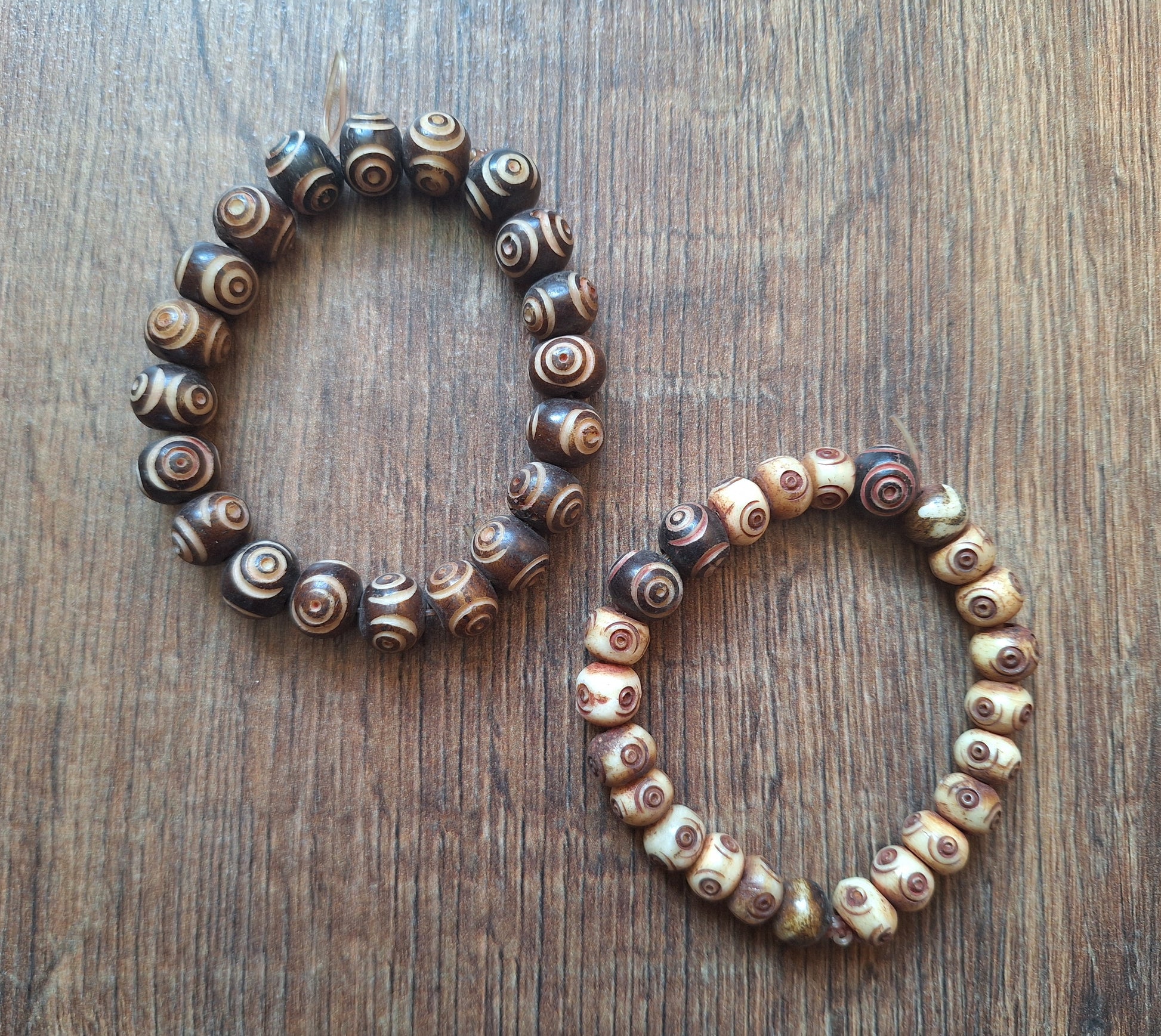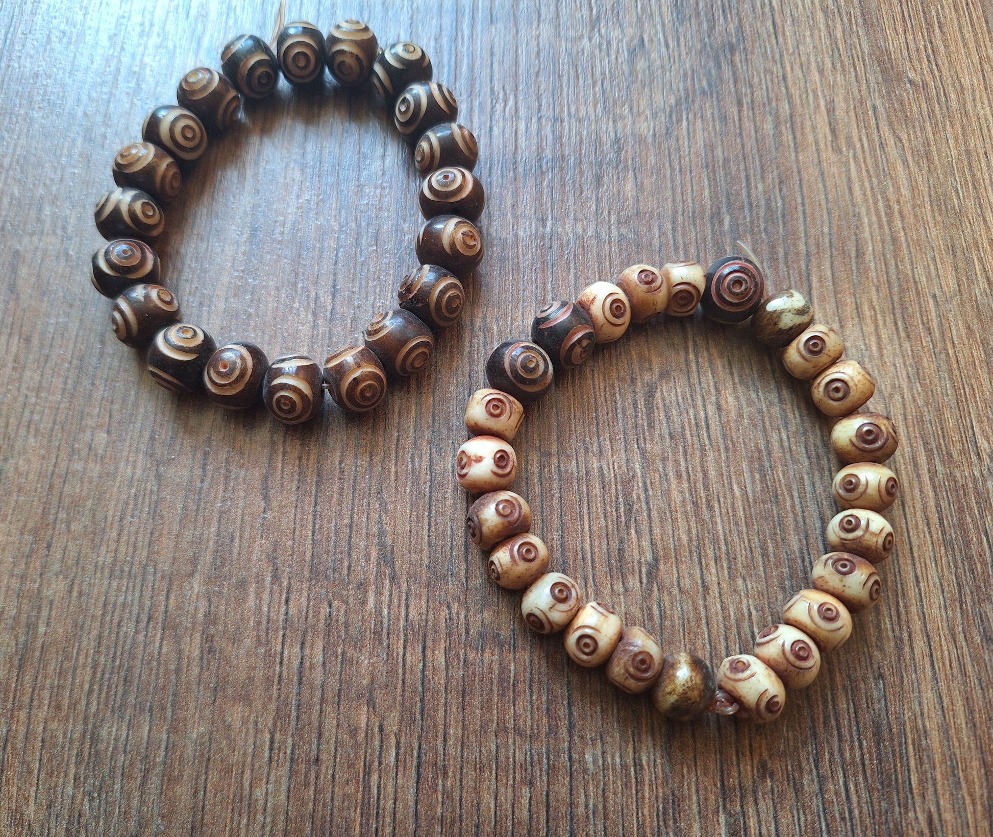 Vintage Nepalese bracelets made with engraved yak bone beads. The beads have been strung on nylon wire, but need to be re-strung since this wire is not in good condition anymore. And of course these very nice beads are also great for all kinds of other crafting projects.