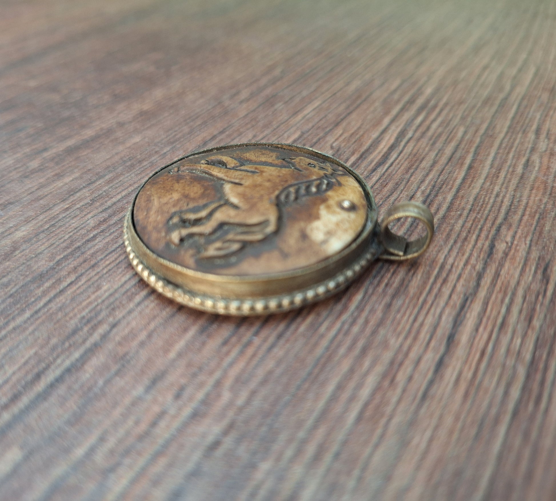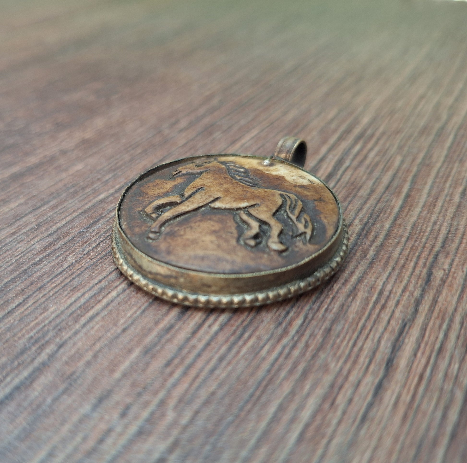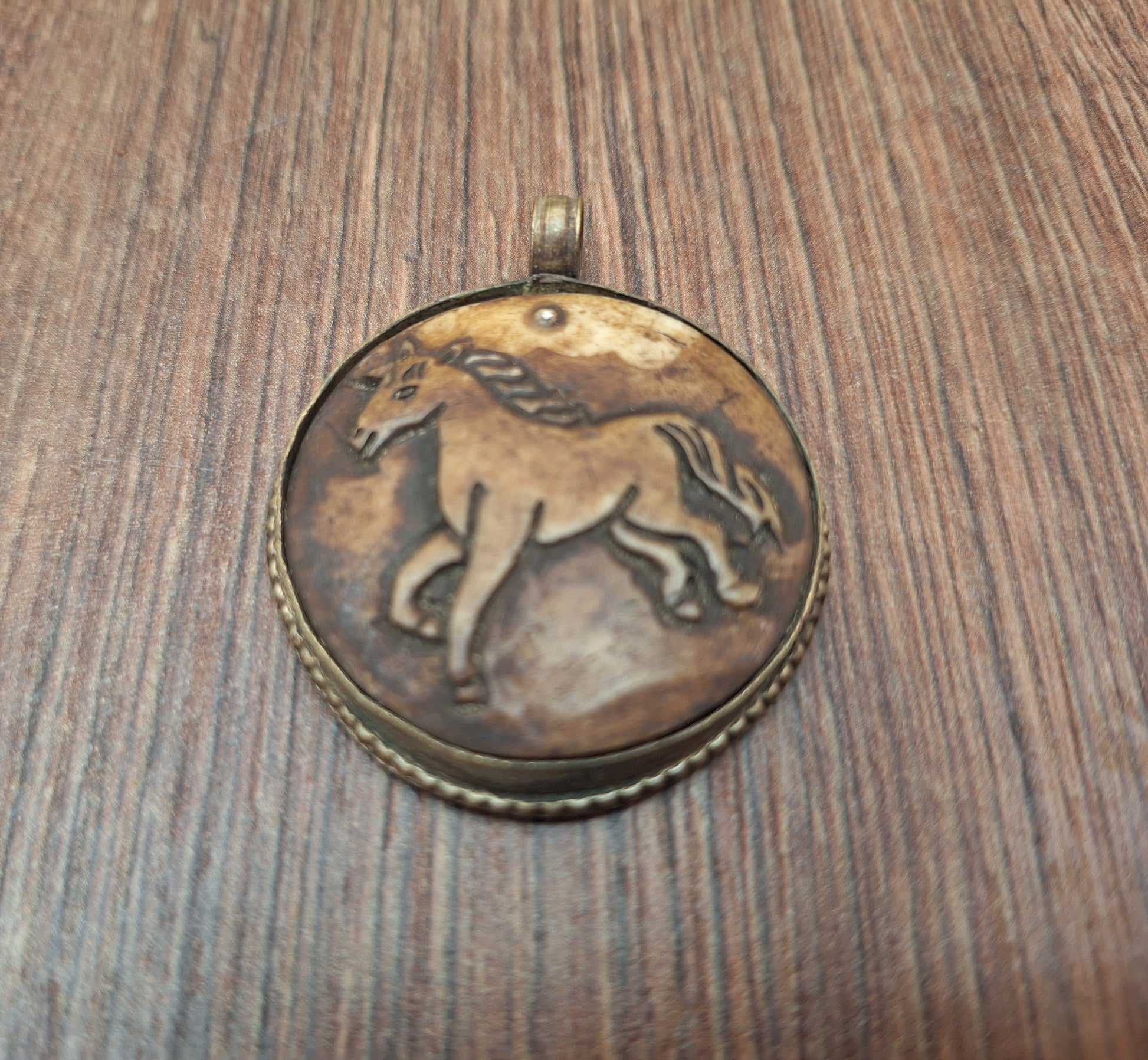 Vintage Nepalese pendant, handcarved from yak bone with the depiction of a horse