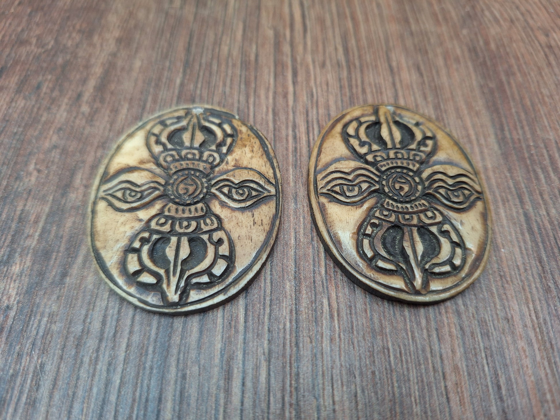 Vintage Nepalese pendants, handcarved from yak bone. With a depiction of two important buddhist' symbols; the dorje and the eyes of Buddha.