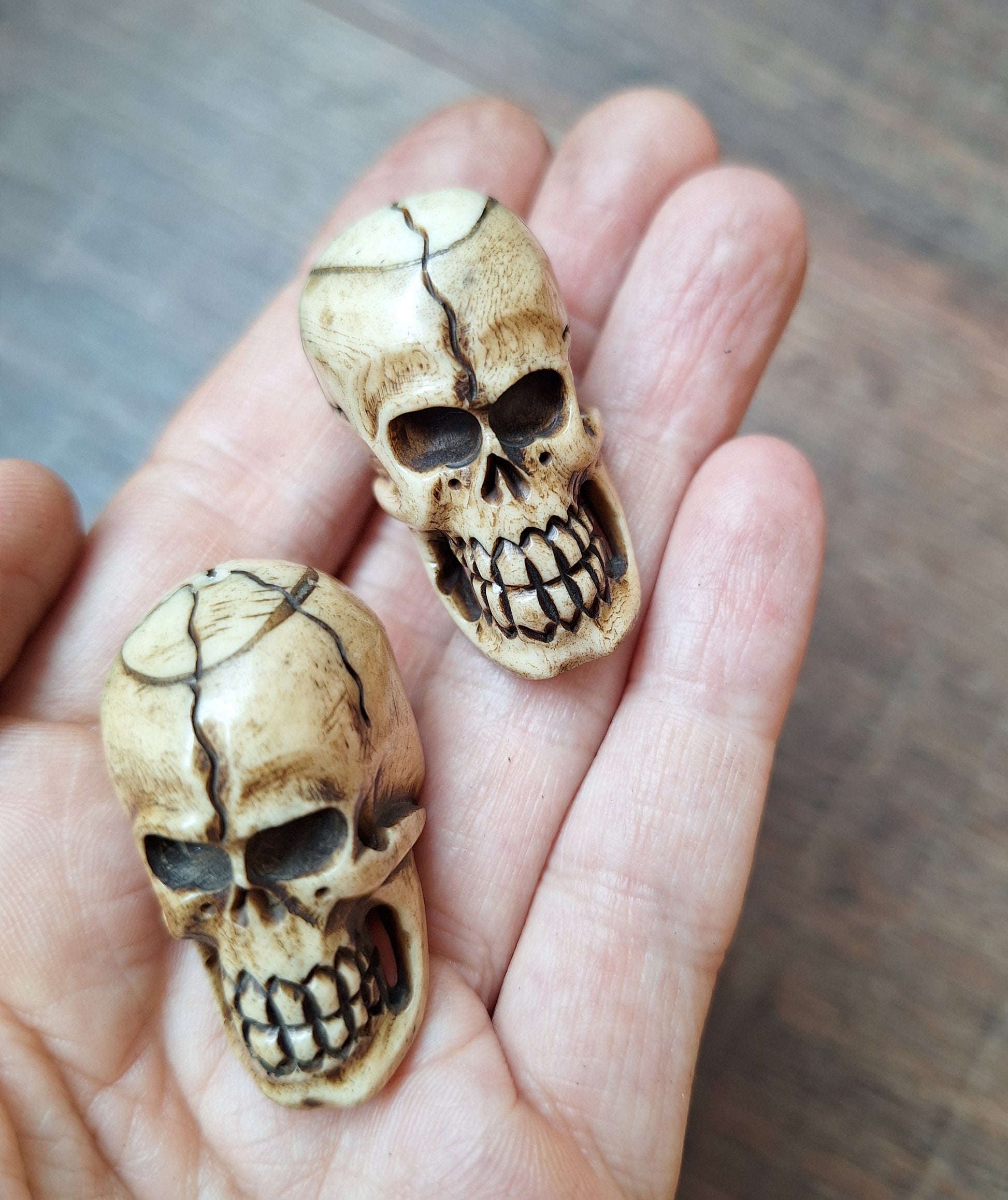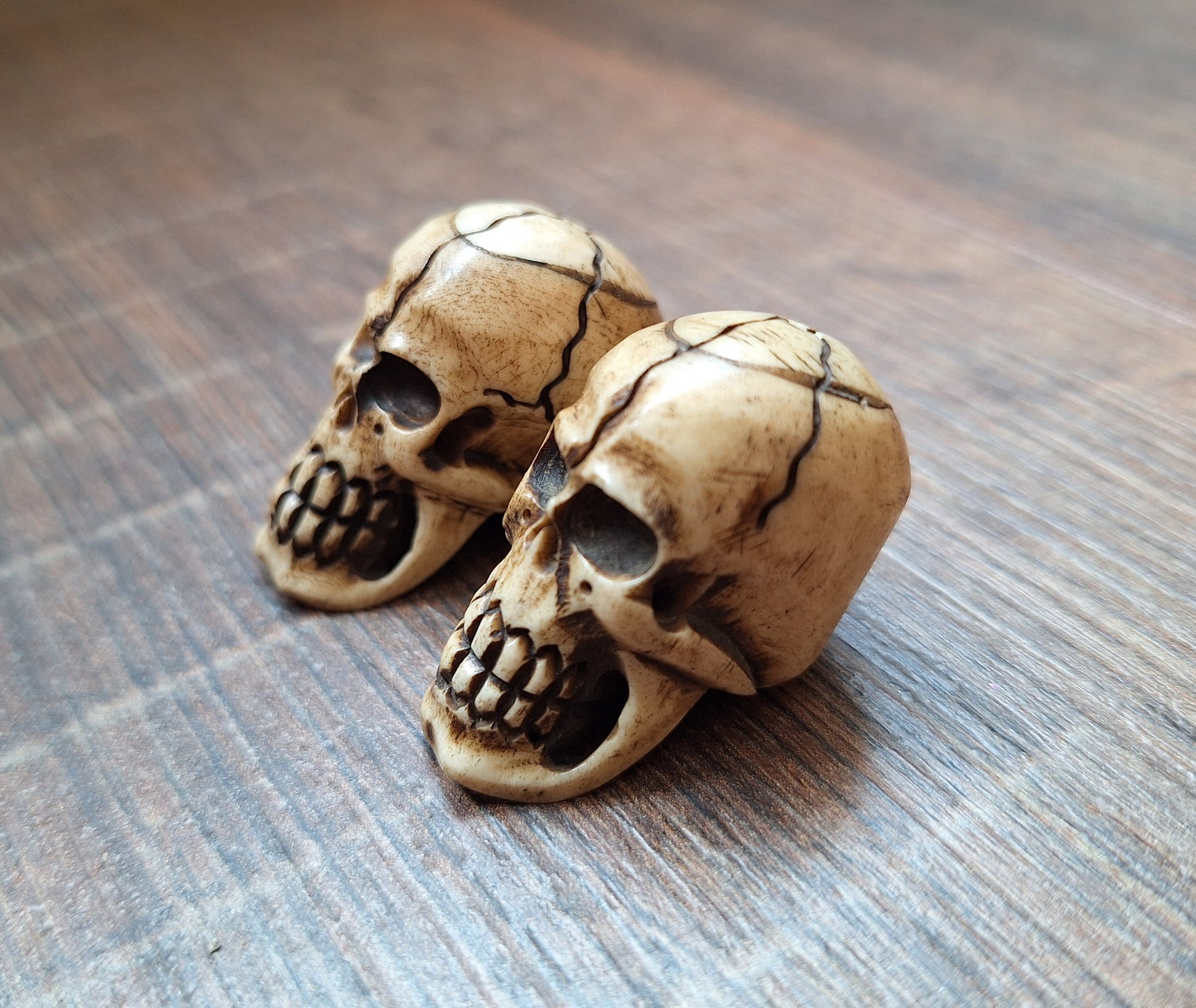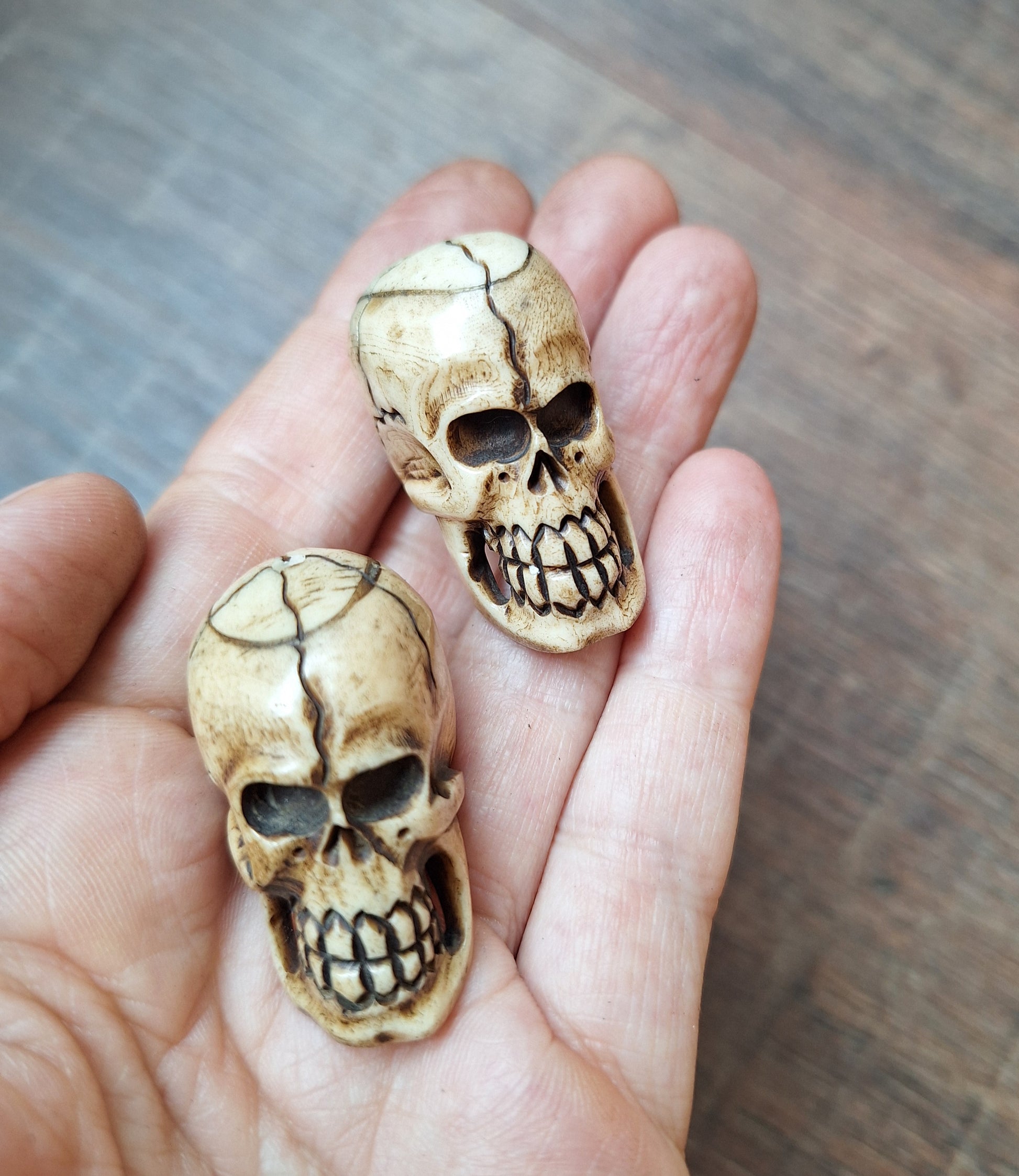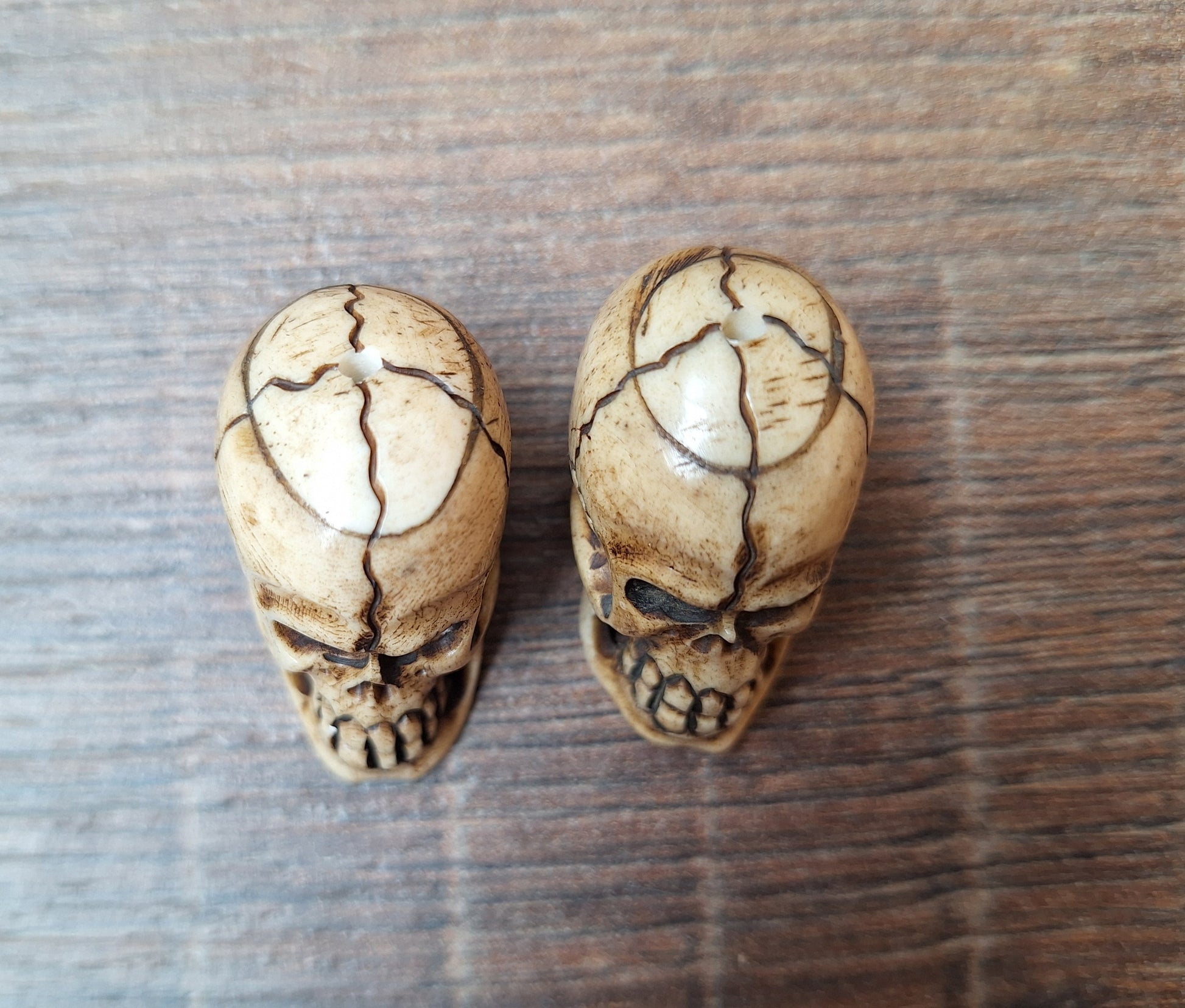 Size of these beads; approximately 4 centimeters high, 2 centimeters wide and 2,5 centimeters deep. Weight; 13 grams. The hole (approximately 2-3 millimeters) is situated on top of the skull, the inside is hollow and the underside is open.