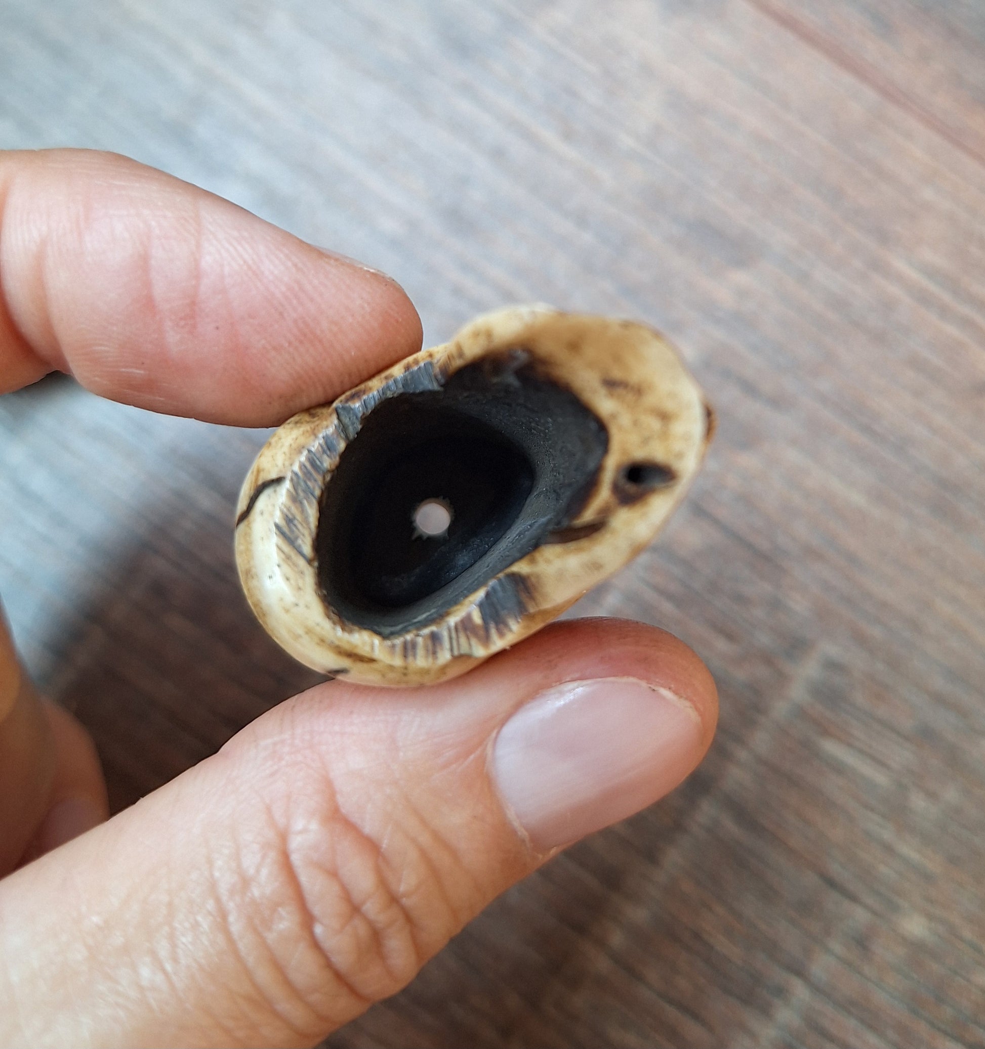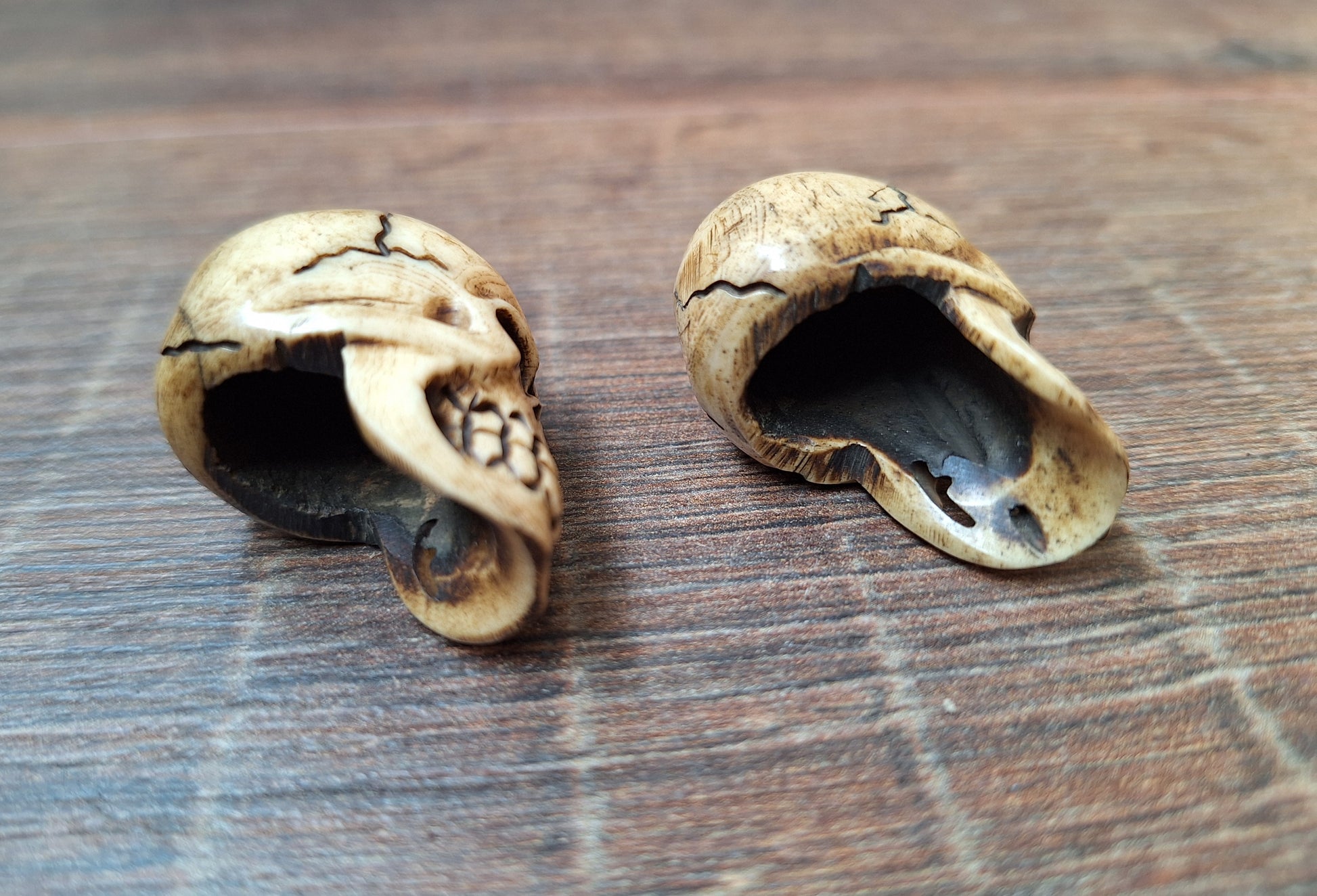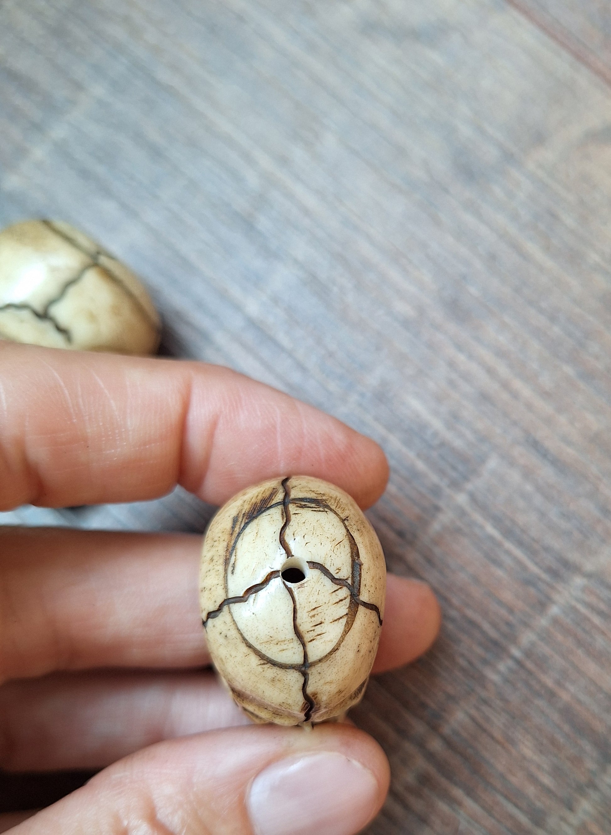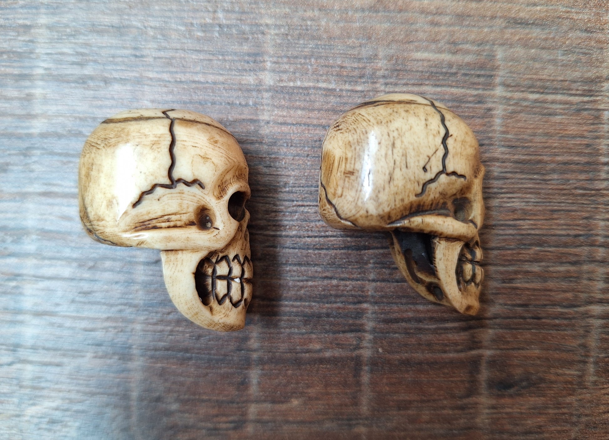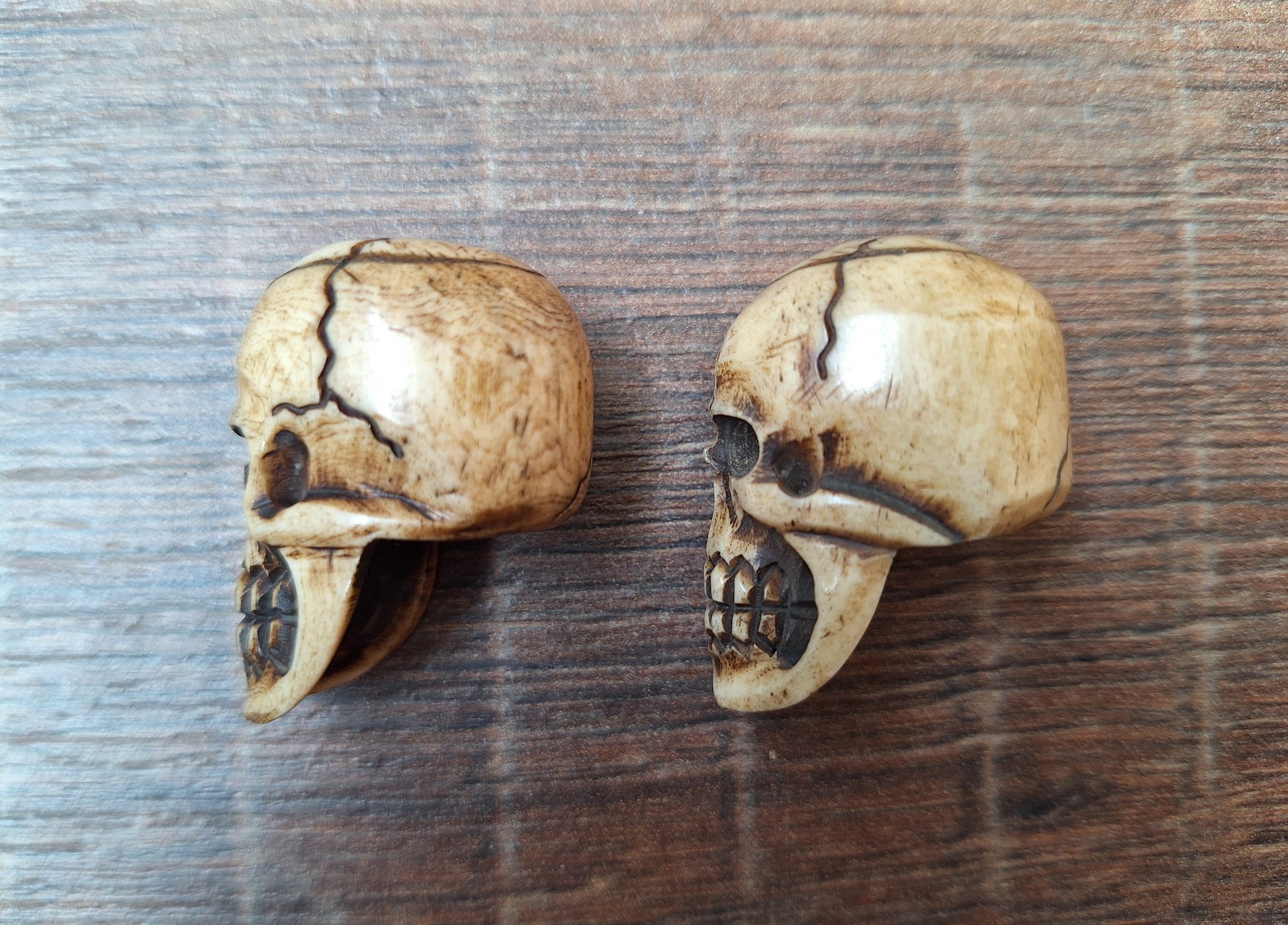 Size of these beads; approximately 4 centimeters high, 2 centimeters wide and 2,5 centimeters deep. Weight; 13 grams. The hole (approximately 2-3 millimeters) is situated on top of the skull, the inside is hollow and the underside is open.