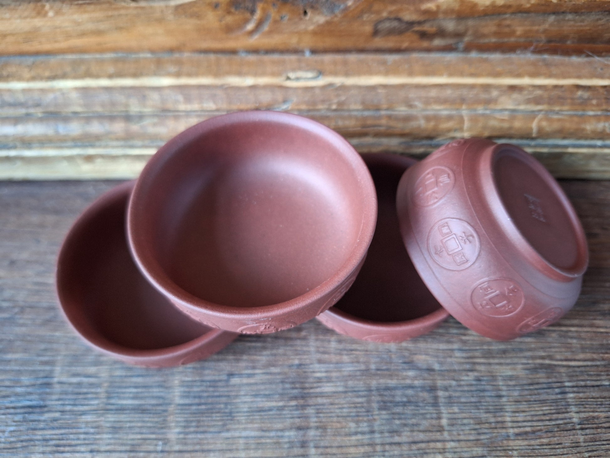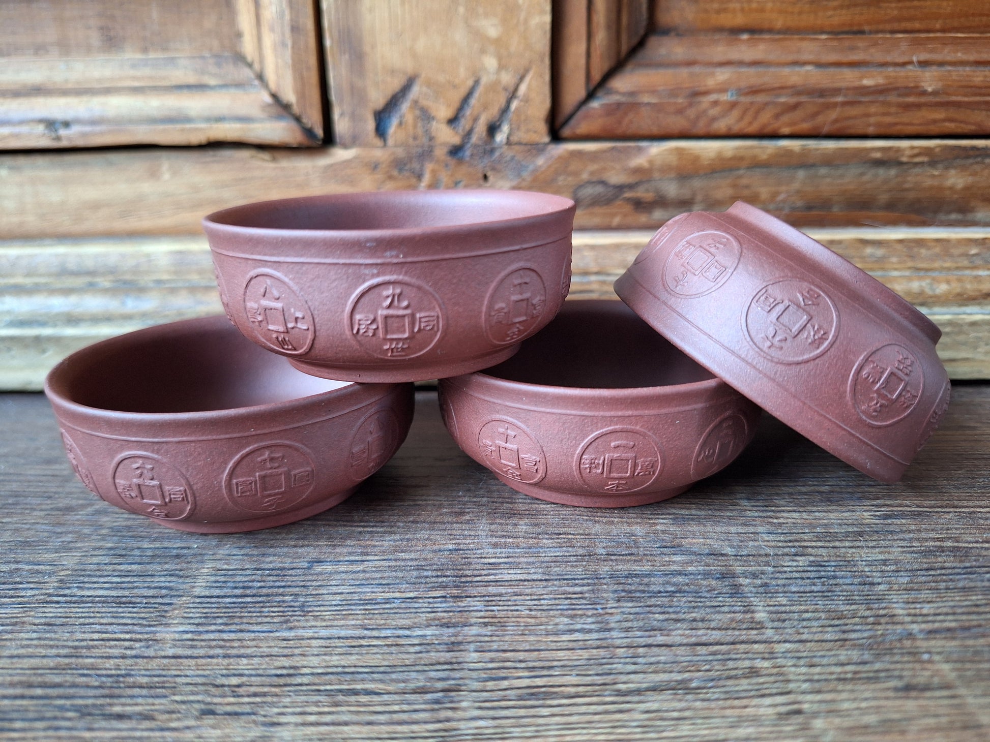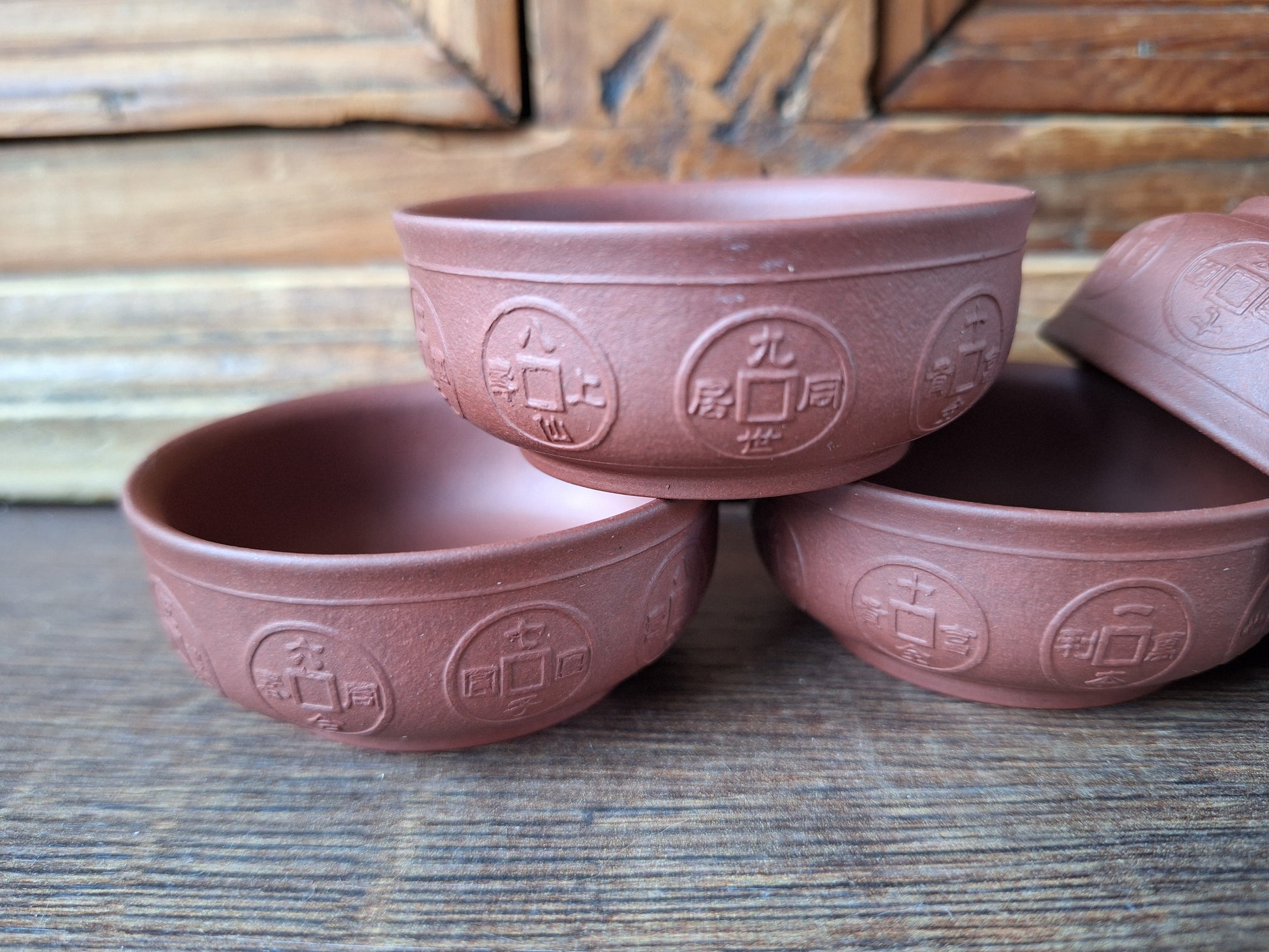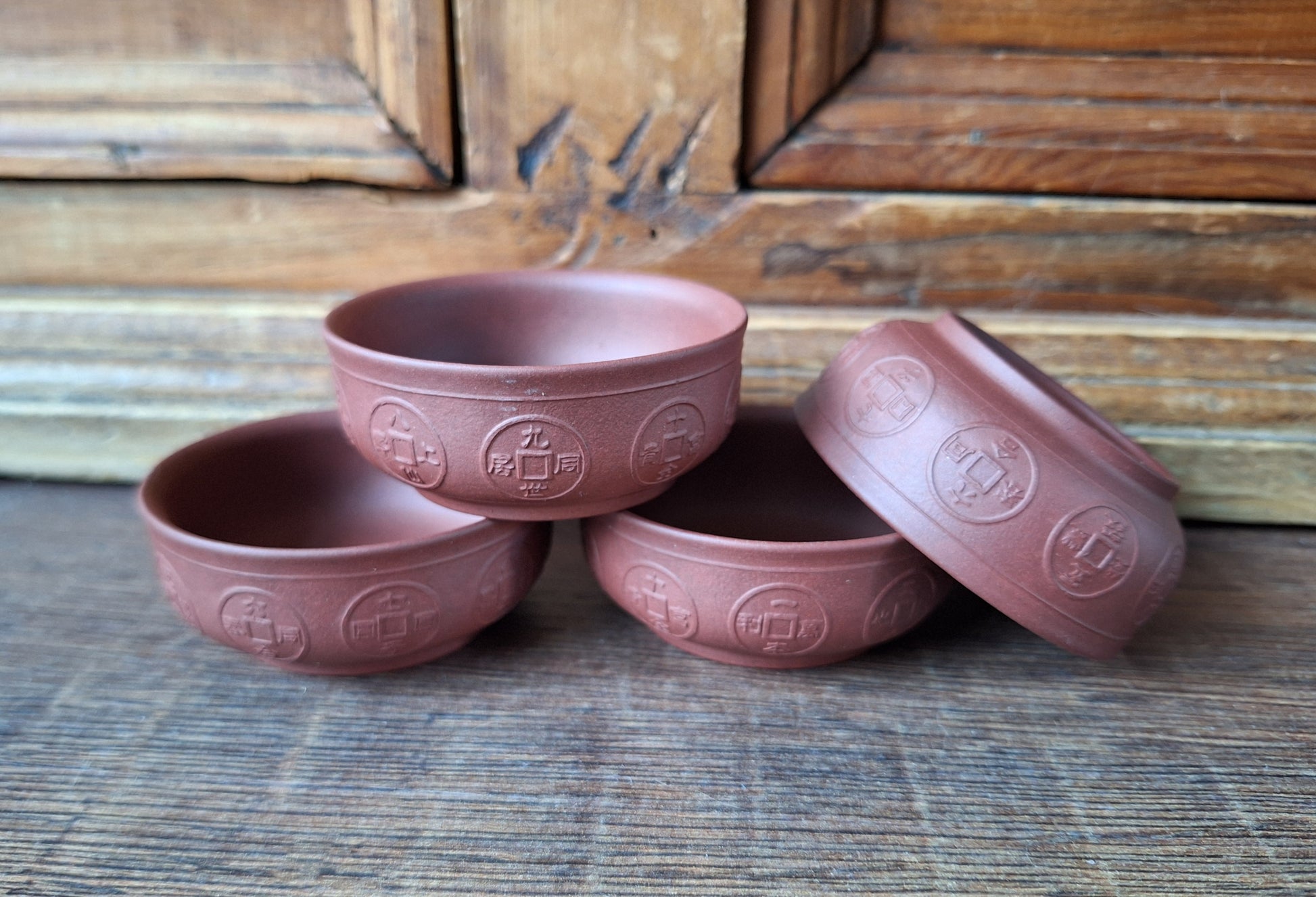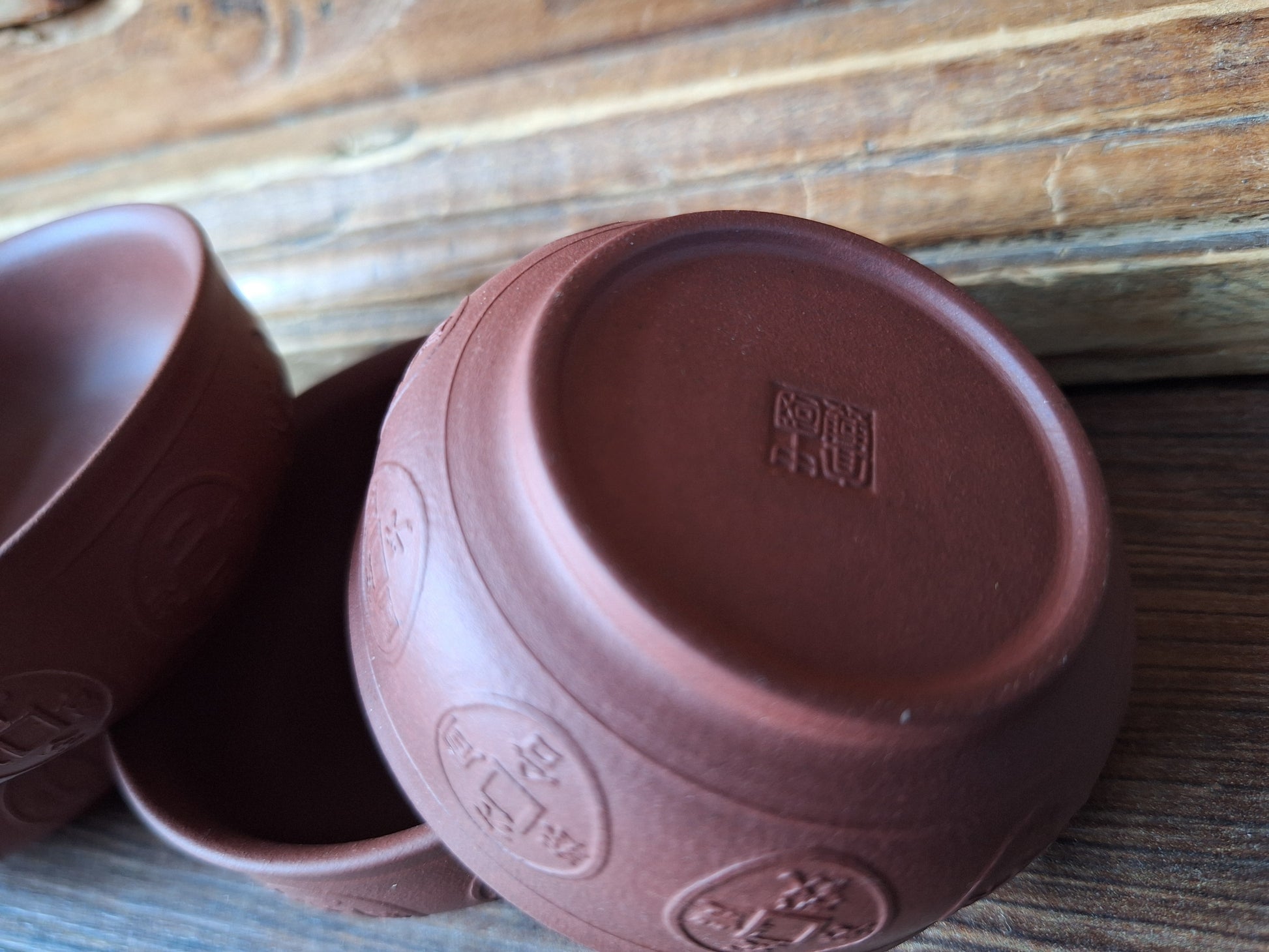 These cups here in our shop are made from yixing clay in a natural brown color and decorated with 'lucky coin' symbols that are most well-known from feng shui iconography and chinese characters that represent good fortune and wellbeing.