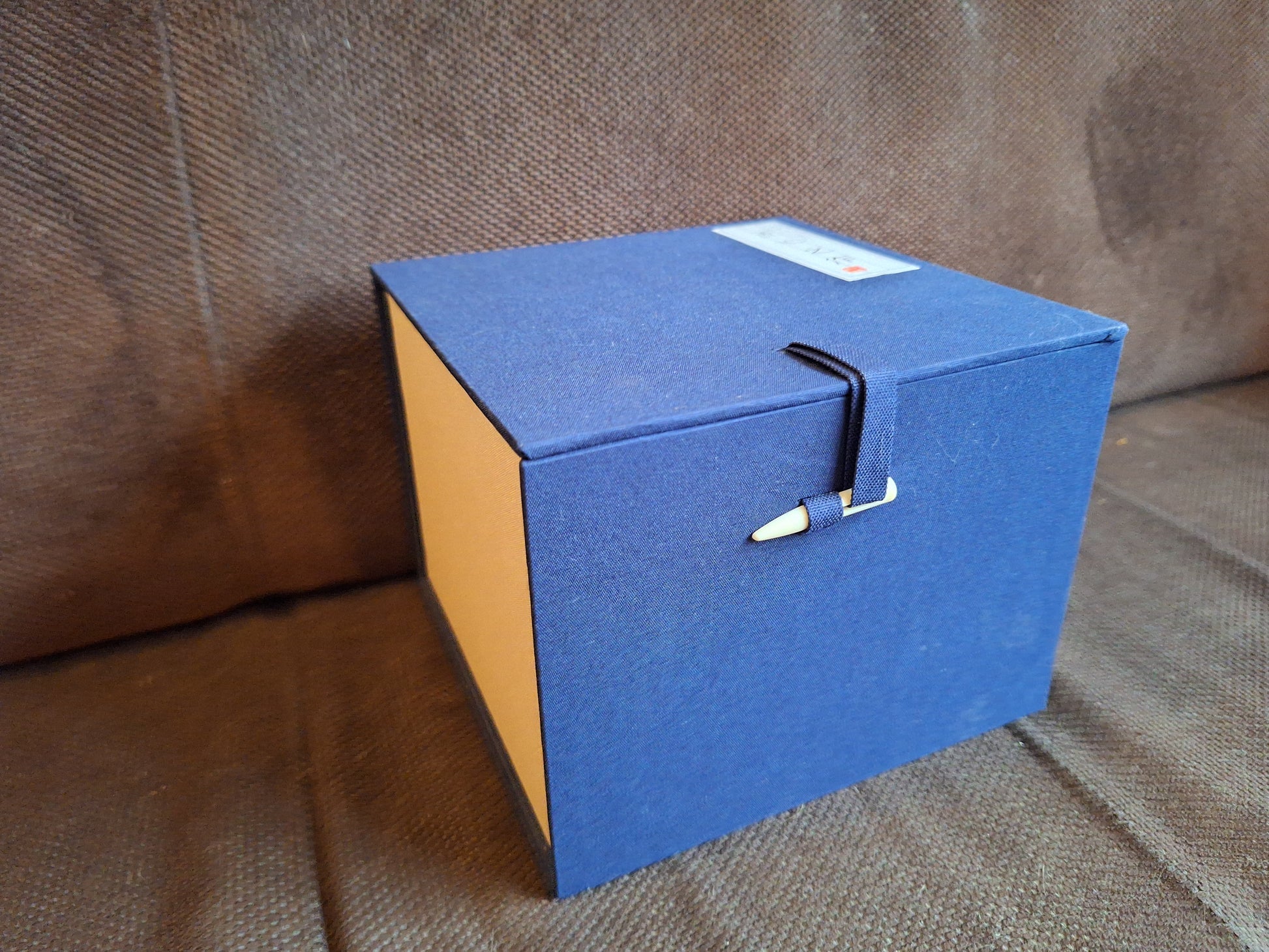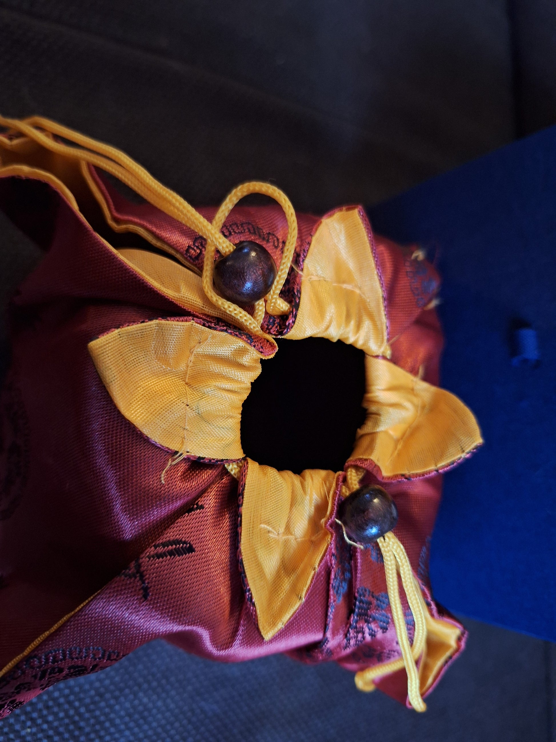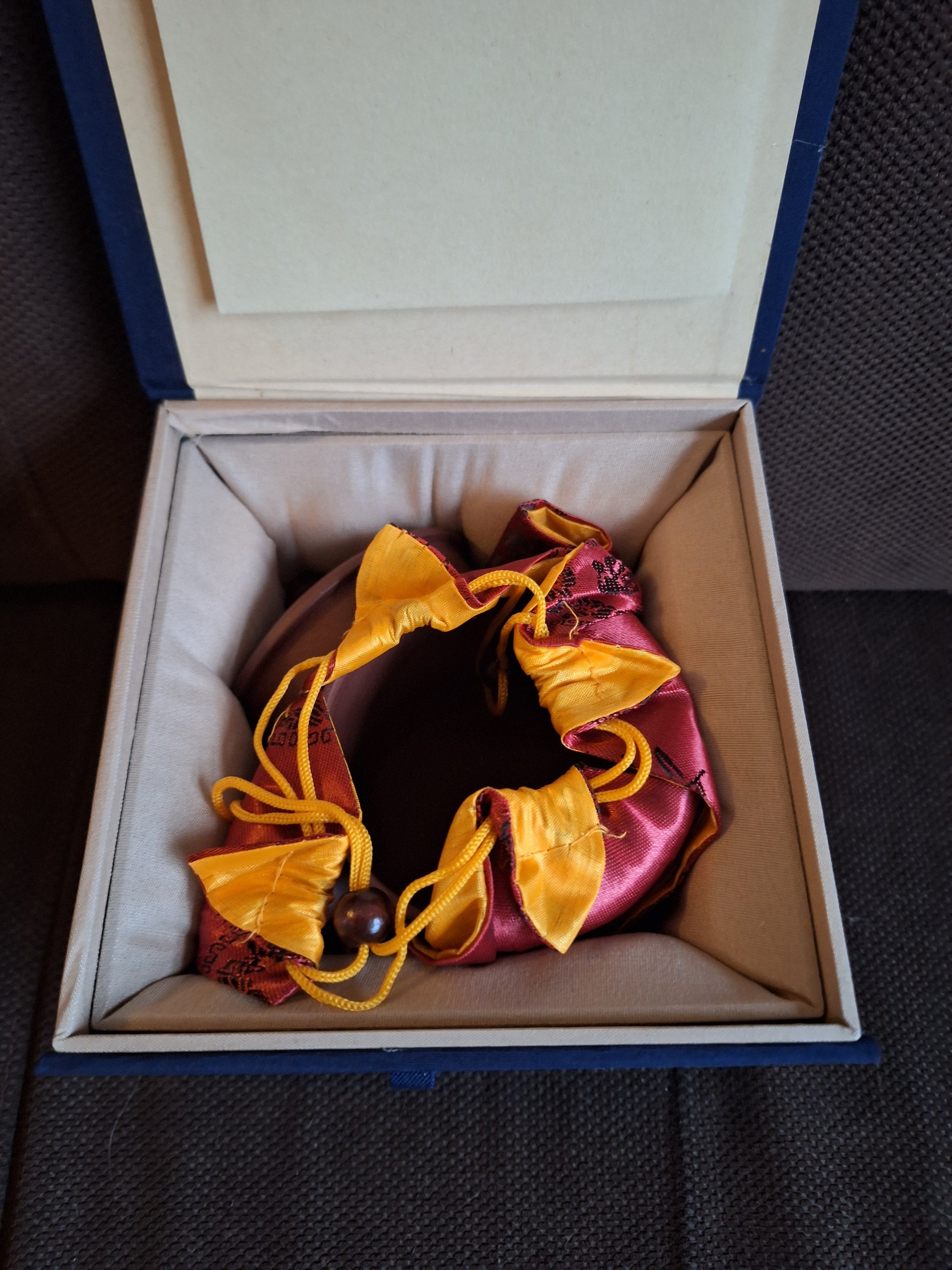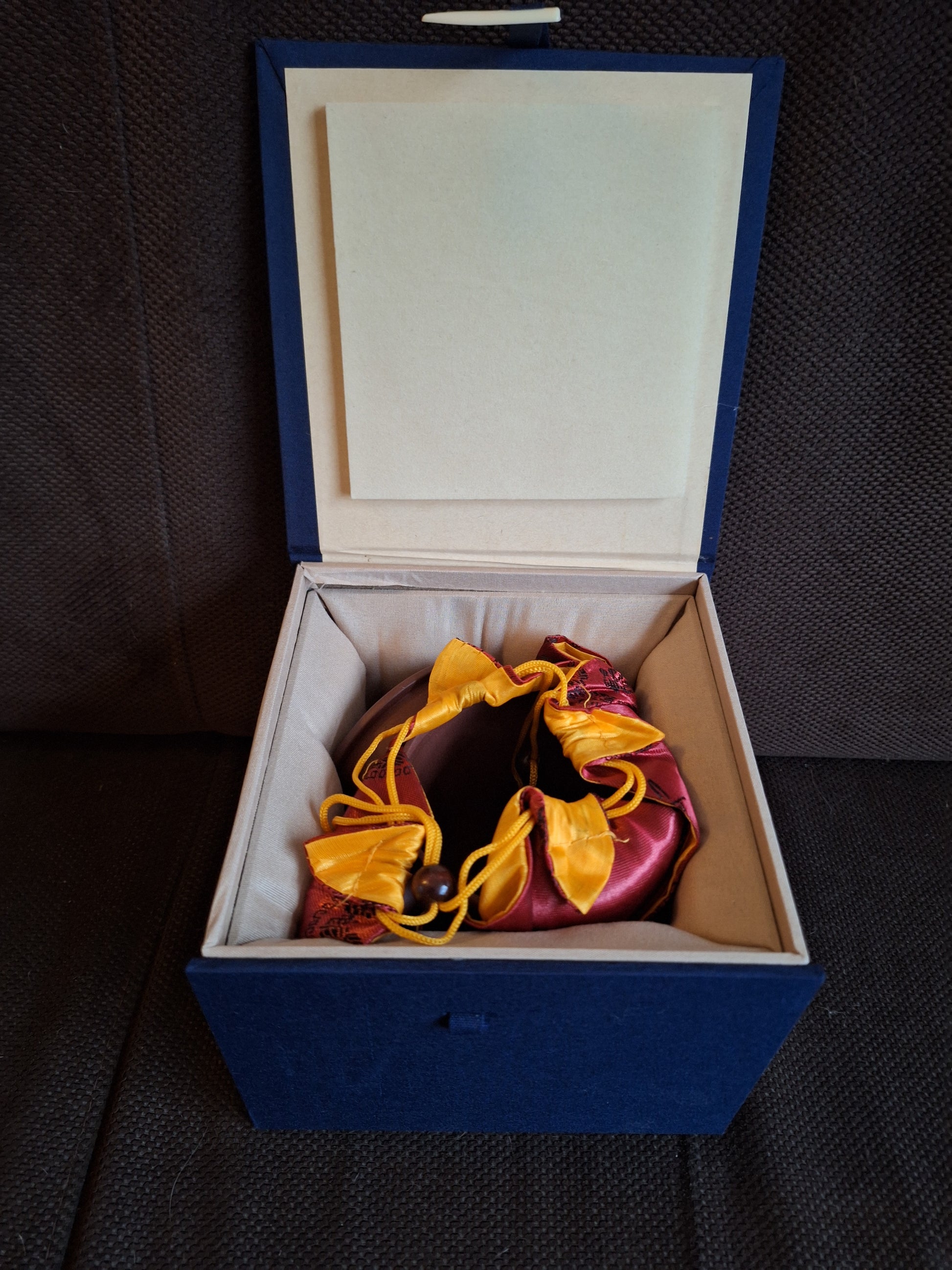 The mug and its lid have a decoration of bamboo leaves and come with a nice satin fabric pouch in a good padded box.